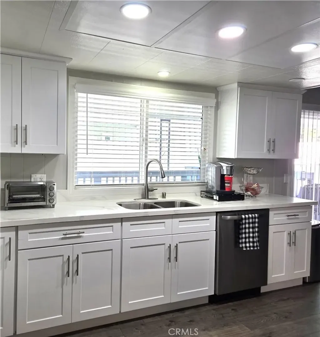 Senior living in La Habras Friendly Village features a charming 1971 mobile home with 2 bedrooms and 2 bathrooms, plus plenty of upgrades like a gorgeous open kitchen, newer windows, roof, and laminate flooring. The kitchen offers two pantries, a cooktop island with white Corian countertops, and recessed lighting. The master bedroom includes a bathroom with a tub and a makeup counter for getting ready in style. The laundry area leads to covered tandem parking, and a new furnace keeps the home cozy on cool nights. This move-in ready gem truly has it allmust see to appreciate.