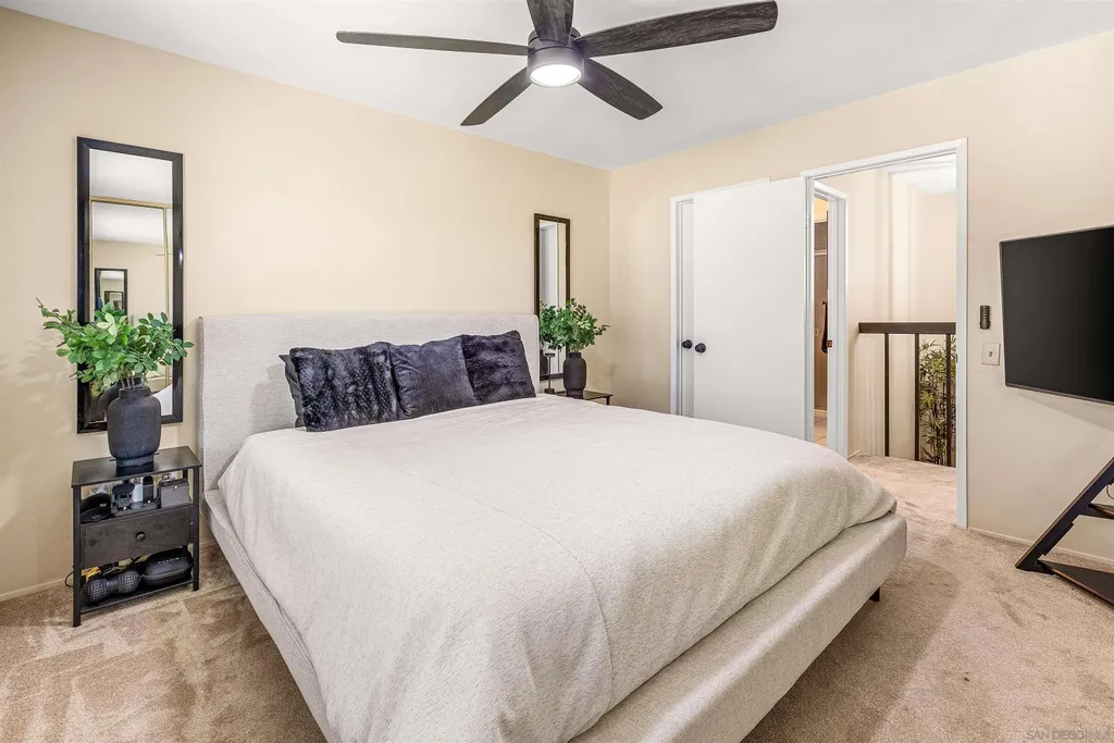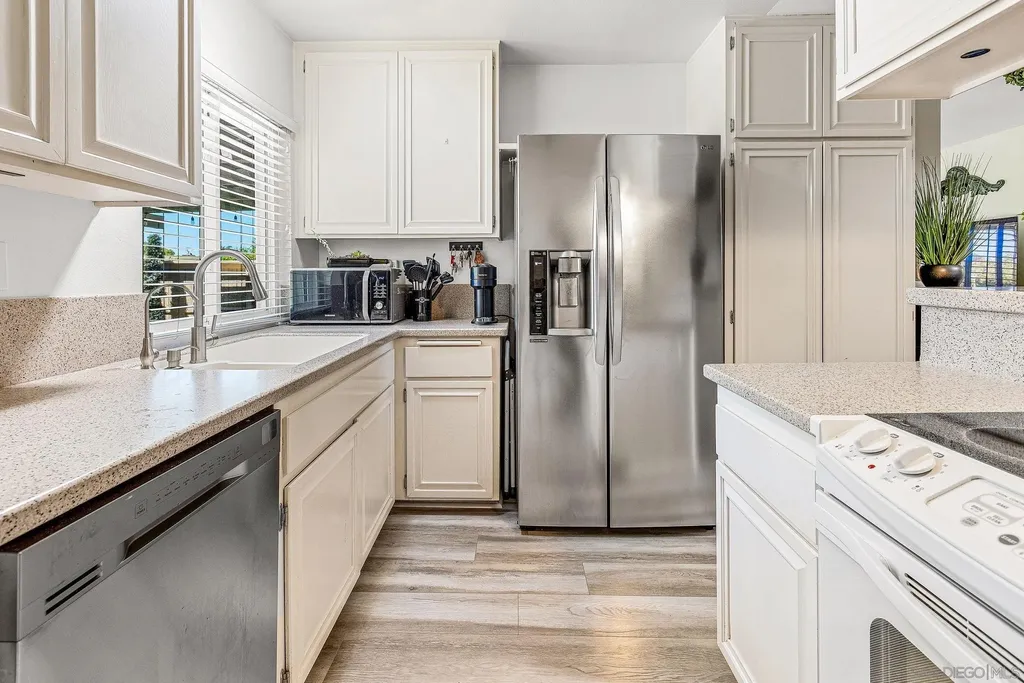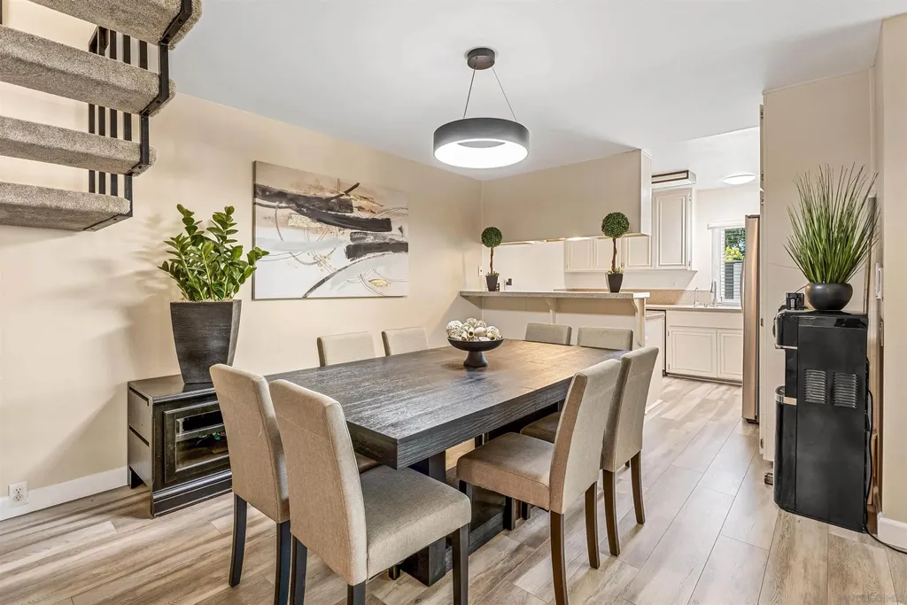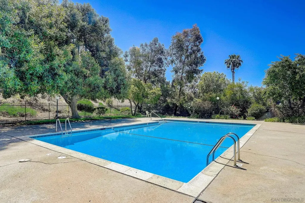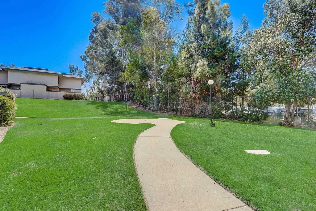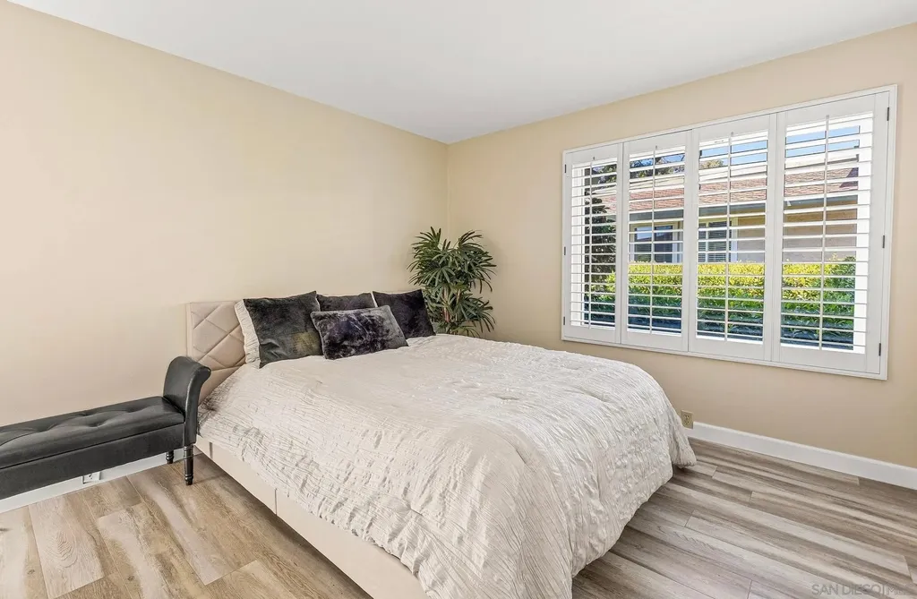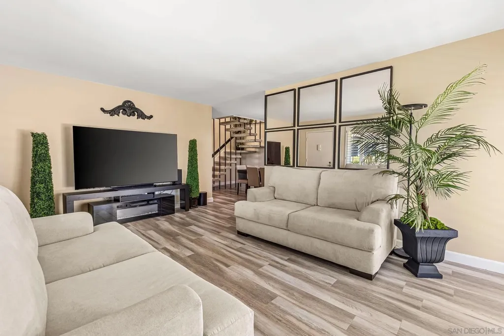 Welcome to this stunning townhome in the highly sought-after Quest Complex of Mira Mesa! Enjoy a premium, quiet location tucked away in the back corner of the community, surrounded by lush greenbelt views. Inside, the open-concept floor plan is enhanced with an A/C system, fresh interior paint, new carpeting, plantation shutters, designer lighting, and luxury vinyl plank flooring. The kitchen features crisp white cabinetry, Corian countertops, and convenient bar seating, while the spacious living room with a cozy fireplace flows seamlessly into the dining area. A downstairs bedroom and full bathroom offer added flexibility for guests or a home office. Meander outside to an expansive private patio - perfect for entertaining, relaxing, or dining al fresco - complete with a laundry closet for added convenience. Two assigned parking spots are located nearby. The community offers resort-style amenities with two swimming pools, two spas, and beautifully maintained park-like grounds. HOA dues include water, trash, and exterior landscaping. Ideally located close to freeways, Lake Miramar, schools including Miramar College, shopping, and dining - this home truly has it all!