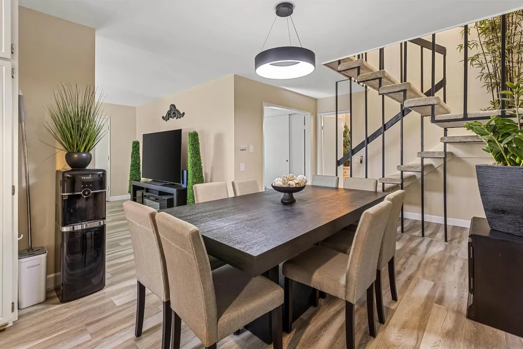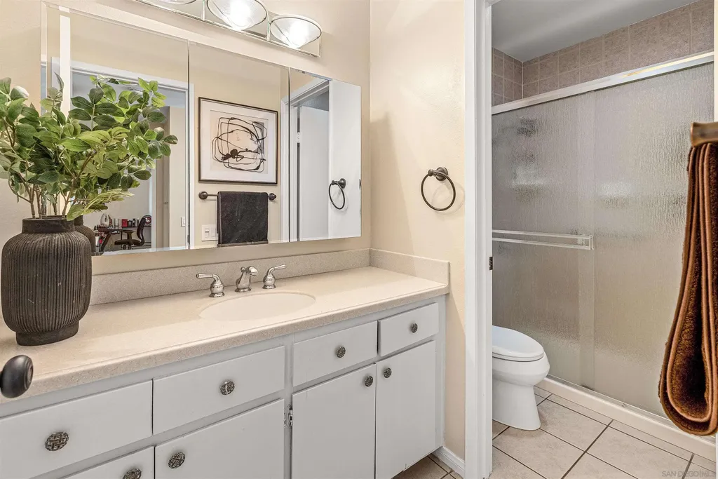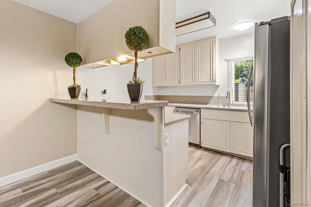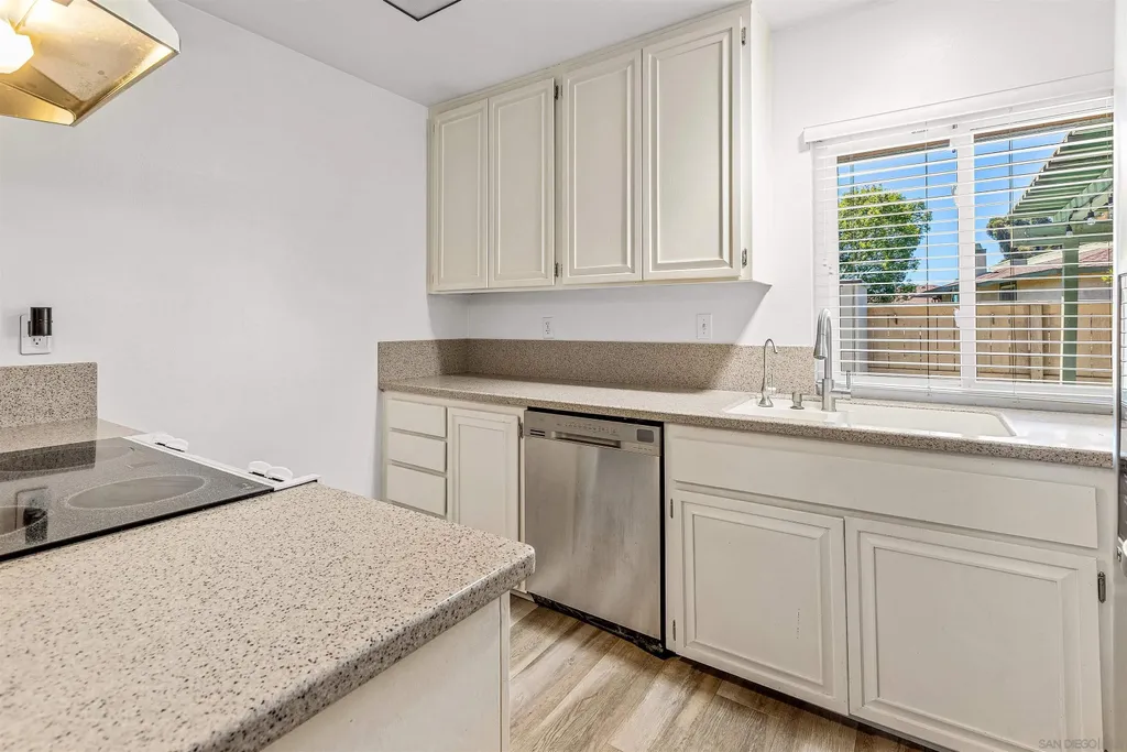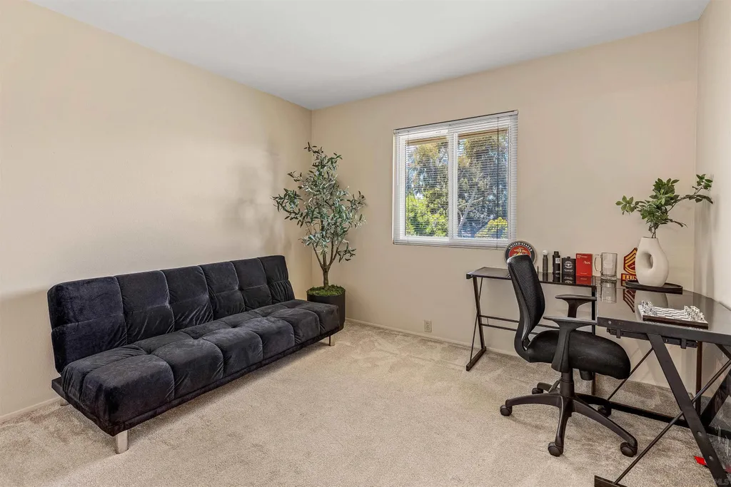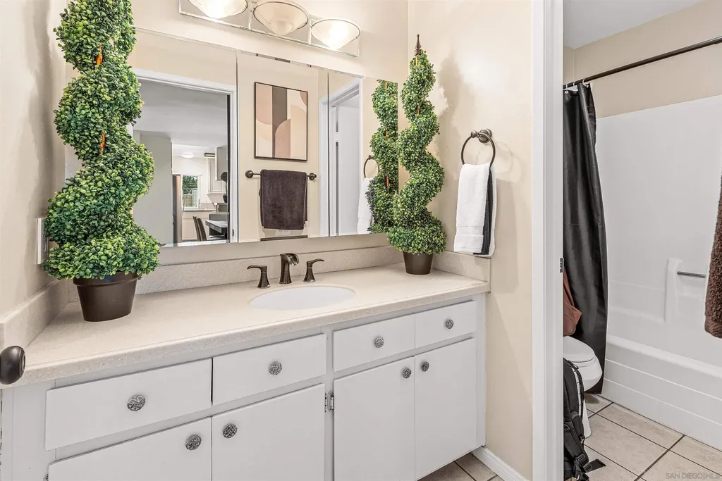 Welcome to this stunning townhome in the highly sought-after Quest Complex of Mira Mesa! Enjoy a premium, quiet location tucked away in the back corner of the community, surrounded by lush greenbelt views. Inside, the open-concept floor plan is enhanced with an A/C system, fresh interior paint, new carpeting, plantation shutters, designer lighting, and luxury vinyl plank flooring. The kitchen features crisp white cabinetry, Corian countertops, and convenient bar seating, while the spacious living room with a cozy fireplace flows seamlessly into the dining area. A downstairs bedroom and full bathroom offer added flexibility for guests or a home office. Meander outside to an expansive private patio - perfect for entertaining, relaxing, or dining al fresco - complete with a laundry closet for added convenience. Two assigned parking spots are located nearby. The community offers resort-style amenities with two swimming pools, two spas, and beautifully maintained park-like grounds. HOA dues include water, trash, and exterior landscaping. Ideally located close to freeways, Lake Miramar, schools including Miramar College, shopping, and dining - this home truly has it all!