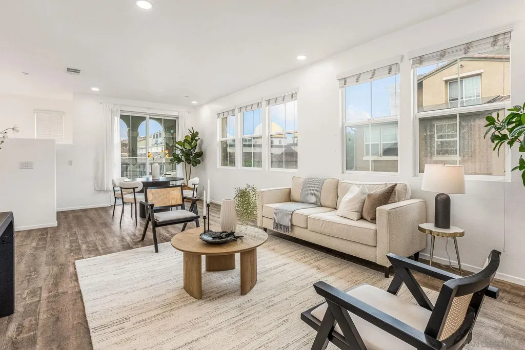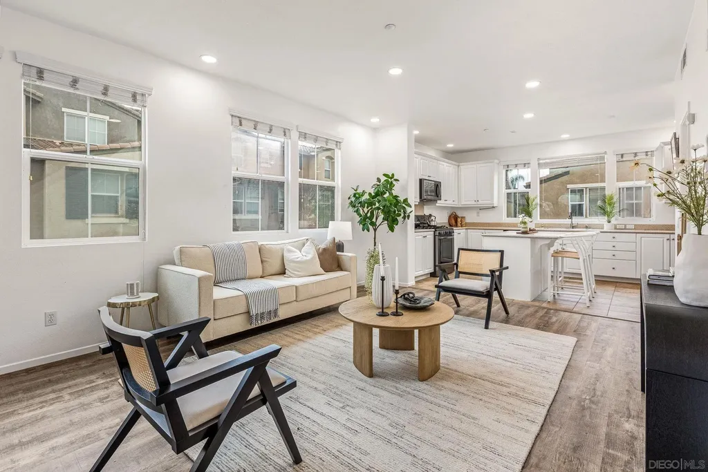 Beautiful, assumable, end-unit townhome in the gated Morningside community of Santee! This light-filled three-story home offers a bright and open floor plan with luxury vinyl plank flooring and a spacious kitchen featuring a large center island - perfect for cooking and entertaining. Enjoy your own private balcony, ideal for relaxing outdoors. The thoughtfully designed layout includes an attached two-car garage, laundry, and entry on the ground floor; an open-concept living area with a half bath on the second level; and two generously sized bedrooms on the top floor, each with its own full bathroom. The primary suite offers comfort and privacy with ample closet space. Additional features include a highly sought-after double-sided garage with separate entrances and extra storage. The Morningside community offers resort-style amenities including a pool, spa, BBQ area, and playground. Conveniently located close to shopping, schools, and with easy freeway access - plus, the complex is FHA and VA approved. This is a home you won't want to miss!