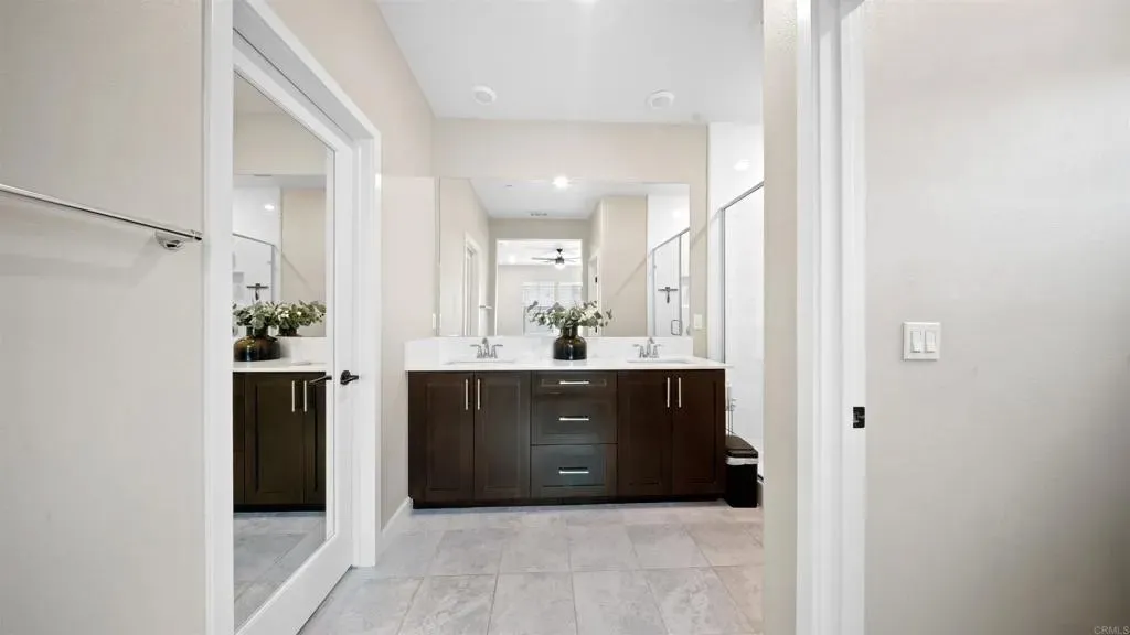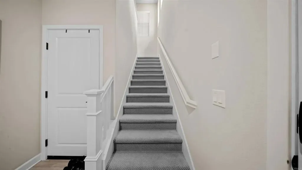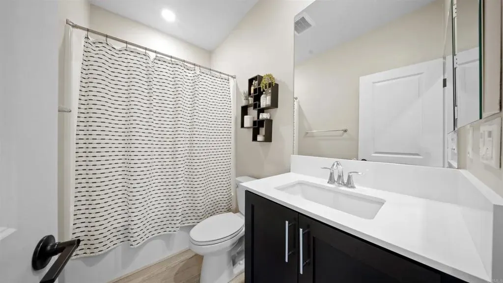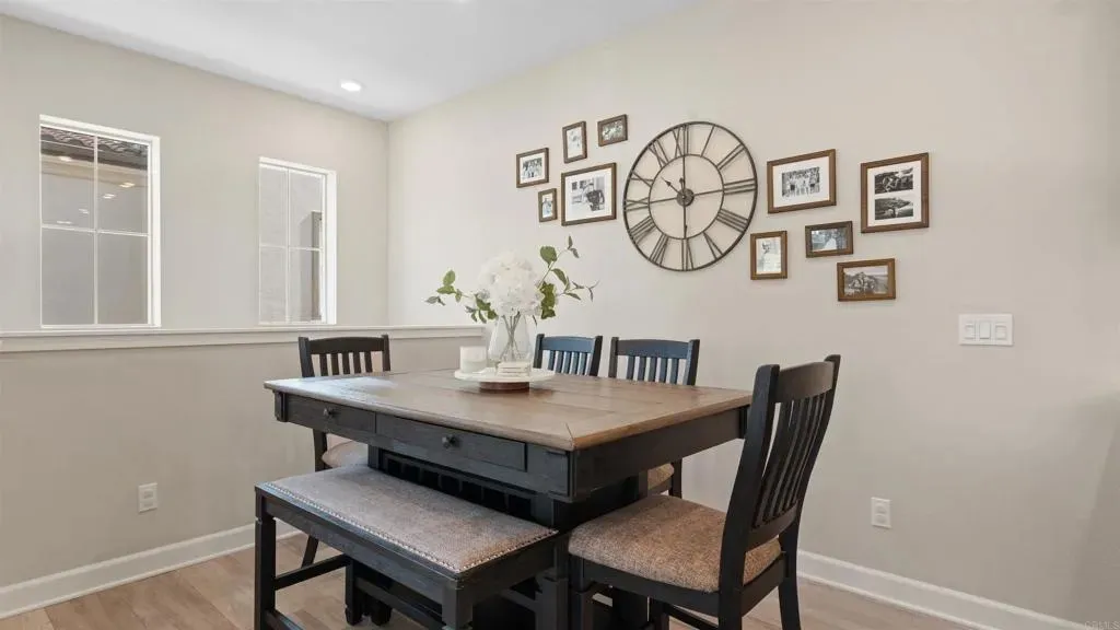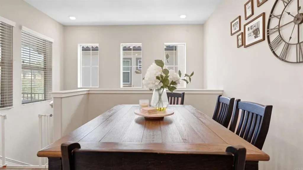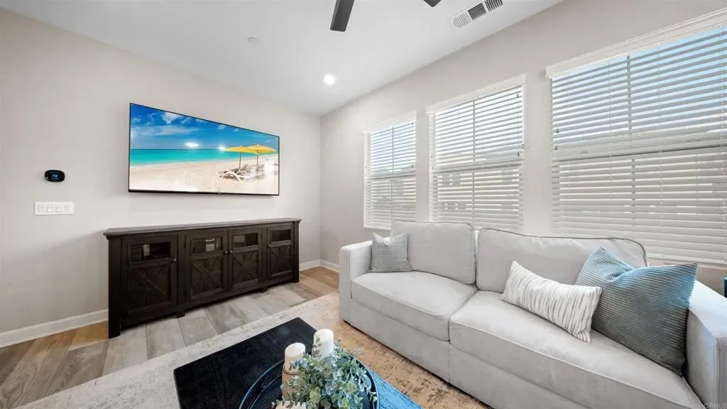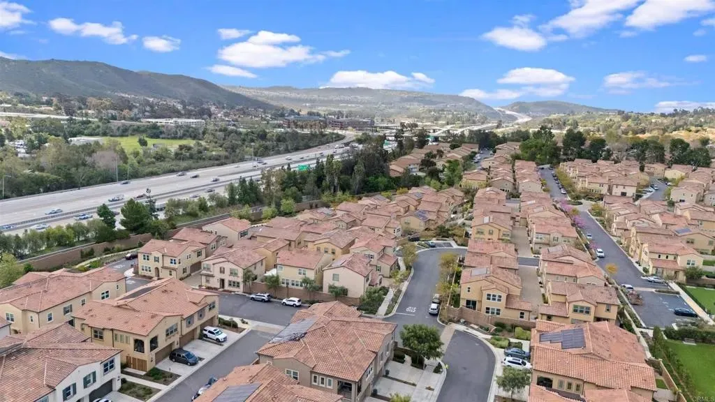 Sellers have recently enclosed the flex room into a third bedroom! Welcome to 10861 Blake Way, a solar energy powered retreat zoned in the award winning Poway School district & conveniently located close to I-15 in Rancho Peasquitos. This beautifully designed energy efficient home offers 1,454 square feet of thoughtfully crafted living space. Featuring three inviting bedrooms and two contemporary bathrooms, every detail is curated for modern living. Upon entering, you are greeted by high ceilings and recessed lighting that create a bright and airy ambiance. The home showcases a harmonious blend of carpet, tile, and laminate flooring, accommodating diverse styles. A dining alcove provides the perfect space for shared meals, while a private entrance adds a touch of exclusivity to your living experience. The primary ensuite is an oasis of comfort, complete with a separate shower and elegant double sink. Practicality meets style with a dedicated laundry area featuring a washer and dryer. Enjoy the efficiency of dual pane windows, and the convenience of an attached garage alongside available street parking. Relax on the charming porch or enjoy the communal pool, making this home an excellent choice for modern, comfortable living.