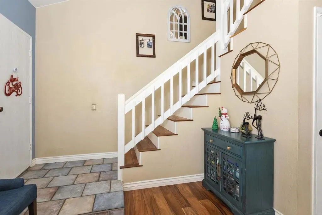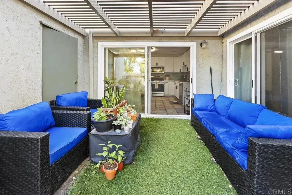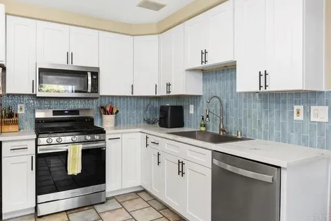 Gorgeous FHA/VA approved 3 bed/1.5 bath townhome in the highly sought-after community of Villa Martinique. HOA includes Fire Insurance, Water, Trash, use of Tennis courts, swimming pool, and grounds maintenance. Welcome home to this beautifully updated 1250sqft model. Highlights include; a first floor bedroom, remodeled kitchen with new cabinets and stunning Calcutta Gold quartz countertops, engineered wood flooring in living area and bedrooms with tile flooring in kitchen and bathrooms. The half bath and laundry closet with full size washer/dryer is centrally located on first floor. Upstairs youll find a full bath with separate vanity adjacent to the Primary Suite and the third bedroom. Central Air was replaced in 2020. Two reserved parking spaces (1) covered and (1) open are located just a short walk to your patio/back door. Great outdoor space with stylish Alumawood patio cover-known for durability and low maintenance. Enjoy relaxing on your patio with a cup of coffee, gardening, or grilling with friends. The complex boasts miles of walking trails with a scenic canyon view. Walking distance to Tierrasanta Elementary -offering a highly coveted Spanish immersion program, DePortola Middle School & Canyon Hills High. This home is a must see!