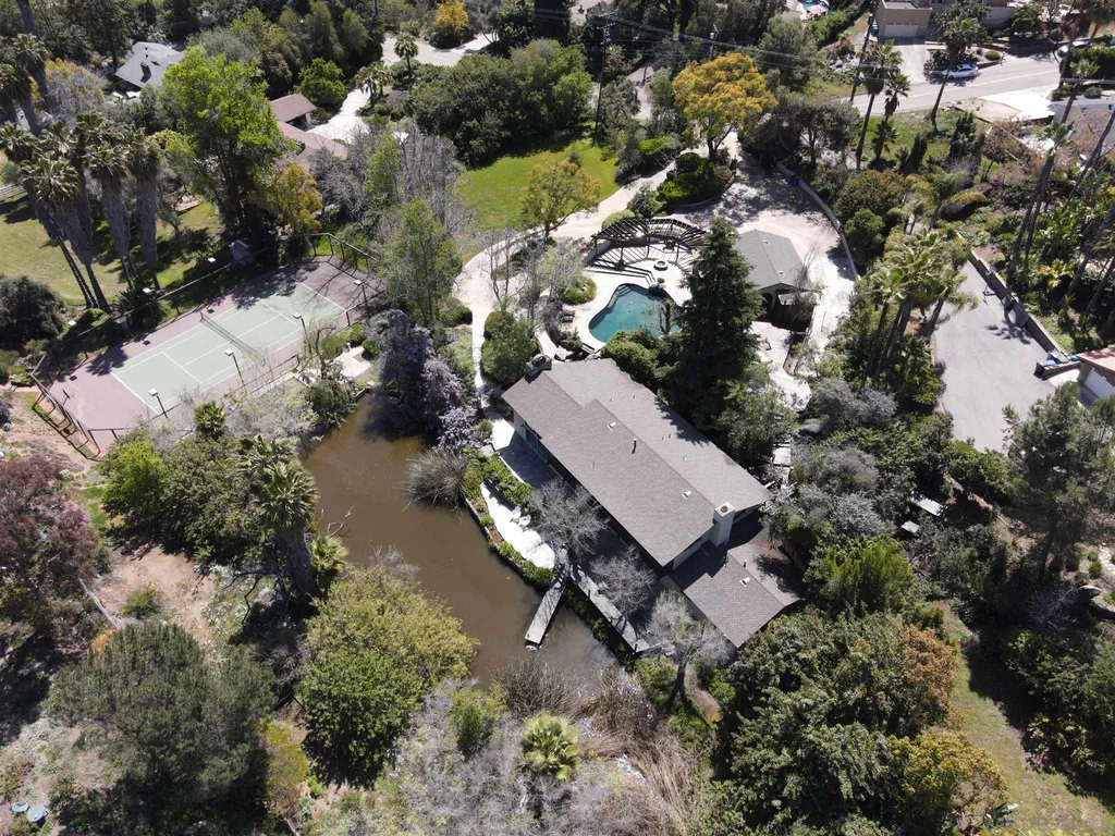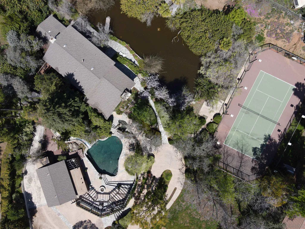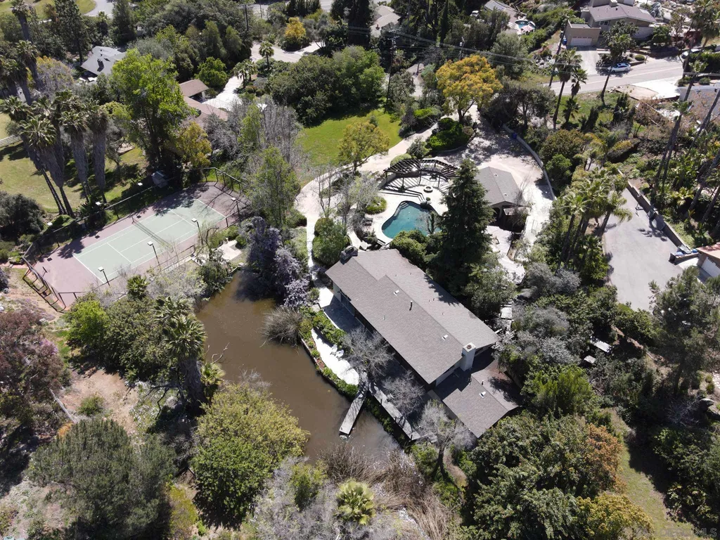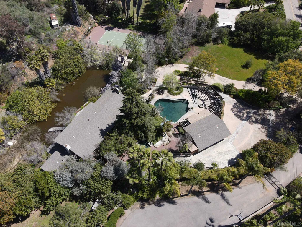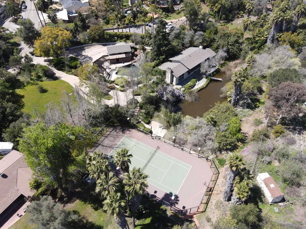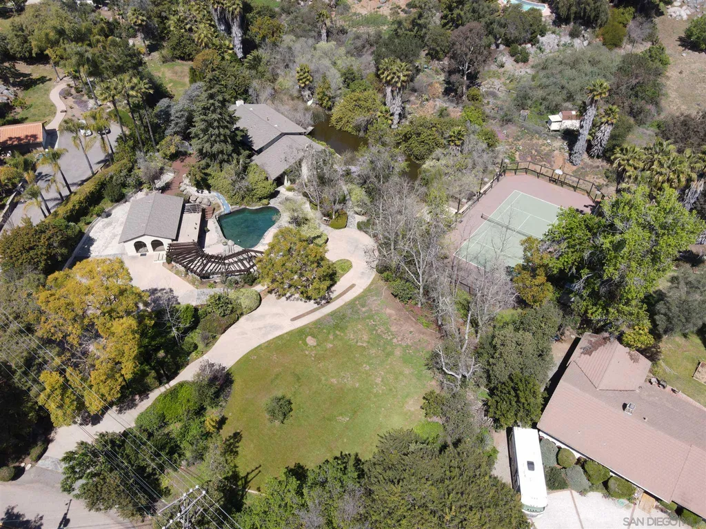 Spacious (3456 sq ft) Mt Helix home features..Quiet location (1.9 acres), lighted Tennis Court, Private Lake, Sparkling swimming pool- slide down tiled water slide into the pool!.. Private bubbling spa..Separate barbecue entertainment area..3 Car garage with workshop area + room to park an additional 10+ cars and RV parking... 5 Bedroom Monterey Revival styled home..Double door entry opens to entertainment size living room featuring 20ft vaulted ceilings + wall of glass overlooking home's private lake.. Bright and light spacious kitchen with stainless steel appliances + Additional dining area.. Bonus room downstairs is an ideal office, den or for extended family (features bedroom, full bath+additional separate living area).