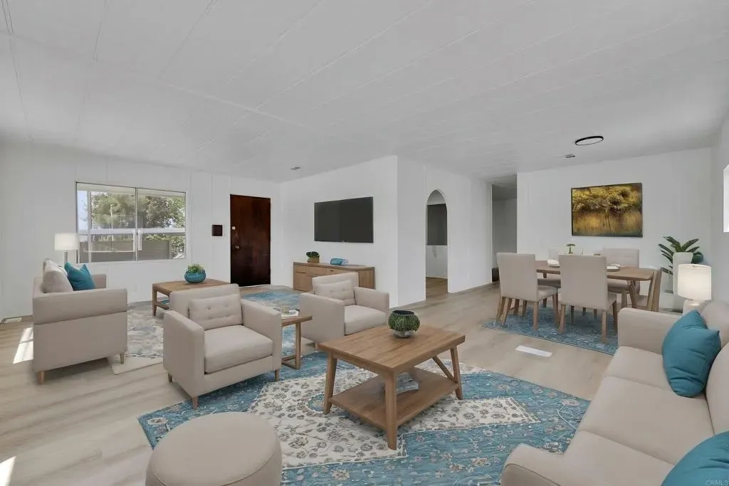 Highly motivated seller! This is your opportunity to own in San Diego County under $150,000! The spacious and bright home is located in the coveted 55+ Pepperwood Park Community! The home features brand newer water heater, newer furnace, LVP flooring throughout, brand new kitchen with shaker cabinets and silver hardware, brand new dishwasher and stove, newer bathroom in hallway, newer carpet in bedrooms, sunroom and exterior steps, and new interior and exterior paint. Carport is located in front of home for covered parking. Current space rent is $1,313 and trash service is billed separately. Community features beautiful club house, pool, spa/hot tub, and lush, green and mature landscaping. Located near shopping, restaurants, entertainment and close to freeway access for easier commute times. This is your chance to call this perfect cozy retreat home today!
