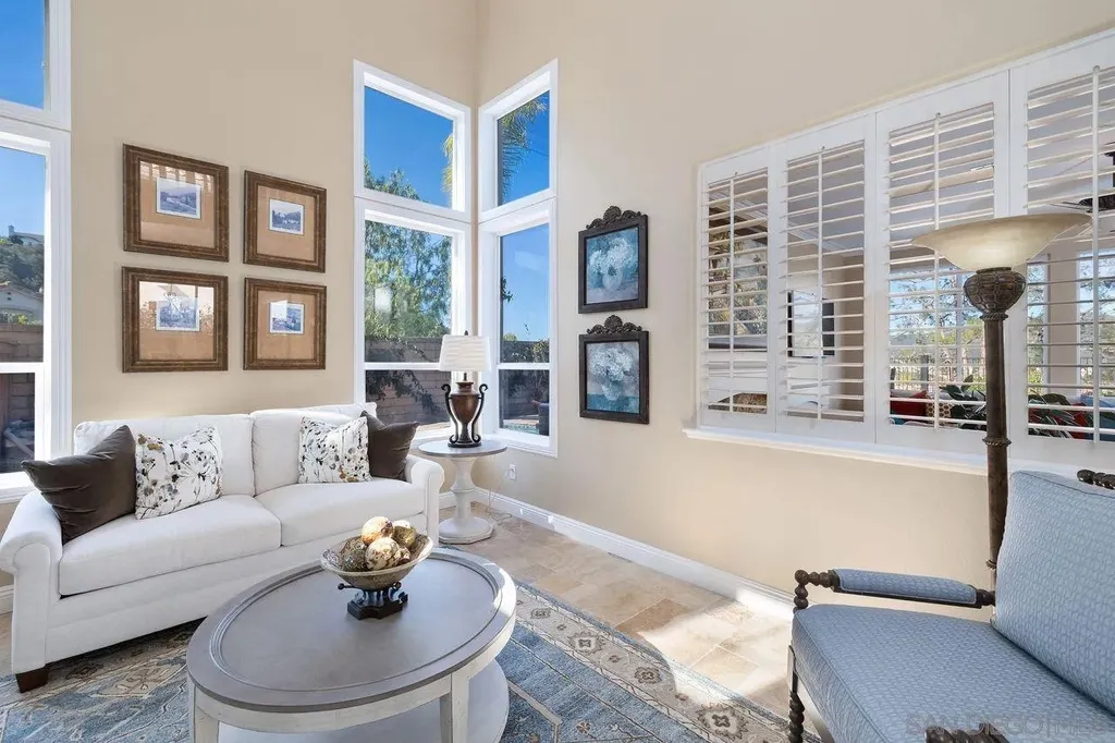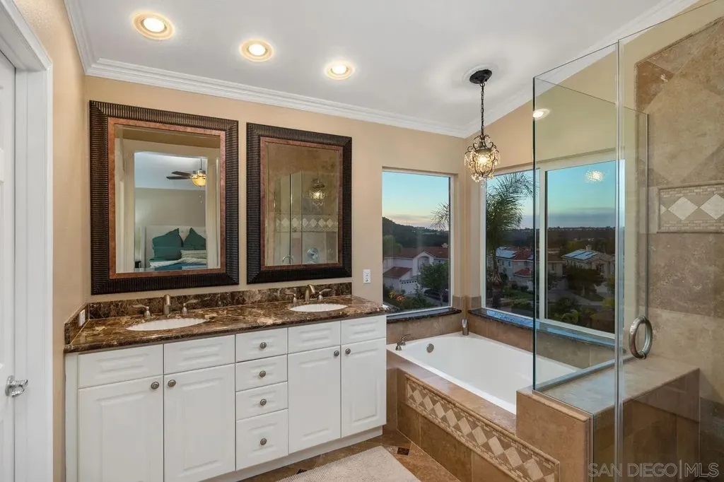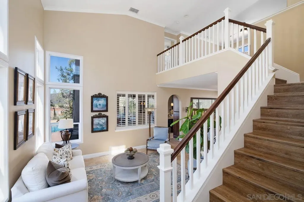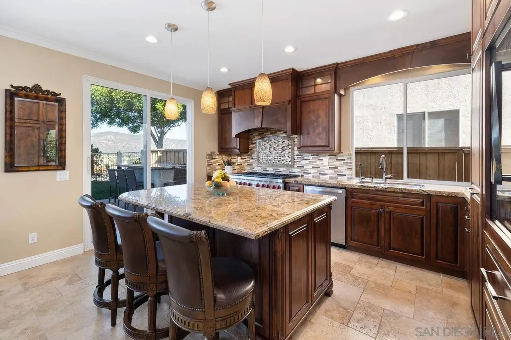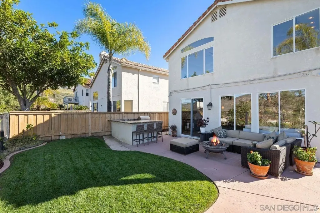 Welcome to this beautifully upgraded corner-lot home in the highly desirable Sabre Springs community. This stunning residence features 3 bedrooms + loft, 2.5 bathrooms, and 2,036 sq. ft. of living space, all enhanced by incredible panoramic views. Pride of ownership is evident throughout every thoughtfully remodeled space. The chef's kitchen has been completely updated with a large sit-up island, custom cabinetry, built-in Sub-Zero refrigerator and wine refrigerator, granite countertops, glass tile backsplash, stainless steel appliances, and an impressive Wolf 8-burner gas range with double oven. Additional features include slow-close cabinets and a built-in microwave. The spacious primary suite offers vaulted ceilings, crown molding, a ceiling fan, mirrored closed doors and walk-in closet with built-ins from California Closets, and a beautifully upgraded primary bath with double sinks, a walk-in shower with glass door, and a separate soaking tub. The home's elegant dining room includes custom built-in cabinets with frosted glass doors, granite counters, and a custom built-in mirror. Step outside to your private entertainer's backyard, complete with sweeping views, a sparkling pool and jacuzzi, and a built-in BBQ with barstool seating perfect for hosting gatherings or relaxing in your own retreat. Hall bathroom as double sinks, tub/shower, and wainscoting. Secondary bedrooms with ceiling fans, crown molding, and California Closets built-ins. Newer heating and A/C system, including updated ducting and newer attic insulation.