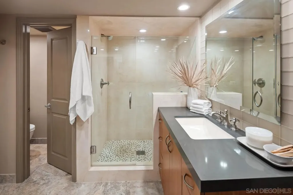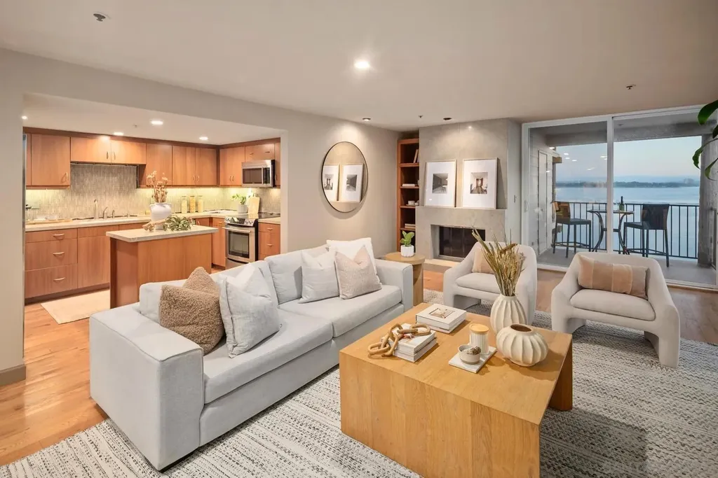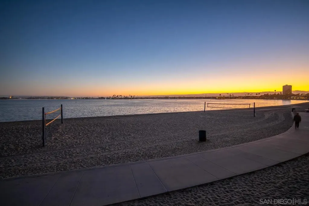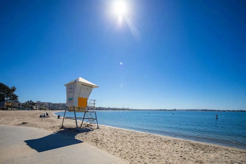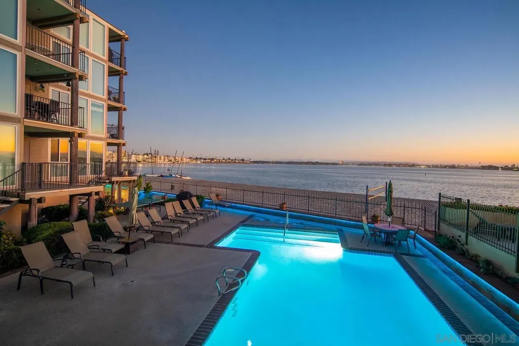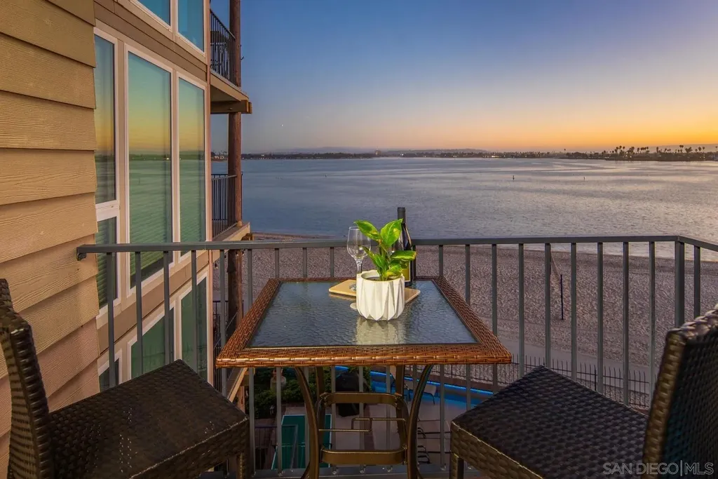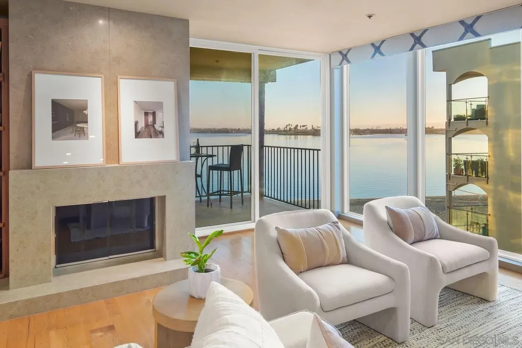 Experience luxurious bay front living in this beautifully upgraded residence featuring breathtaking panoramic views of Sail Bay with direct access to the sand. Embrace the dream coastal lifestyle in this two bedroom, two bathroom condo, where you can relax on your private balcony and take in captivating views of the sparkling bay, saltwater pool and spa, and glowing sunsets. The gourmet kitchen features limestone countertops, custom cabinetry, and premium stainless steel appliances. The primary en-suite and hall bath are both luxuriously appointed with quartz countertops, custom tile, and marble flooring and showers. A large built-in desk adjacent to the dining room provides an ideal workspace. Additional upgrades include reclaimed oak wood flooring, cozy fireplace, floor to ceiling windows, bar area with beverage fridge, cedar lined California Closets, new LED lighting, and Lutron lighting controls. Enjoy the convenience of a full size washer and dryer tucked away in a spacious storage closet with built in shelving. Additional features include 1 assigned underground parking space with storage locker, community bike storage, and storage closet on the private balcony. Enjoy the Sail Bay lifestyle with instant access to bike or stroll along the boardwalk, paddle board or sail right from your doorstep, and lounge in the beachfront saltwater pool and spa. Ideally located near local restaurants, shops, Fanuel Street Park, and just blocks to Pacific Beach, this exceptional home offers a perfect blend of serenity, luxury, and premier bay front living in an unbeatable location.