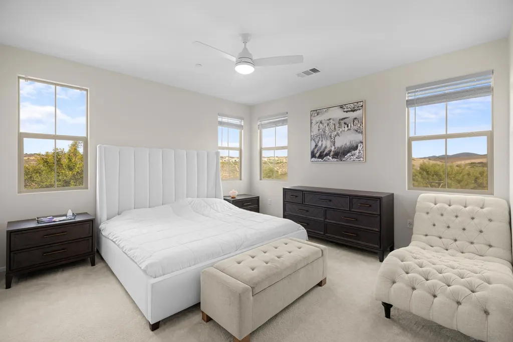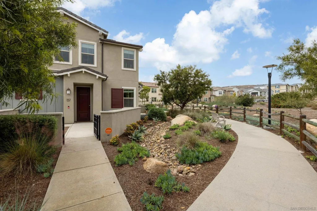 Experience life in the Village of Escaya. Positioned in one of the community's most desirable locations this corner townhome offers panoramic canyon and trail views along with rare privacy and no homes in front. Natural light fills the home and unobstructed eastern exposure delivers stunning sunrises. The open floor plan includes a spacious great room a family room upstairs and well sized bedrooms including a primary suite with a generous bathroom and walk in closet. This home has been very well maintained and thoughtfully upgraded with modern lighting 18 leased solar panels an EV charging station and a tankless water heater. Residents enjoy resort style amenities including a pool gym clubhouse parks trails and a new school. The nearby village center offers shops and restaurants providing the perfect blend of convenience and modern living.