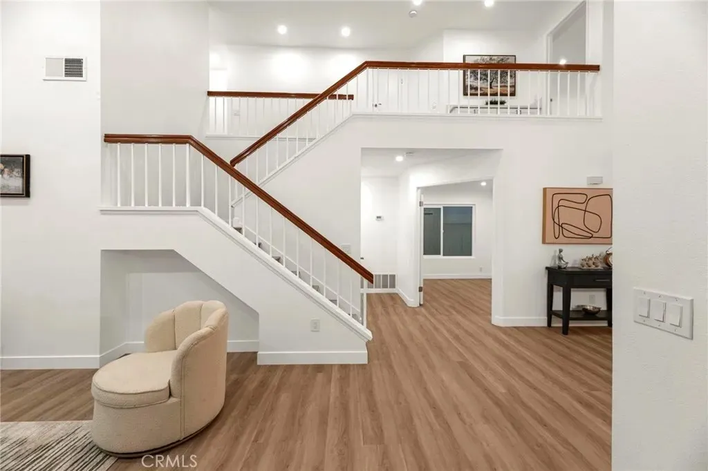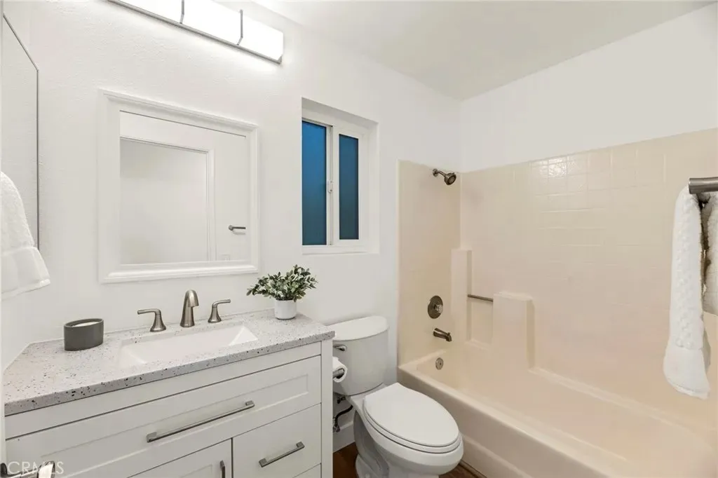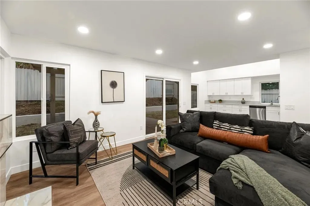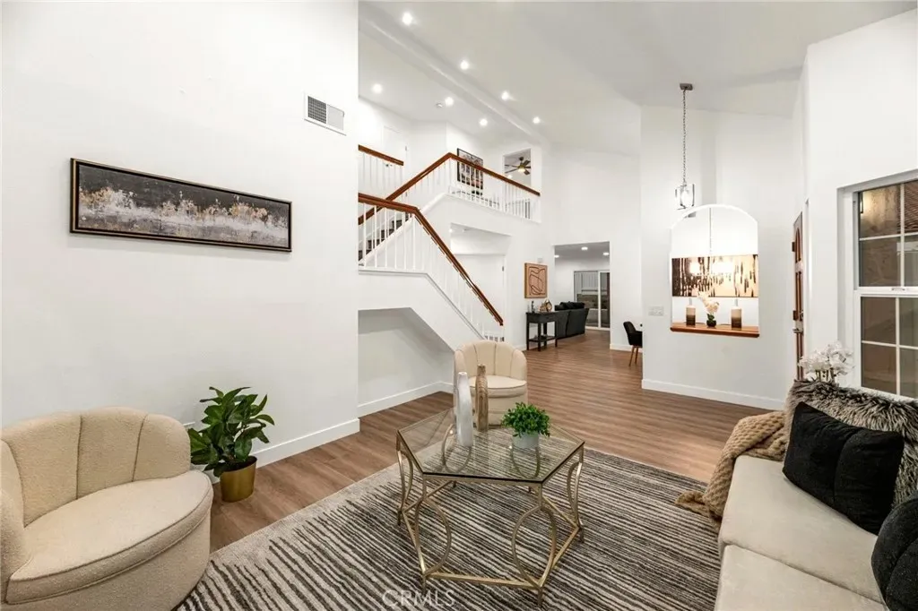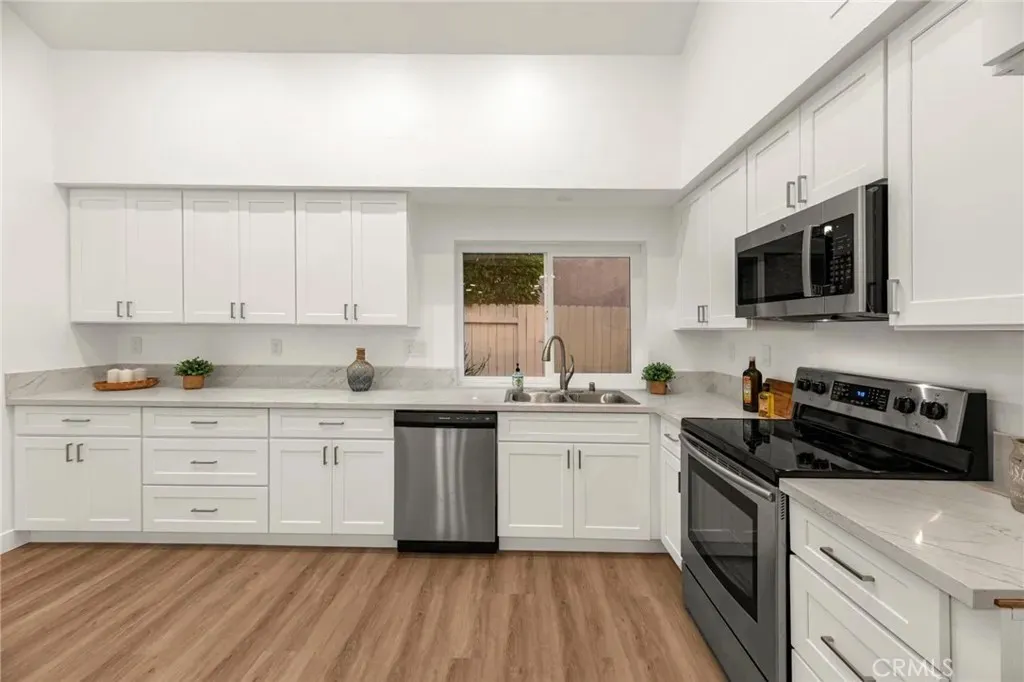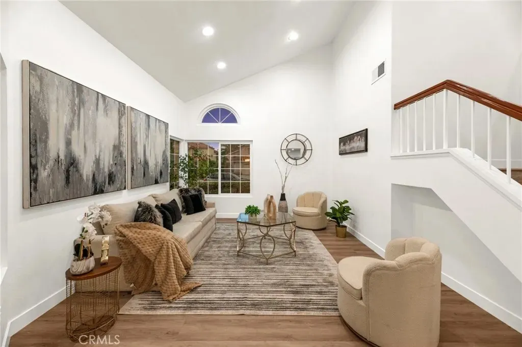 Stunning Fully Remodeled 4-Bedroom, 3-Bath Home in Coveted Park Village! Step into style and comfort in this beautifully updated home located in the highly sought-after Park Village neighborhood. From the moment you enter, youll be greeted by soaring vaulted ceilings and an abundance of natural light that accentuates the open, airy floor plan. The formal living room flows seamlessly into the separate dining area, all enhanced by the newly upgraded luxury vinyl plank flooring throughout. The fully remodeled kitchen is a showstopperfeaturing crisp white cabinetry, matching quartz countertops, brand-new stainless steel appliances, and vaulted ceilings that add to the sense of space. It overlooks the spacious family room, where a stone-faced fireplace creates a cozy focal point and a large sliding glass door opens to the private backyard. Ideal for multigenerational living or guests, the main floor includes a full bedroom and a full bath. Upstairs, you'll find two additional guest bedrooms with ceiling fans and ample closet space, along with the generous primary suite. The primary retreat boasts a deep walk-in closet, dual vanity sinks, a large soaking tub, and a separate shower. The backyard offers privacy and relaxation, complete with an Aluma-wood patio cover, grassy area, retaining wall, and freshly painted fencingperfect for entertaining or unwinding. Additional upgrades include: all-new dual-pane windows, newer roof, recessed lighting throughout, fresh interior paint, upgraded baseboards and hardware, modern appliances and so much more! Located in a quiet, family-friendly community with excellent schools, low HOA, no Mello-Roos, and a prime locationthis home is the total package. Dont miss your chance to own this picture-perfect gem!