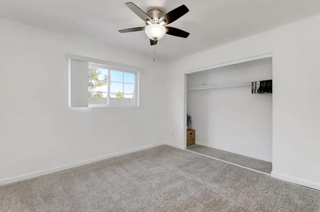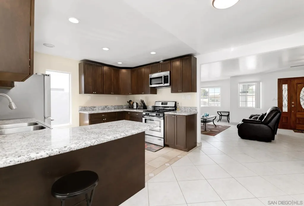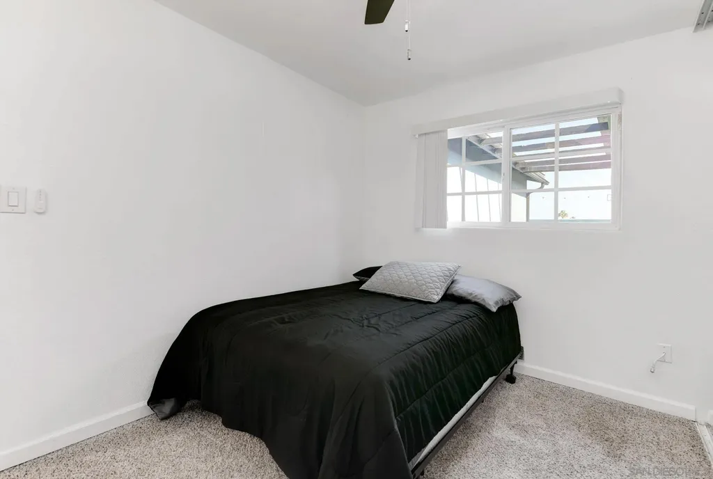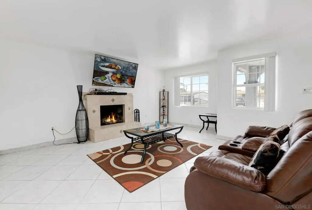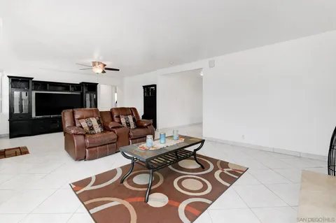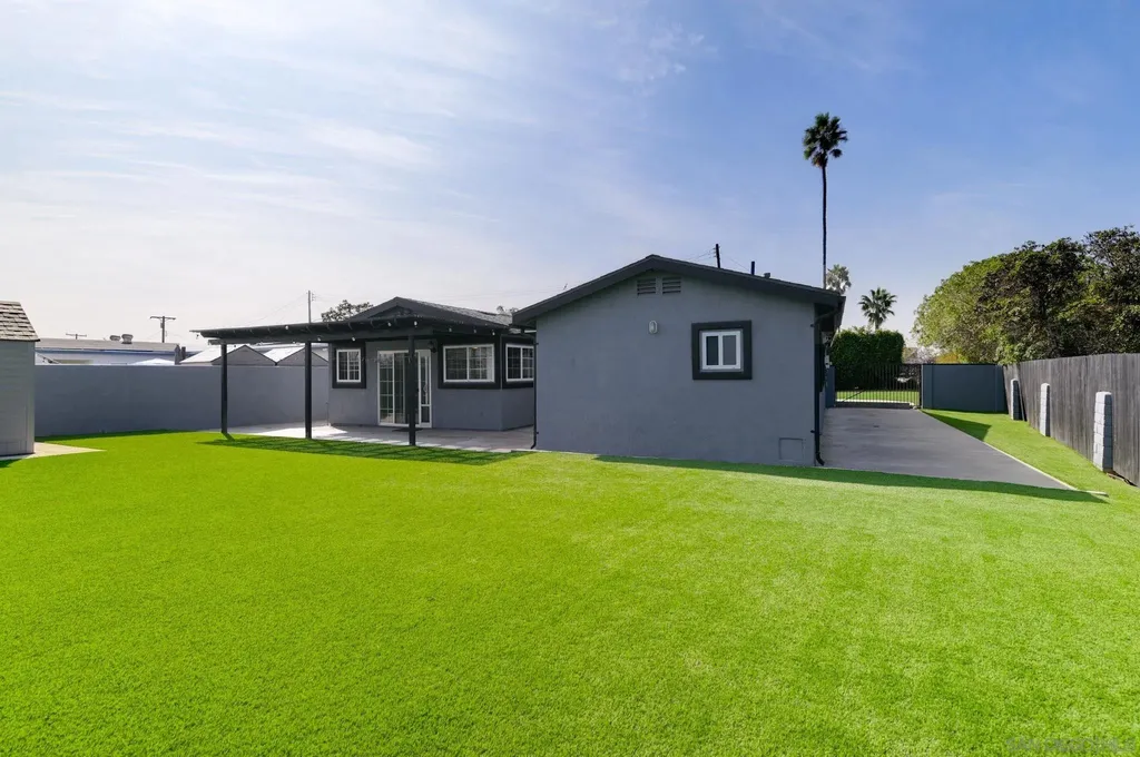 ENTERTAINERS DELIGHT!! Single-story 1,710 sq ft home on a quiet cul-de-sac tip, set back from the main road. 1261 Helix is planted on a flat street, but the rear property line sits above a bluff with 180 unobstructed views - city lights at night, neighborhood below, and wide-open sky by day. The back yard is huge and tailor made for a good kickback, a birthday or a Superbowl party. Inside: dual-pane vinyl windows and sliding doors throughout. Tile floors in kitchen, living, and traffic areas; carpet in bedrooms. Every room has a new ceiling fan with remote. Large living room with oversized fireplace. Open kitchen features granite counters, stainless steel appliances, and direct sightlines to living and dining spaces - ideal for hosting. Dedicated laundry room. Full interior and exterior repaint completed. Outside: fully gated with rolling front gate. Wide main driveway plus separate RV driveway runs full length of the house to rear patio. Back patio is poured concrete with pergola cover. Entire front and back yards upgraded with pet-grade artificial turf - dense, durable, and low-maintenance, stays bright year-round. 6-ft wood privacy fencing encloses the full perimeter. Leased solar panels cover 100% of the current owners' annual electric bill. Location balances seclusion with access: minutes to I-805, shopping, and daily needs in Chula Vista, yet traffic noise is minimal. Practical, updated, and positioned for views, parking, and privacy. VA approved all day. The perfect mid sized Single Family Home at a great price.