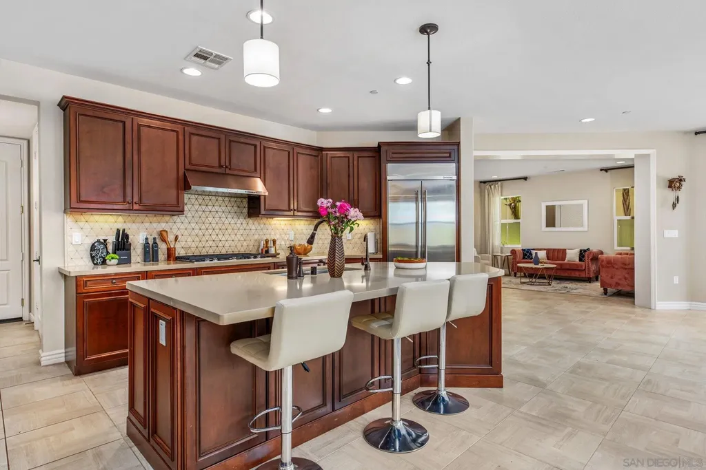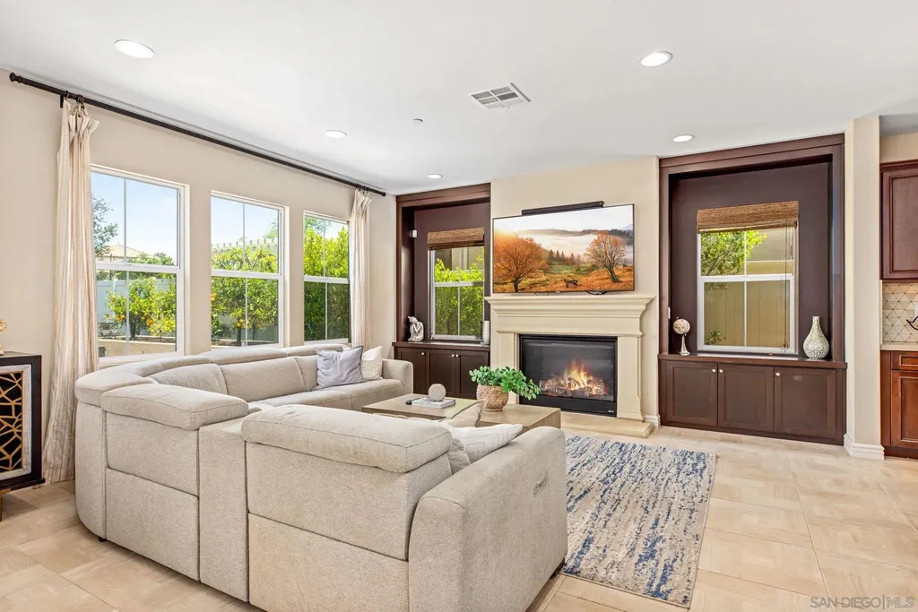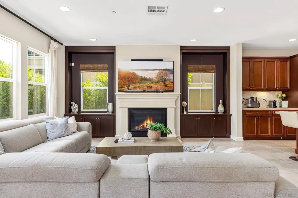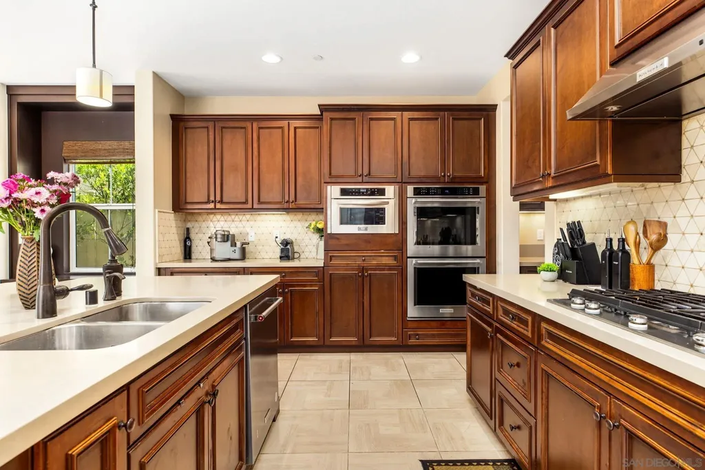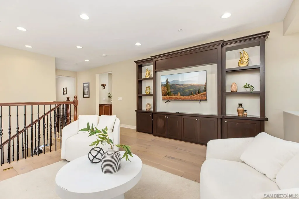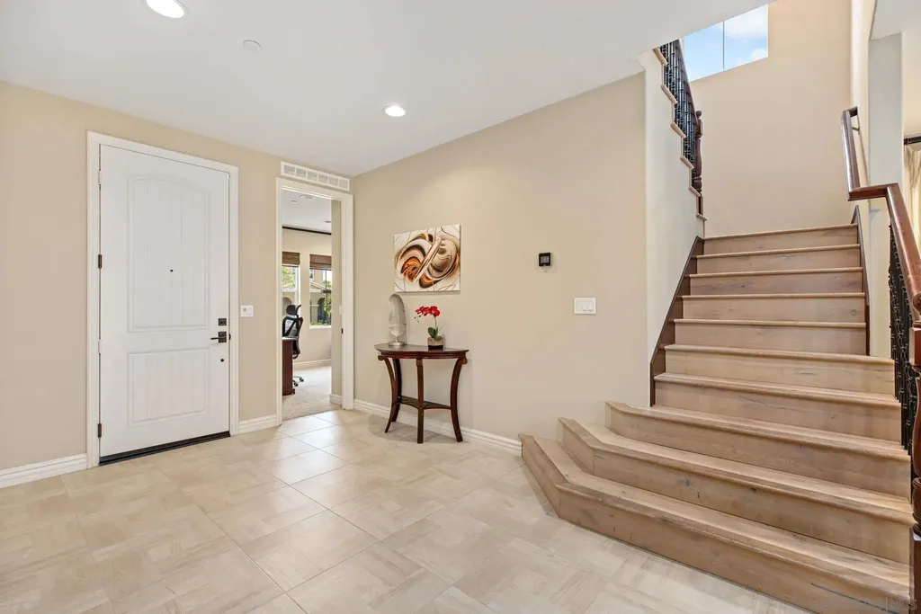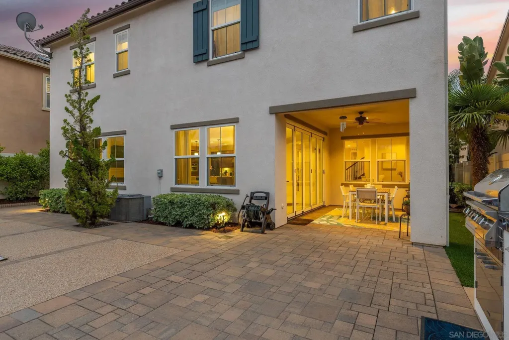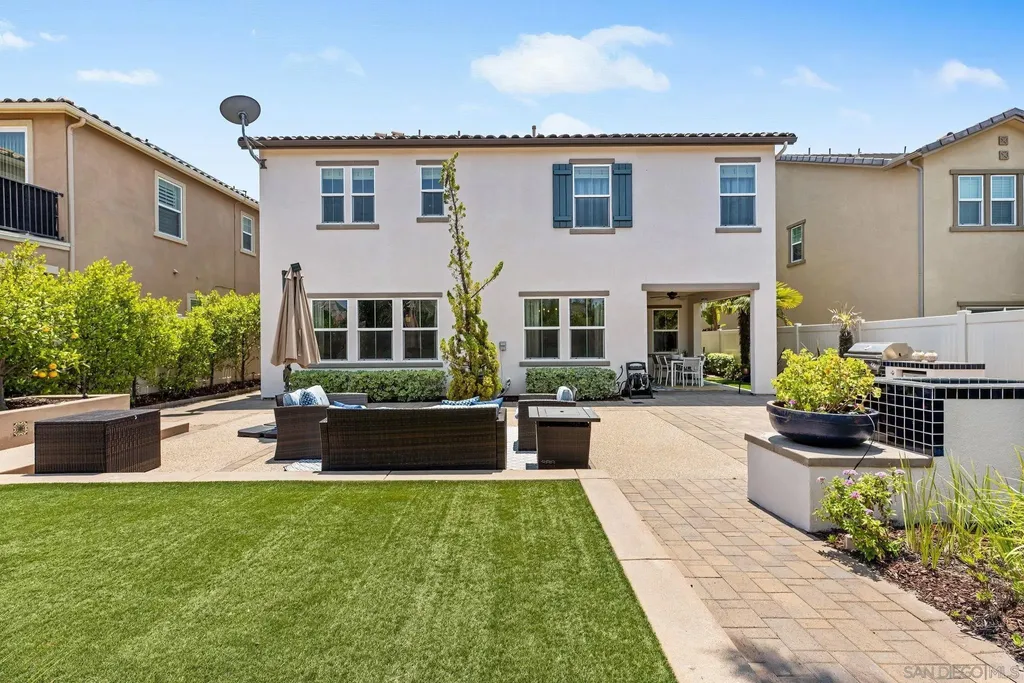 Priced to Sell! Welcome to 12712 Cloudbreak Ave - a former model home that blends thoughtful design with canyon views, smart upgrades, and space to grow. Nestled in the desirable Sea Cliff community and served by the award-winning Poway Unified School District, this 5-bedroom + loft, 4.5-bath residence offers 3,600 sq ft of beautifully maintained living space on a 6,144 sq ft lot. Inside, the open, sun-splashed layout showcases hardwood floors, designer finishes, and custom built-in cabinetry in the living room, loft, and bedrooms - including both primary closets. Every bedroom features a walk-in closet, and the home shows remarkably little wear. The chef's kitchen is the heart of the home, boasting quartz countertops, a large center island, high-end Moen plumbing fixtures, top-tier appliances, and a walk-in pantry. A first-floor bedroom with en-suite bath adds flexibility for guests, multigenerational living, or a private office. Upstairs you'll find four additional bedrooms, a versatile loft, and a spacious primary suite with luxe finishes and abundant built-in storage. Fresh paint, pristine carpeted bedrooms, and a whole-house water softener with reverse-osmosis drinking water elevate everyday comfort. Slide open the 5-panel accordion doors to a canyon-facing backyard oasis - no rear neighbors, just serenity. Enjoy a tranquil fountain, low-maintenance artificial turf, a covered California Room with surround-sound speakers, modern lighting, and fruit trees that add a sweet touch of nature. It's perfect for al-fresco dinners, weekend hangouts, or stargazing nights. Practical perks include a tankless water heater, Tesla charger, and whole-house speaker system - and best of all, no Mello-Roos tax. Built in 2016 with timeless upgrades and practical luxury, this move-in-ready home is minutes from top schools, parks, and freeway access. Discover the perfect blend of style, comfort, and canyon tranquility at 12712 Cloudbreak Ave.