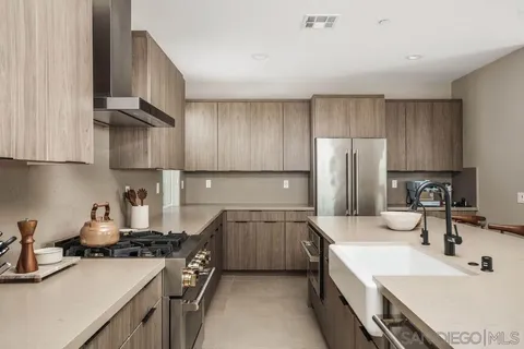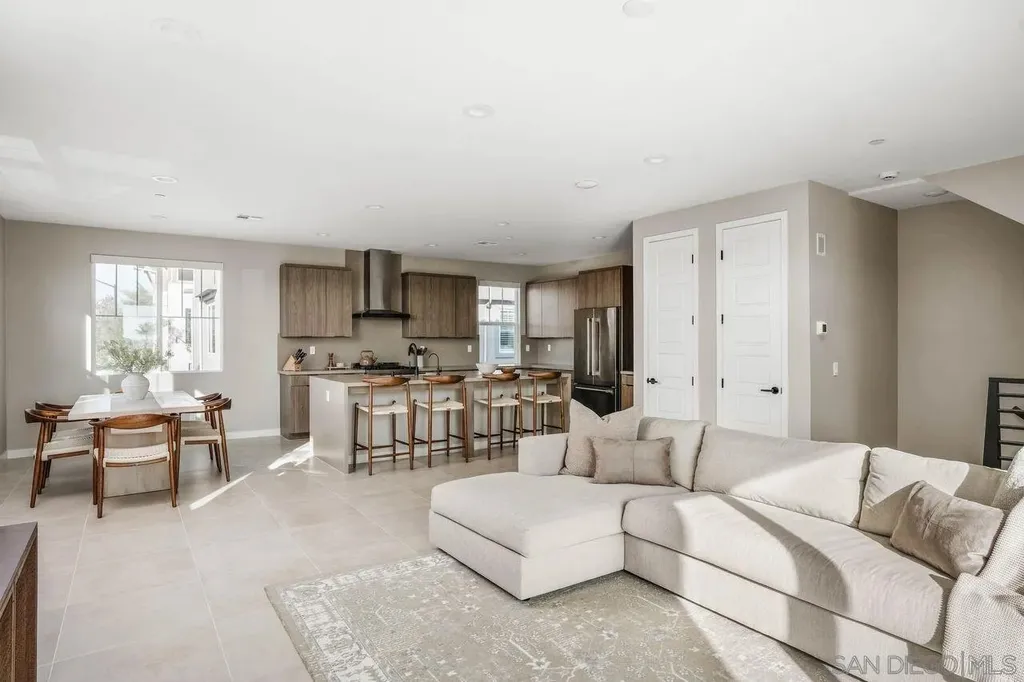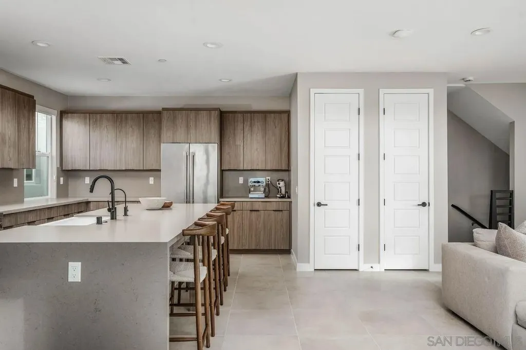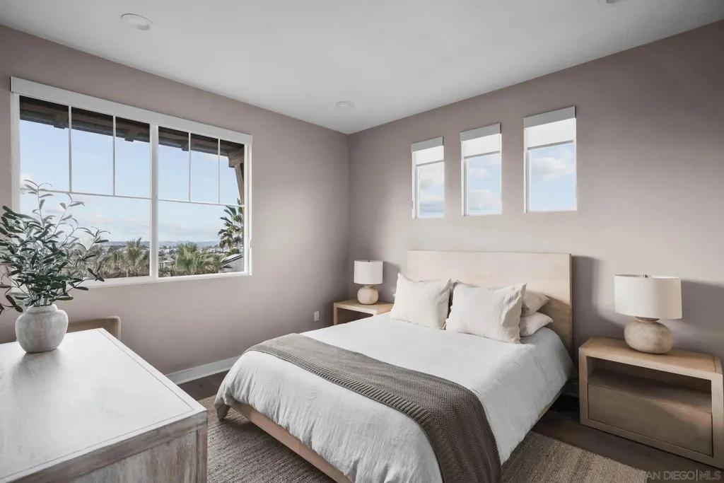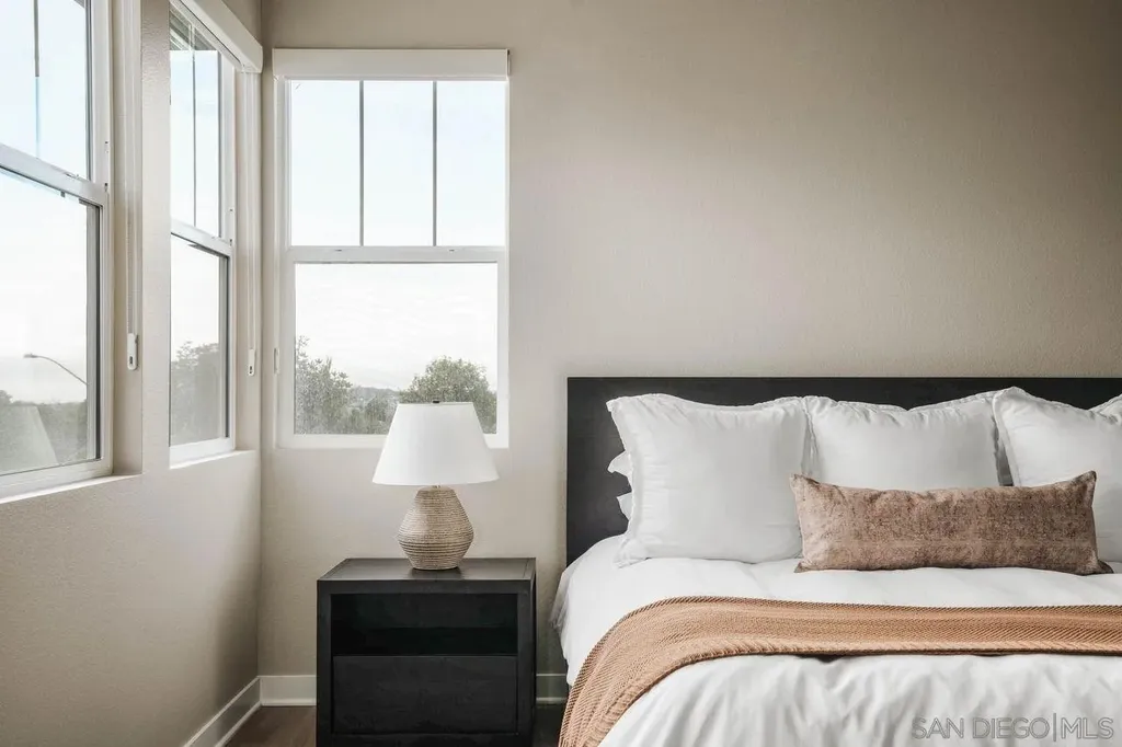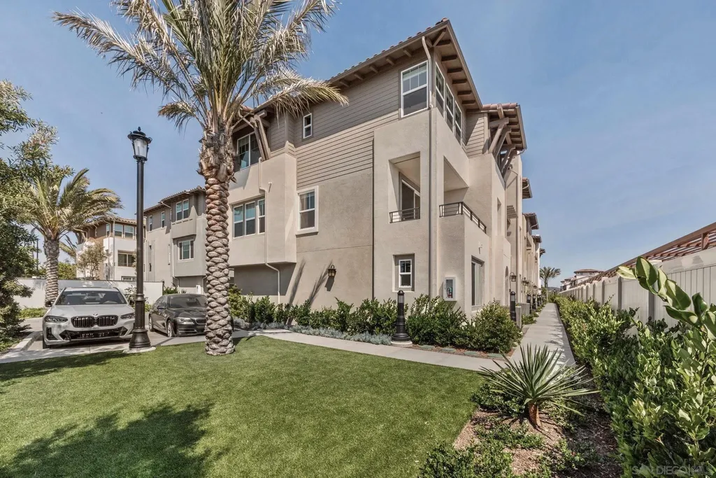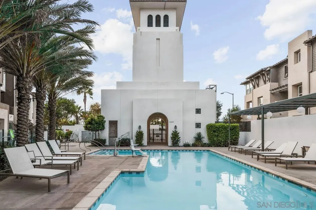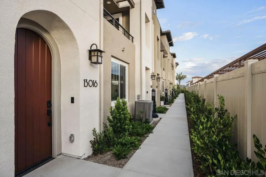 Welcome to 13016 Lumen Way, a Mediterranean-inspired retreat where warm earth tones, natural textures, and minimalist design create effortless style and inviting comfort. Located in the Lumen community of Pacific Highlands Ranch, this 4-bedroom, 3.5-bath, 2,118 sq.ft end-unit townhome sits in the most desirable location in the neighborhood - next to a semi-private parklet, with expansive views of Carmel Valley and peekaboo ocean views from the primary and second bedrooms. This light-filled home features over $100,000 in upgrades, including fully owned solar, high-end quartz countertops throughout, a striking waterfall island, and a full backsplash in the kitchen. Additional highlights include upgraded flooring throughout, luxury tile on all shower walls, soft-close custom cabinetry, enhanced recessed lighting in every room, custom window shades, and a finished garage with epoxy floors and ceiling-mounted storage racks. Fresh, modern interior paint adds the final touch. Top-of-the-line appliances including a premium washer and dryer, as well as a reverse osmosis system are included, making this home move-in ready. Lumen residents enjoy resort-style amenities with a pool, jacuzzi, and walkability to top-rated schools, shopping, dining, and trails. A rare chance to own a thoughtfully designed home that fuses Mediterranean inspiration with North County living.