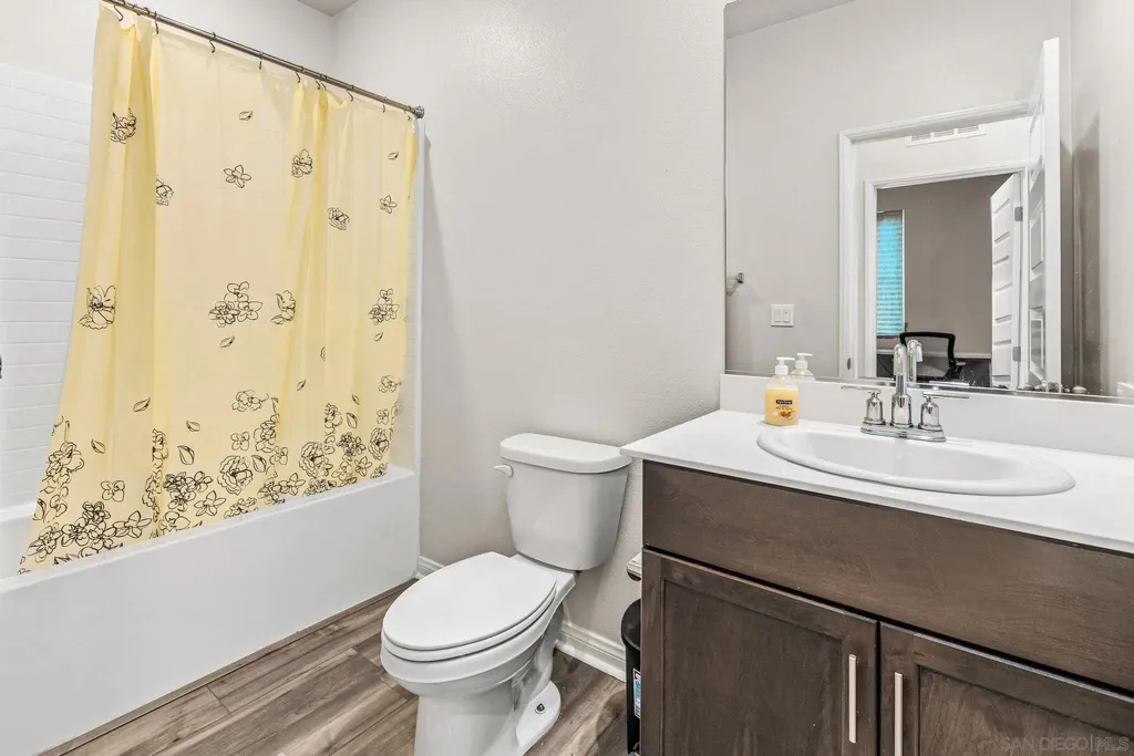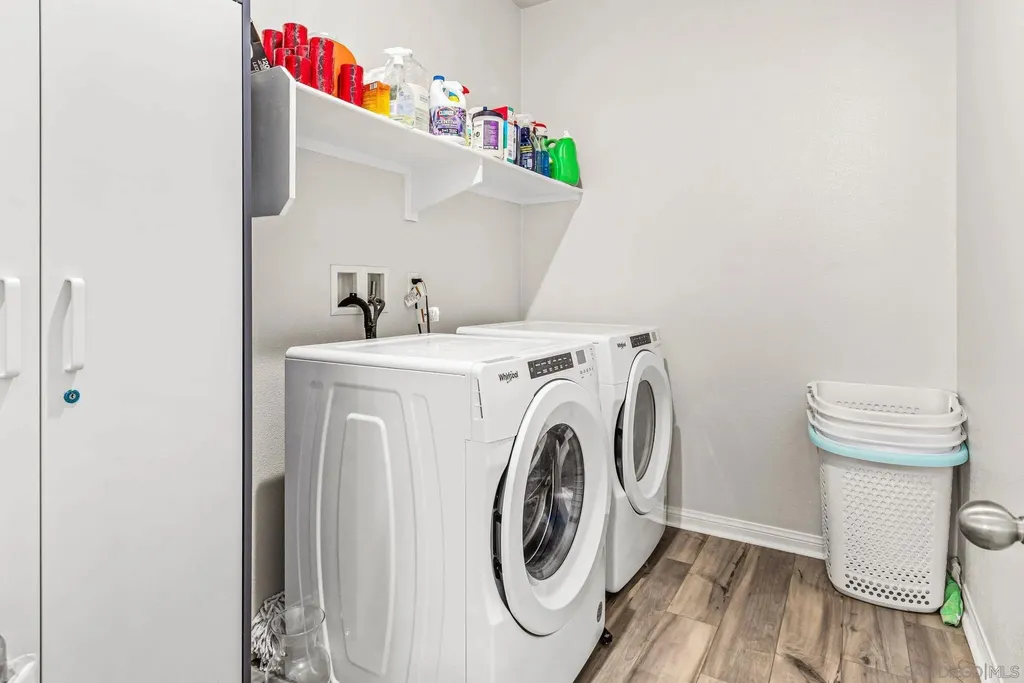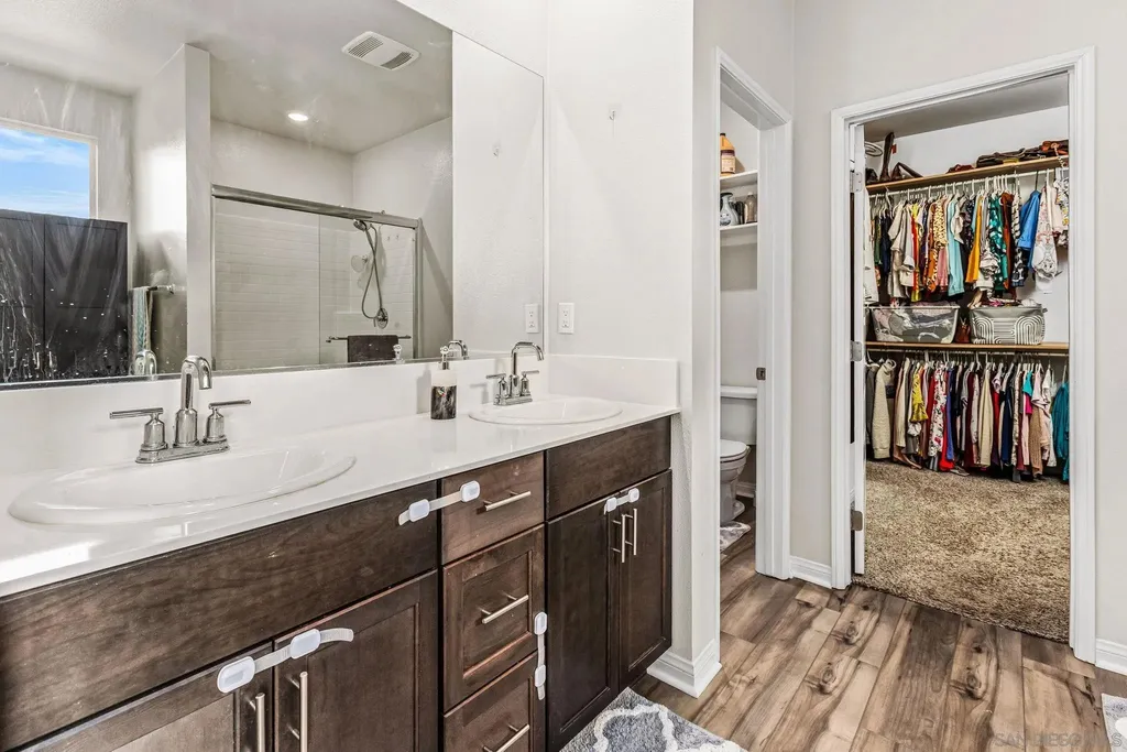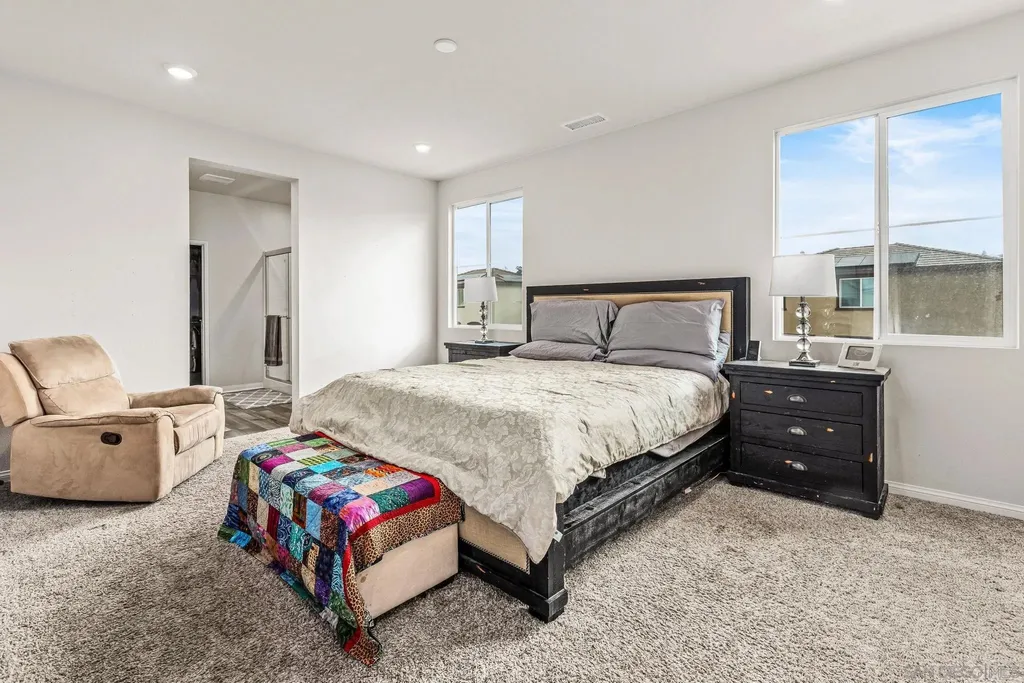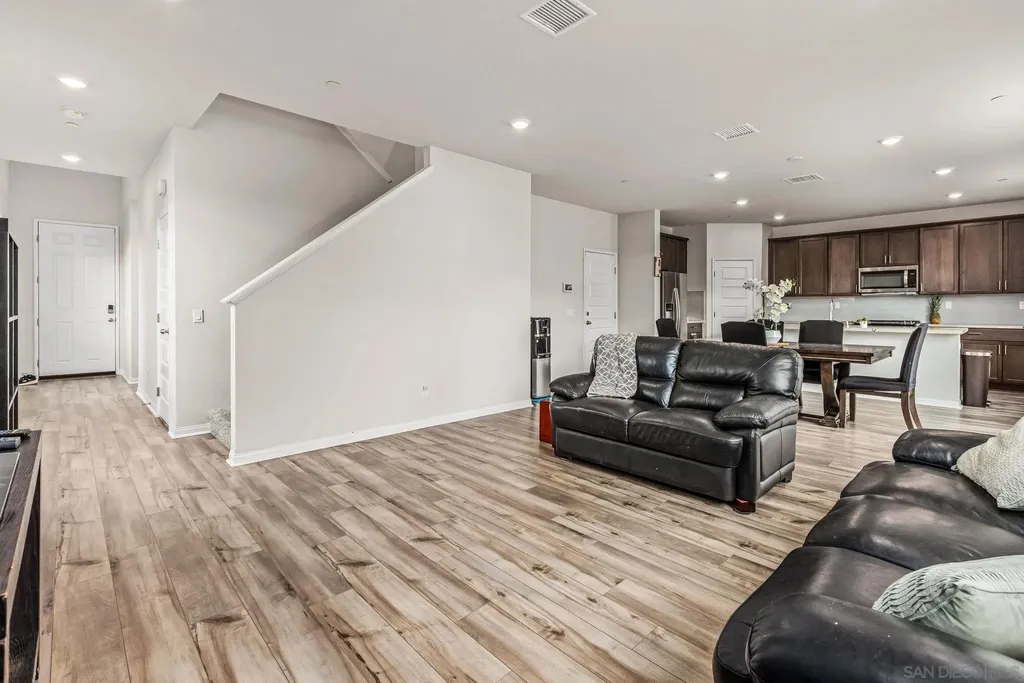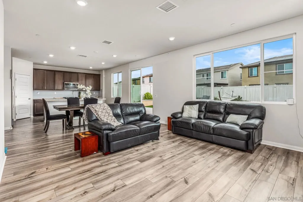 Welcome to Park Circle, Valley Center's premier master-planned community, where modern design meets small-town charm. This stunning 5-bedroom, 3-bathroom home delivers the perfect balance of sophistication, comfort, and functionality. Step inside to discover an open-concept floor plan highlighted by a chef-inspired kitchen featuring granite countertops, stainless steel appliances, a 5-burner gas cooktop, walk-in pantry, and elegant engineered plank flooring throughout the main level. The inviting great room seamlessly flows into the dining area and outdoor space, creating the ideal setting for entertaining or relaxing with family. A first-floor bedroom and full bath offer flexibility for guests or multi-generational living, while upstairs, you'll find a spacious loft and four additional bedrooms - including a serene primary suite with a custom-upgraded walk-in closet and spa-like bath. Modern upgrades include a smart thermostat, energy-efficient PAID SOLAR, and a beautifully designed backyard with premium turf, perfect for low-maintenance outdoor enjoyment. The low-maintenance front yard enhances curb appeal, completing this turnkey home's polished look. Residents of Park Circle enjoy an exceptional lifestyle with resort-style amenities - including a clubhouse, pool and spa, fitness center, BBQ areas, playgrounds, and scenic walking and biking trails - all within a vibrant, family-friendly community. Don't miss your opportunity to own in one of Valley Center's most desirable new neighborhoods - where modern living and community connection come together beautifully.