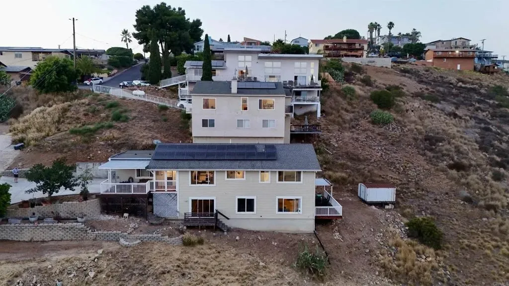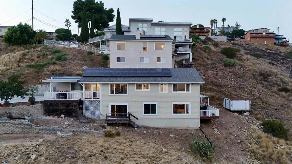 Welcome to 1421 Maria Ave., Spring Valley, CA 91977VA assumable loan at 2.75% available on approved credit a rare and valuable financing option! Home is designed for flexible multi-family living or rental income opportunities with separate entrances for both levels. This great investment is a remarkable 5 Bedroom, 4 Bathroom custom-built hillside estate offering breathtaking 270 panoramic views in the sought after neighborhood of Dictionary Hill that encompass Sweetwater Reservoir, Mount Miguel, the Pacific Ocean, and the Coronado Islands. Positioned atop a private, private driveway with scenic ascent that enhances both privacy and the spectacular view. This exceptional property caters to families, savvy investors, or multi-generational households seeking versatility, privacy, and an impressive scenery. The lower level comprises a 2BR/2BA unit, while the upper level presents a 3BR/2BA layoutideal for long- or short-term rentals, or as a primary residence with additional income units, including potential use of the converted garage as an ADU or studio. The converted garage offers two versatile bonus rooms suitable for a home office, gym, storage, or further ADU conversion possibilities. The 3 deckstwo of which are coveredprovide seamless indoor-outdoor living and ample space for entertaining, all while enjoying sweeping views. Additional amenities include a whirlpool tub, tastefully tiled bathrooms, hardwood and luxury vinyl plank flooring, energy efficient 8 kw solar system and abundant dual-pane windows throughout, maximizing natural light and capturing the stunning vistas. Practical features such as under-deck storage for surfboards, kayaks, or tools, a dedicated laundry room with oversized utility sink, and an expansive driveway accommodating three or more vehicles offer enhanced convenience for residents and guests. Pet-friendly yard spaces surround the property, while central and portable AC and heating provide year-round comfort. Ideally located with convenient access to great schools (just 8.5 miles to SDSU), shopping centers, restaurants, entertainment venues, and major highways (CA-125, 54, 94), this home ensures an effortless commute and accessibility throughout San Diego. With no HOA or Mello-Roos fees, the property delivers outstanding value, combining comfort and convenience in an exceptional setting. VA assumable loan at 2.75% available on approved credit a rare and valuable financing option! Do not miss the opportunity to make this stunning estate your new home. Schedule a private tour today to explore all the possibilities.