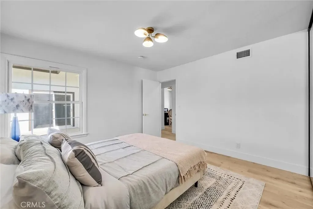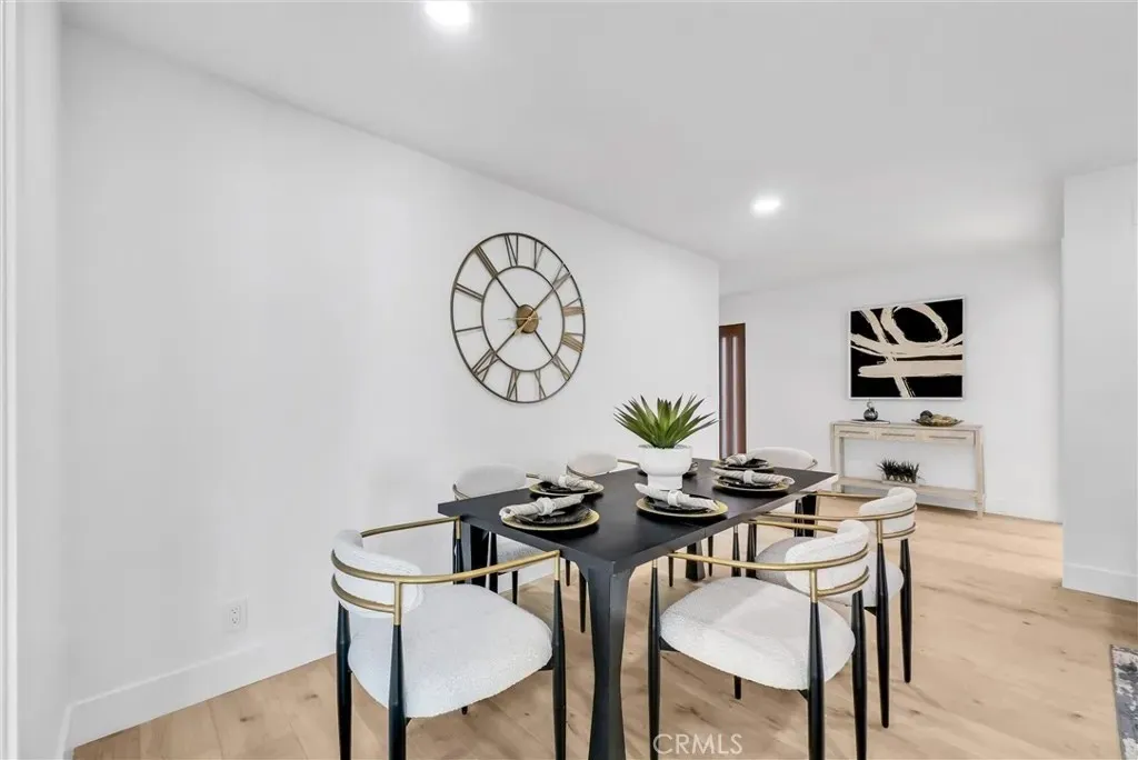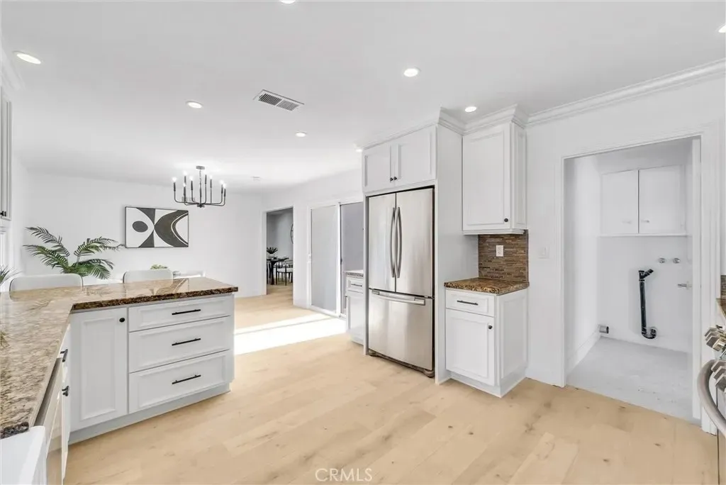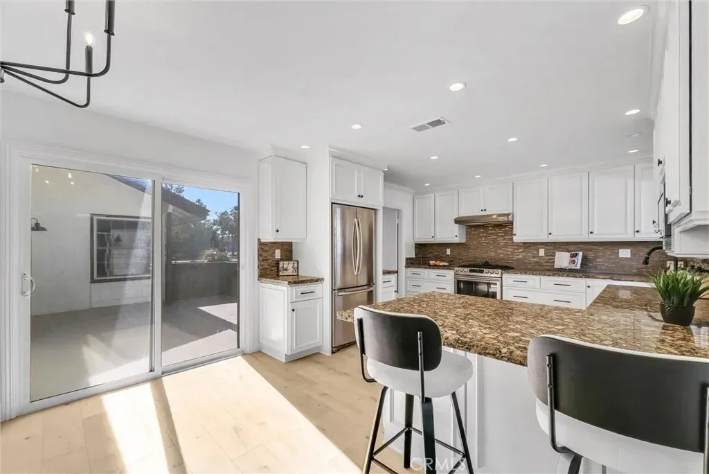 Welcome to this exceptional four-bedroom, two-bathroom home nestled in the coveted Villa Park community, where sophistication meets suburban serenity. Upon approach, elegant double walnut doors herald your arrival into 1,746 square feet of thoughtfully designed living space adorned with lustrous light oak luxury vinyl flooring that flows seamlessly throughout. The heart of this residence showcases a gourmet kitchen that would make even the most discerning chef swoon, featuring gleaming granite countertops, premium stainless steel appliances, and an abundance of storage solutions for the culinary enthusiast. The inviting living room, anchored by a charming fireplace, provides the perfect backdrop for both intimate gatherings and grand entertaining. The primary bedroom serves as a tranquil retreat, complete with mirrored wardrobe doors and an attached private bathroom. Three additional bedrooms, each equipped with mirrored wardrobe doors, offer flexibility for family living, home offices, or guest accommodations. Throughout the home, recessed lighting and brushed gold hardware elevate the aesthetic with contemporary elegance. Practical amenities abound, including an indoor laundry room, attached two-car garage, seller-paid solar panels, efficient tankless water heater, and central air and heating systems for year-round comfort. The location proves equally impressive, with proximity to highly-regarded Villa Park Schools and convenient access to Ralphs Fresh Fare for daily necessities. Villa Park High School sits nearby, while Grijalva Park offers recreational opportunities. The Orange train station provides excellent transportation connectivity. This residence perfectly balances modern luxury with everyday functionality, creating an ideal sanctuary for contemporary living.