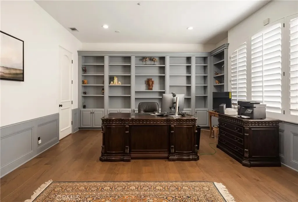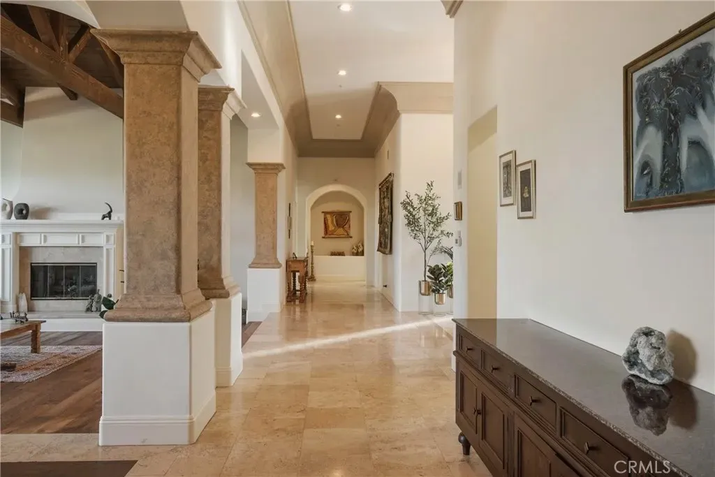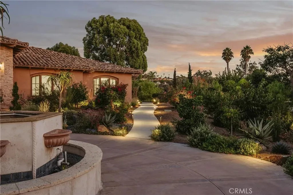 Experience the essence of serene luxury in this private Rancho Santa Fe retreat. Tucked behind gates on nearly two acres of beautifully landscaped grounds, this single-level estate blends timeless architecture with a relaxed, open-concept design that feels both grand and grounding. Step inside and discover an inviting layout that seamlessly connects spacious living areas, an oversized kitchen and family room, and a stunning great room with open-beamed ceilings perfect for both intimate gatherings and large-scale entertaining. With over 5,000 sq. ft., the home offers three generous bedroom suites plus an elegant primary suite that opens to the gardens and poolside views. Every detail reflects quality craftsmanship from the crown molding and rich wood floors to the travertine and marble finishes throughout. Outdoors, the estate transforms into a private resort, lush Zen-inspired gardens, a saltwater pool and spa with solar heating, multiple terraces for dining and lounging, a built-in BBQ, fire pit, and a shaded cabana ideal for relaxing as the sunset glows or hot air balloons drift overhead. With paid solar for both home and pool, and set in one of Rancho Santa Fes most sought-after locations, this rare property offers the perfect blend of privacy, sophistication, and California indoor-outdoor living at its finest.