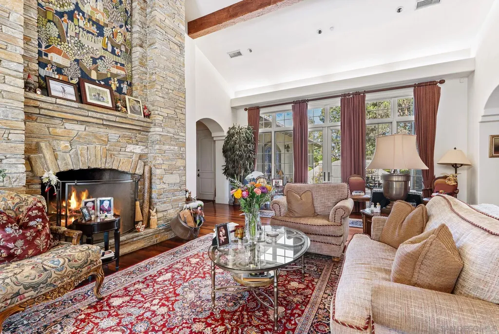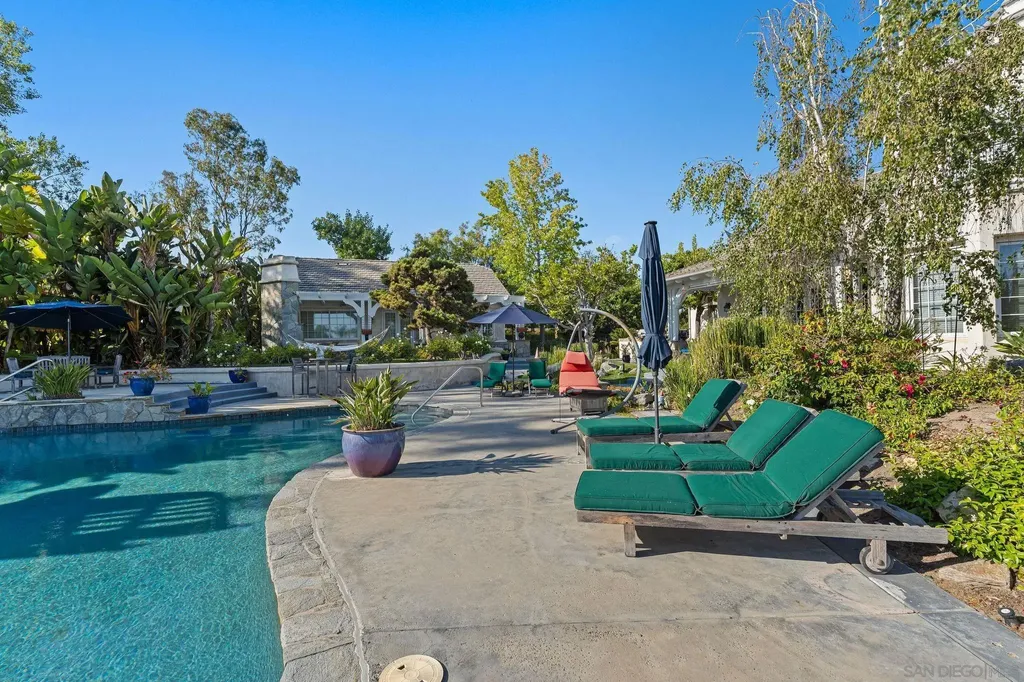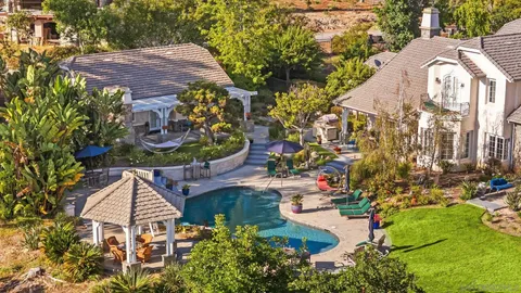 VALUE RANGE - $5,150,000 - $5,725,000 Welcome to this extraordinary custom estate offering ultimate privacy and luxury behind its own private gate complete with resort size pool and backyard, waterslide, entertainment spaces and ponds completing the serene aesthetic. The main residence spans approximately 7,938 sqft on 2 acres featuring 4 spacious ensuite bedrooms and optional bedroom spaces, 4.5 bathrooms, formal and informal living areas, a gourmet kitchen with high-end appliances, and a large family room designed for entertaining and everyday comfort. Upgraded lighting throughout completes this expansive living and floor plan. The primary suite is a true sanctuary, featuring a cozy fireplace, dual walk-in closets, a private sitting room with its own balcony, and an attached private gym - creating the perfect space for relaxation and wellness. A standout feature of the property is the detached large guest house, offering a full bedroom and bathroom, kitchen, and living room - ideal for long-term guests or multi-generational living. Set on beautifully landscaped grounds with expansive patios, this residence offers peace, space, and elegance in one of Rancho Santa Fe's most desirable locations. A circular driveway and oversized garage complete this exceptional offering. Conveniently located close to shops, grocery stores, farmers market, beaches & easy access to the freeway. Other: *Top Tier School District San Dieguito Unified. *Solar Panels Owned *Preventative Leak system