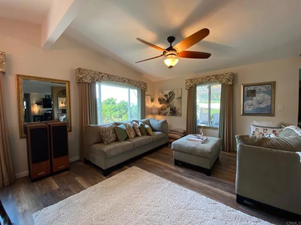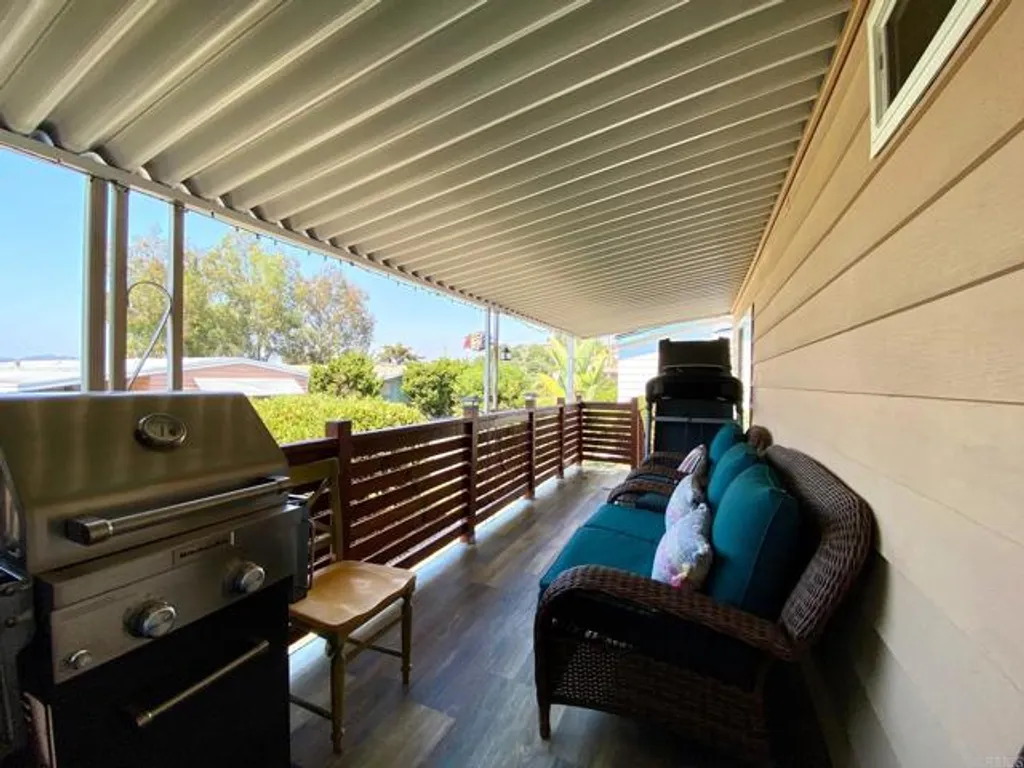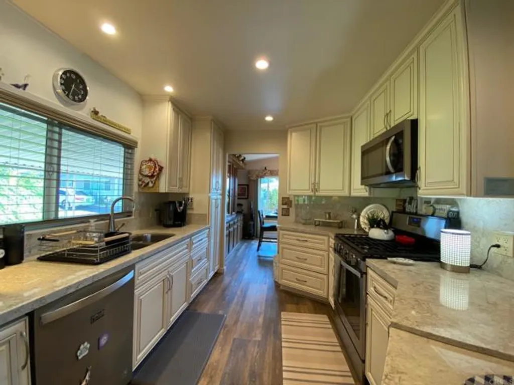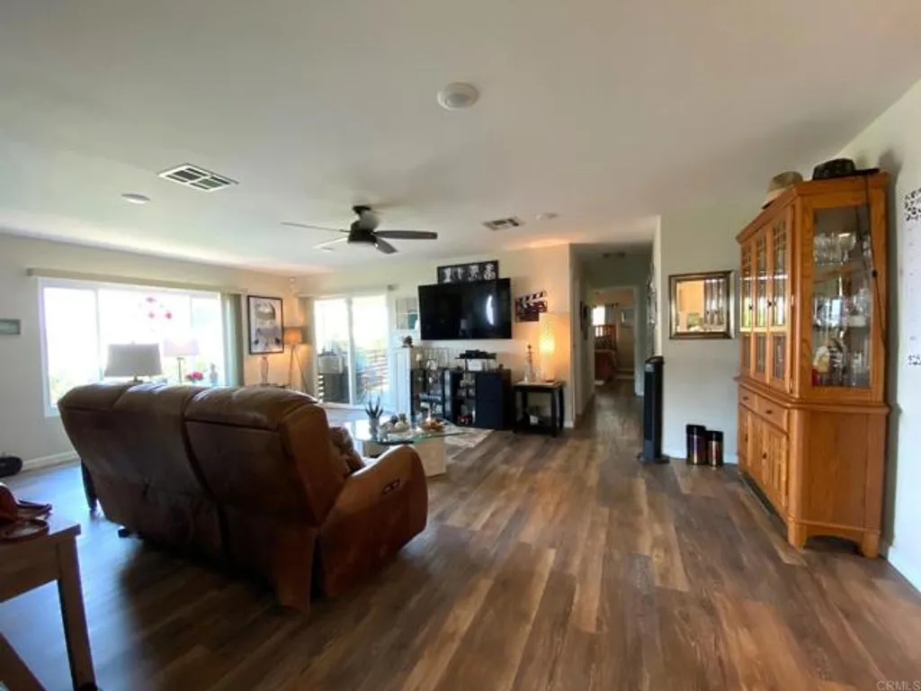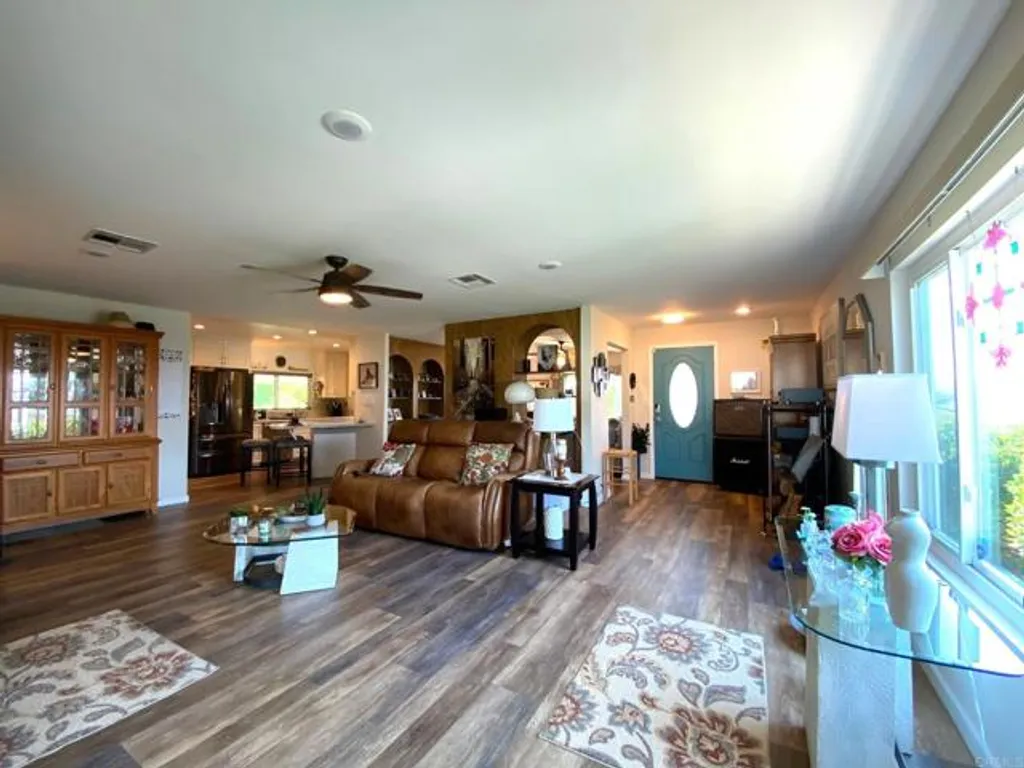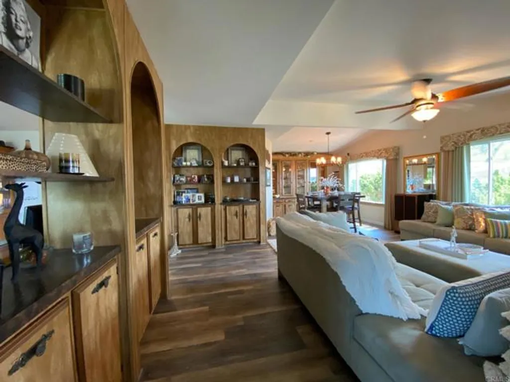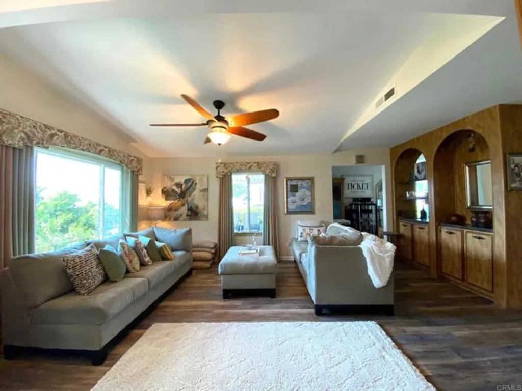 55/18 Community. Lot rent will be added soon. Luxurious Home - you don't find many homes like this one in mobile home communities. No expense was spared when remodeling this home. Inviting front covered porch leads you into this one of a kind triple wide home. The gourmet kitchen is totally magnificent; top of the line cabinetry, quartz countertops, stunning appliances and can lighting. There is also a large breakfast bar and 2 pantries. Dining area has a wall to ceiling China cabinet with ample storage space. The dining and formal living room feature stunning custom made cornices/drapes over the dual pane windows for a lavish look. Enjoy the view from most every window in this home. The oversized bonus/family room is the perfect room to watch tv and entertain friends and family. There are built-in hutches between the living room and the bonus room. The beautiful blue front door brings a feel of happiness! The bonus room features a sliding glass door which will lead you to the view deck. In the yard, you will find a black & white tall bird of paradise plant, mature avocado, tangerine, lemon and orange trees. Main suite offers mirrored closet doors and an ensuite bathroom; large garden tub, shower stall with glass doors, dual sinks and a very large linen closet. Guest bedroom and bathroom. Spacious indoor laundry room has a utility sink and includes the washer/dryer. Other great features are the dual pane windows & sliding glass doors, luxurious laminate flooring, drywalled walls throughout, vaulted ceilings and ceiling fans. Best of all, enjoy delicious purified water from