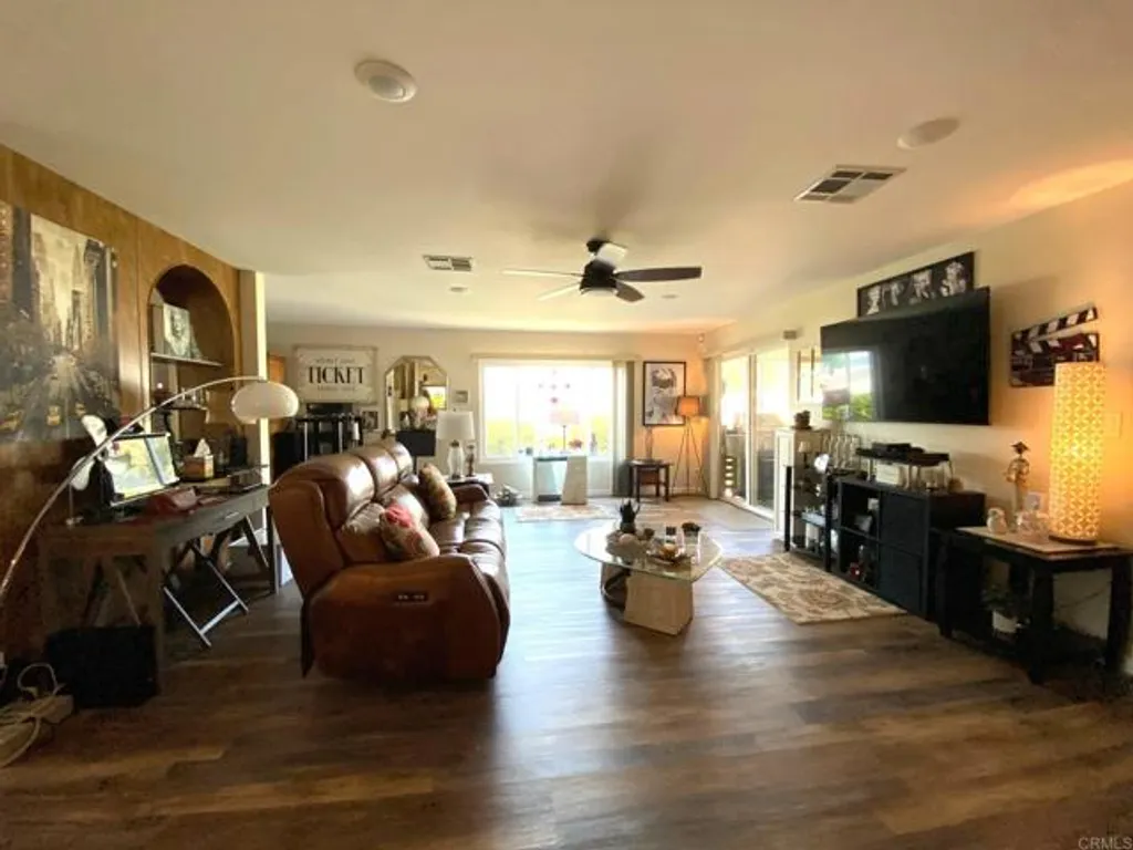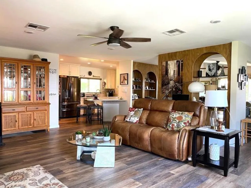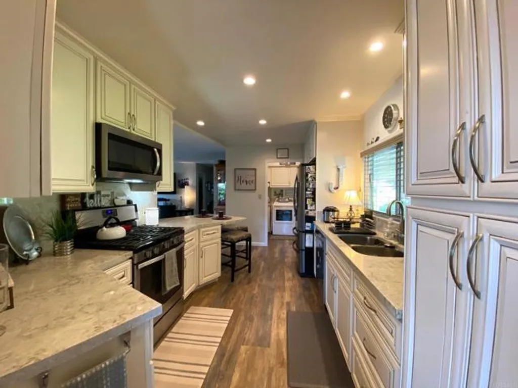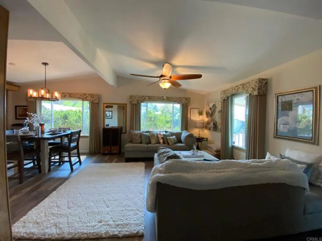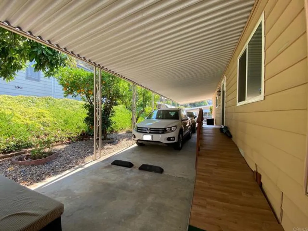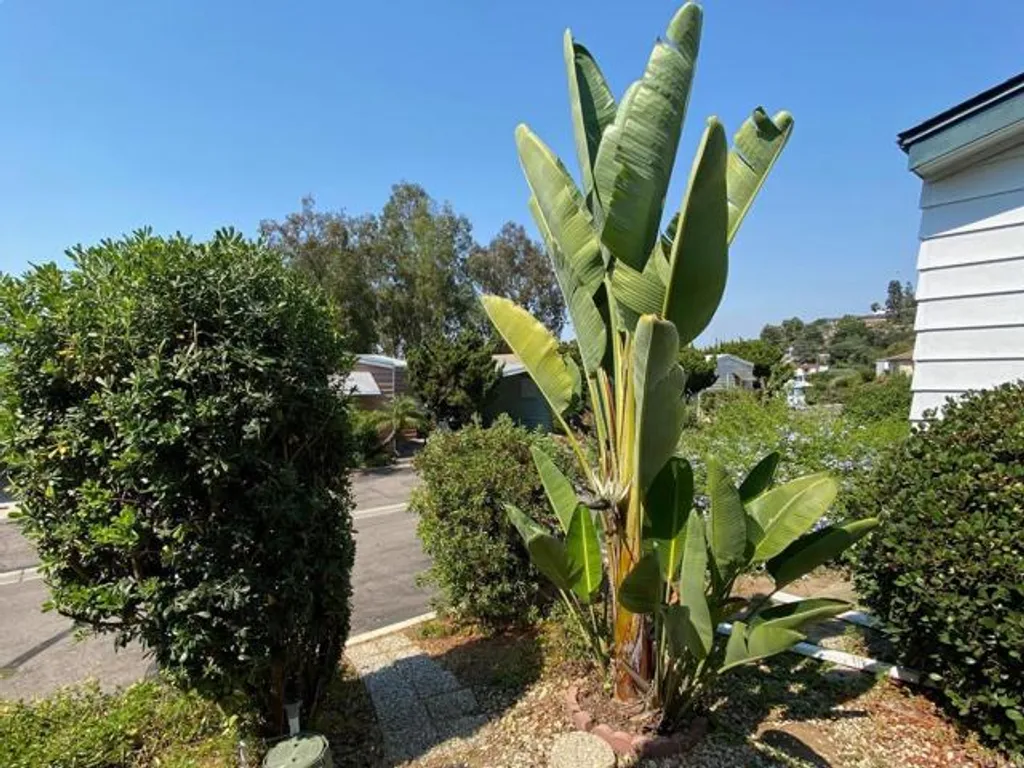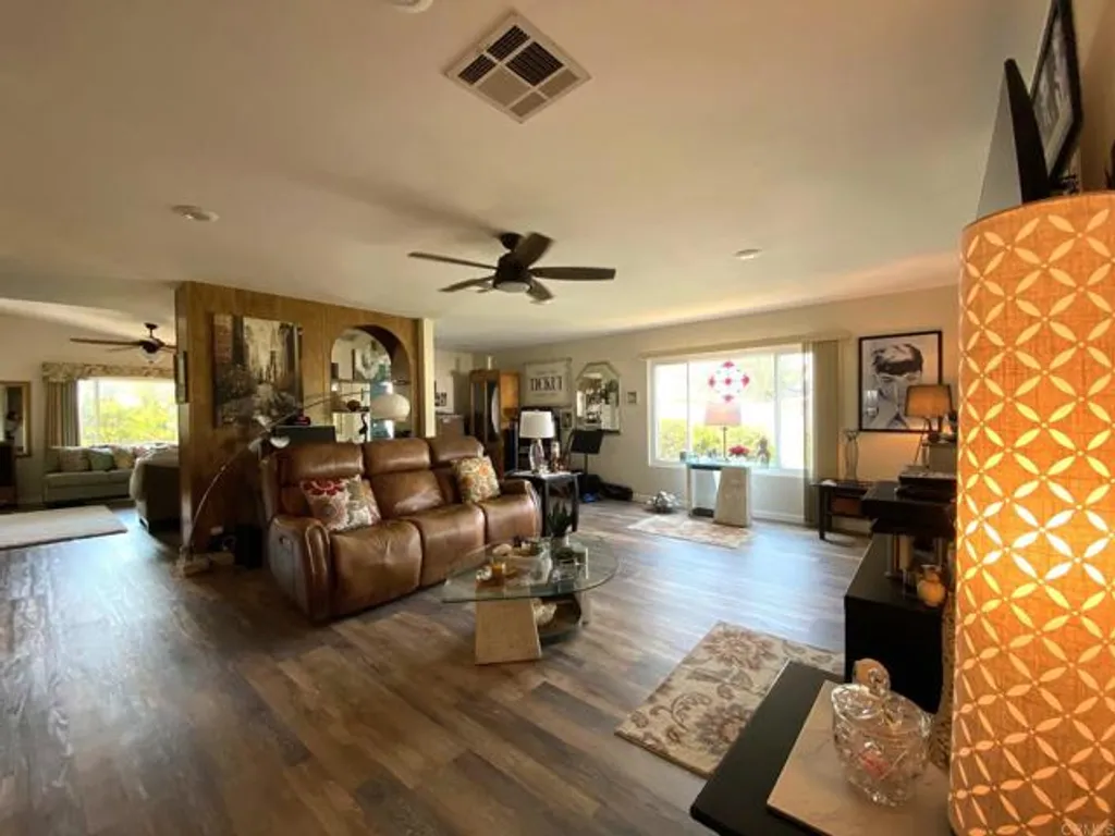 55/18 Community. Lot rent will be added soon. Luxurious Home - you don't find many homes like this one in mobile home communities. No expense was spared when remodeling this home. Inviting front covered porch leads you into this one of a kind triple wide home. The gourmet kitchen is totally magnificent; top of the line cabinetry, quartz countertops, stunning appliances and can lighting. There is also a large breakfast bar and 2 pantries. Dining area has a wall to ceiling China cabinet with ample storage space. The dining and formal living room feature stunning custom made cornices/drapes over the dual pane windows for a lavish look. Enjoy the view from most every window in this home. The oversized bonus/family room is the perfect room to watch tv and entertain friends and family. There are built-in hutches between the living room and the bonus room. The beautiful blue front door brings a feel of happiness! The bonus room features a sliding glass door which will lead you to the view deck. In the yard, you will find a black & white tall bird of paradise plant, mature avocado, tangerine, lemon and orange trees. Main suite offers mirrored closet doors and an ensuite bathroom; large garden tub, shower stall with glass doors, dual sinks and a very large linen closet. Guest bedroom and bathroom. Spacious indoor laundry room has a utility sink and includes the washer/dryer. Other great features are the dual pane windows & sliding glass doors, luxurious laminate flooring, drywalled walls throughout, vaulted ceilings and ceiling fans. Best of all, enjoy delicious purified water from