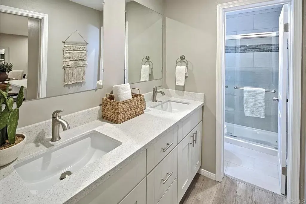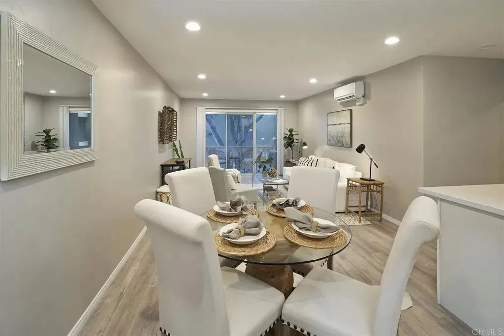 Owner is open to negotiations to close quickly. Full reno in 2019, the home features, new A/C, new plumbing, electrical panel & circuits, lighting, & finishes. The stunning kitchen showcases solid wood cabinetry, white quartz countertops, oversized deep sink & new stainless steel appliances. The bathroom is equally refined, with dual vanity sinks, mosaic-tiled shower walls & modern fixtures. Additional upgrades include new closets & doors, wood flooring, recessed lighting & drywall ceilings, giving the home a bright, contemporary feel. This first floor corner unit has exceptional privacy with no shared walls, & a quiet interior location free from street noise. From the private patio, take in serene lagoon & lush garden viewsa tranquil setting thats just steps from the main lobby, gym, package room, library, & pool. A rare highlight, this home includes a dual mini-split A/C & heating system with separate zones for the living & bedrooma premium comfort upgrade found in very few units at The Plaza. Your prime reserved garage parking space is located on the lower level, offering one of the widest stalls in the complex, large enough to fit a full-size vehicle such as a Ford Raptor. Residents of The Plaza Condominium Association enjoy four pools / hot tubs, a fully equipped gym & sauna, tennis courts, clubhouse & beautifully landscaped courtyards with a tranquil lagoon. Just minutes from the beach, bays, Garnet Ave, and iconic Pacific Beach dining & nightlife, the home has unmatched walkabilitymaking this the ultimate beach-city lifestyle destination.