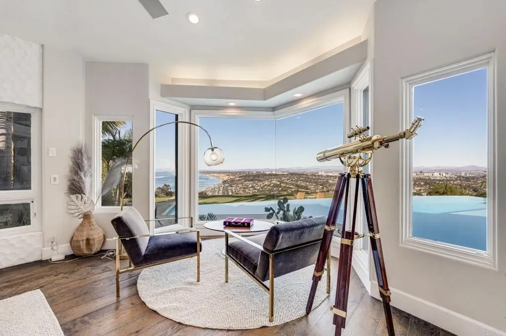 VIEWS. PRIVACY. SPACE. Panoramic Ocean Views ON TOP OF THE JEWEL! Mount Soledad estate with 180 panoramic ocean, mountain, and city views. Privately gated on almost an acre of land. 8,694 sq ft with recent $1M+ upgrades and prior 20052006 renovations by a prominent music executive. Features five ensuite bedrooms with balconies, two-story foyer, office, home theater, chefs ocean-view kitchen with custom cabinetry and top-tier appliances, and newly reimagined primary suite with private balcony and magical coastal views. Outdoors: vanishing-edge pool, spa, fire pit, outdoor kitchen, large grass area, sprawling backyard, fruit trees, dry pond, sport court potential, and Tesla EV charger.