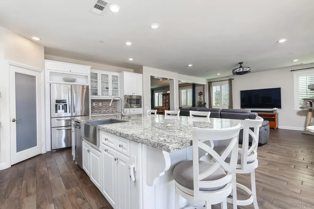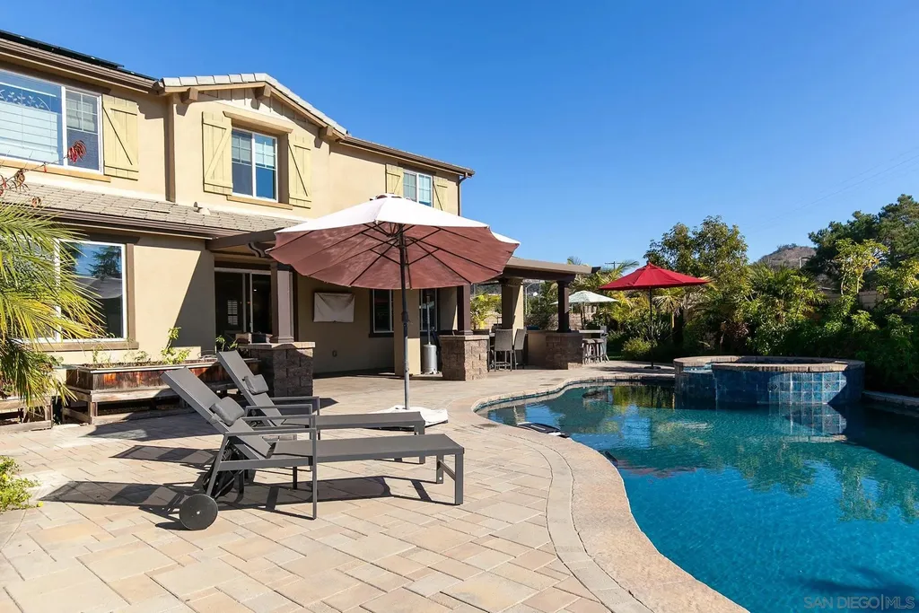 Experience the versatility of the Lennar Next Gen - The Home Within a Home floor plan, perfectly suited for multigenerational living, a private home office, or a personal gym. The attached ADU with its own private entrance features charming brick accent walls, a living area, bedroom, full bath, kitchenette, and dedicated laundry - an ideal space for extended family or guests. The main residence offers an open-concept gourmet kitchen outfitted with built-in stainless-steel GE appliances, an oversized granite island, and generous workspace for cooking and entertaining. The spacious primary suite includes a spa-inspired bathroom with a luxurious soaking tub, walk-in shower, dual sinks, and two walk-in closets. Step into the resort-style backyard, complete with a custom saltwater pool and jacuzzi, a full pool house bathroom, and an outdoor kitchen island with built-in BBQ. The beautifully landscaped yard features fruit trees and raised garden beds, creating a peaceful retreat. Additional highlights include owned solar and a backup generator on a dedicated circuit panel for added efficiency and peace of mind.