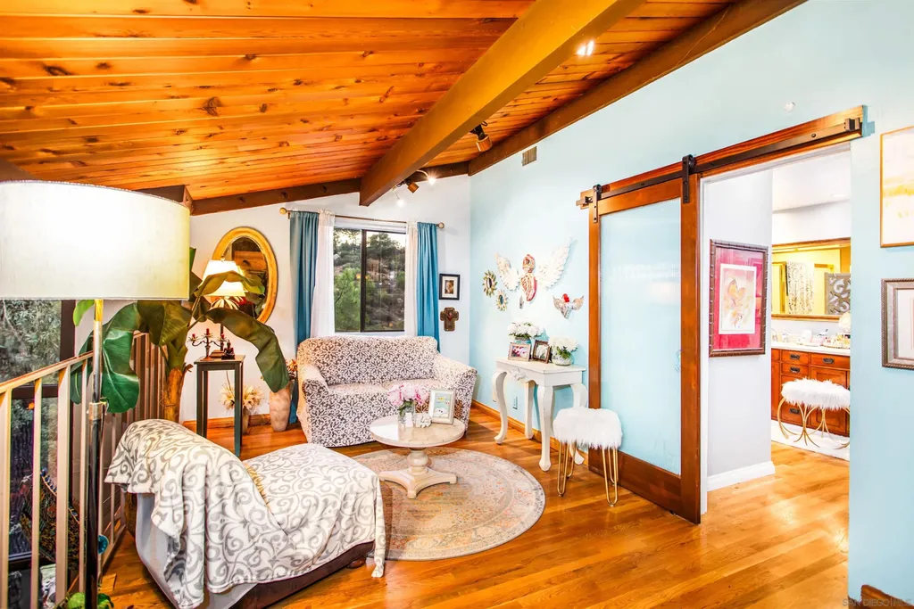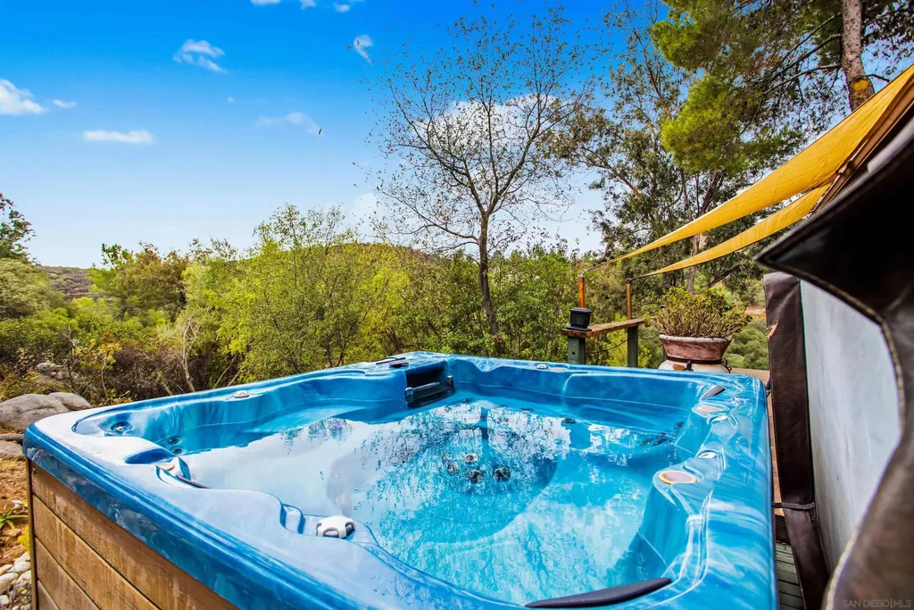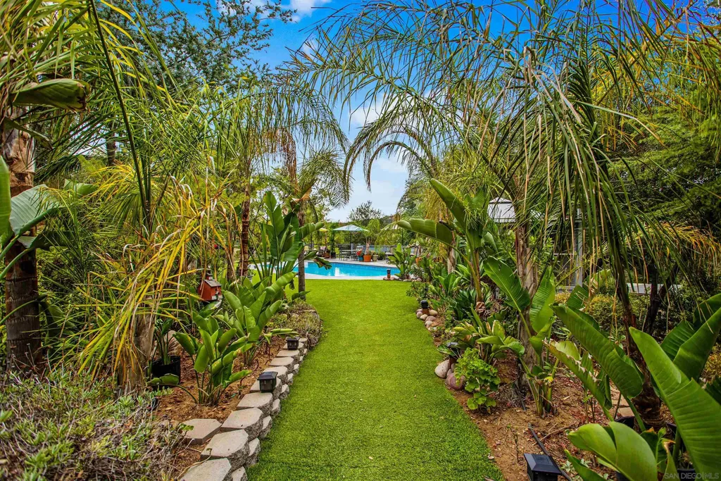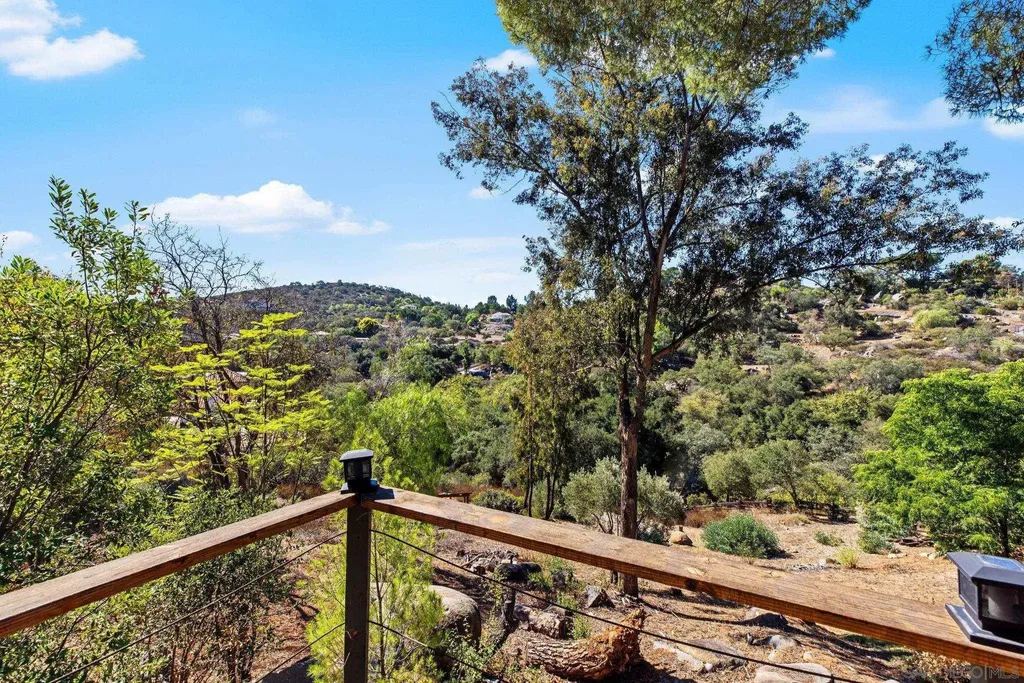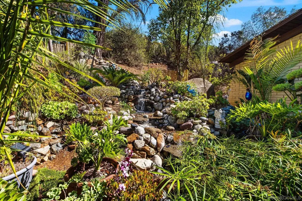 It's as unique as you are - your own private, tropical retreat nestled in the foothills with stunning views of hawks circling the treetops. It's calm, quiet, and tucked away from it all in Palo Verde Ranch - yet you're just minutes from stores and restaurants. This jaw-dropping custom home is a rare, one-of-a-kind find. An artful 25 foot high waterfall cascades down as you approach the front door and flows under a bridge - each time you walk across it, you slow down and breathe a little deeper. The spectacular soaring glass foyer welcomes you in. Floor to ceiling windows flood the sprawling living/dining area with natural light, and the warm honey-toned high vaulted ceilings give a golden glow. A dramatic 20 foot high stacked stone fireplace anchors the space. The updated open-concept kitchen and den - with its stacked stone wall, fireplace, and granite hearth exude comfort and ease. Real hardwood floors, custom details, and thoughtful design give this home its uncommon blend of elegance, warmth, and character. All three bedrooms boast the rich, honey-colored vaulted wood ceilings. The serene primary has a spacious walk in closet and a high deck with views. There are two and a half bathrooms, plus a bonus space - ideal for a home office, guest area, or creative studio. All rooms except one connect to the outdoors through large sliders, and each of four decks offers a different view of the trees, boulders, and mountains. A breezy 27x27 covered deck adds even more outdoor living space for dining, entertaining, and spectacular sunsets. You also get owned solar, zoned AC plus a bedroom unit, a two-car garage with half bath and laundry, two carports, a 16x12 detached workshop, and ample parking space. The sparkling salt water pool with its giant Trex deck, gazebo, and carefree turf is perfect for relaxing. With 107 queen palms waving gracefully in the near-constant gentle breeze, 40 giant bird of paradise, and multi-colored flowers, visitors ask if this is a resort. The landscaping conserves water, doesn't require mowing, blends with nature, and is lit with solar lights. Massage your worries and aches away in the chlorine-free 30-jet hot tub, visited by hummingbirds, owls, and doves. Equestrians and hikers appreciate the miles of trails right out the door. The barn can be used for horses or storage. Walk one block to a gorgeous lake, tennis/pickleball courts, a horse arena, and picnic pavilion set amongst picturesque ancient oaks, giant boulders, and trails with views of the Cuyamaca Mountains beyond. As part of the Palo Verde Ranch community, you also enjoy a clubhouse, gym, another park with a larger lake, sand beach, and lush lawn, a boat dock (electric boats only,) fishing, huge picnic pavilion, fun events, and more. This kind of property rarely comes along - peaceful, private, and unique character, all in a well-established, friendly community with top-notch amenities yet unbelievably low dues. If you've been looking for a home that feels like being on year-round holiday, this might be the one.