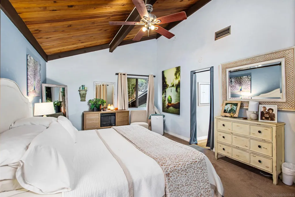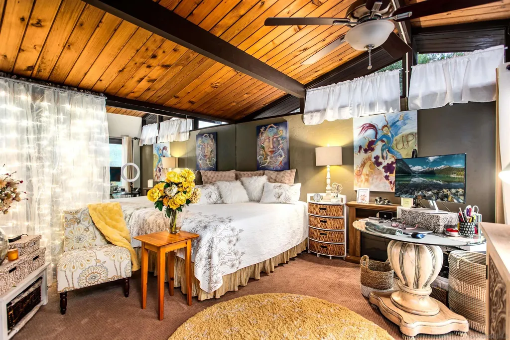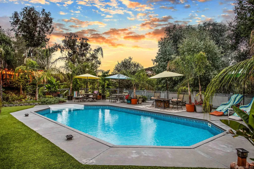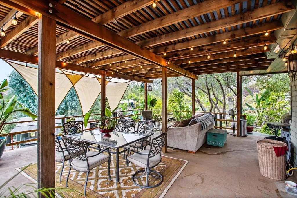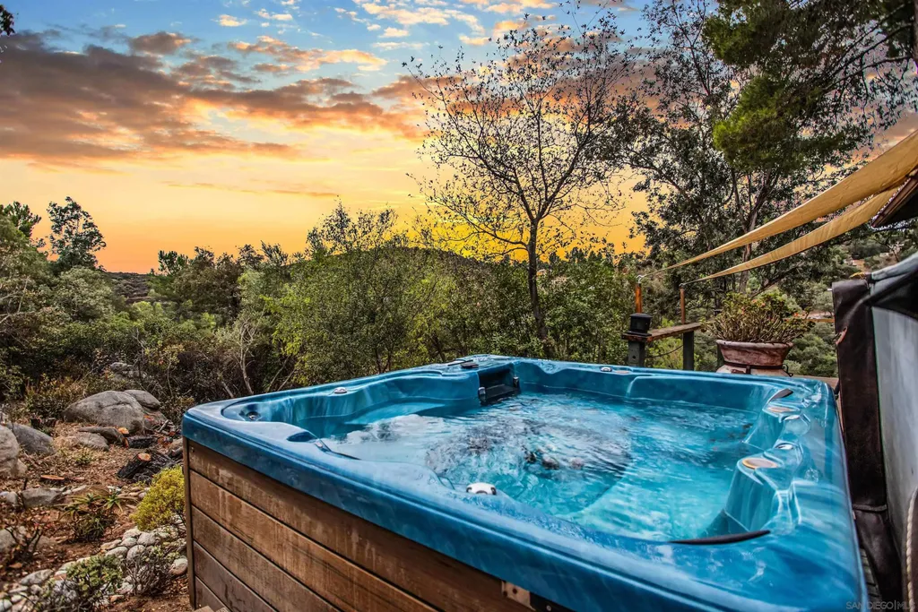 It's as unique as you are - your own private, tropical retreat nestled in the foothills with stunning views of hawks circling the treetops. It's calm, quiet, and tucked away from it all in Palo Verde Ranch - yet you're just minutes from stores and restaurants. This jaw-dropping custom home is a rare, one-of-a-kind find. An artful 25 foot high waterfall cascades down as you approach the front door and flows under a bridge - each time you walk across it, you slow down and breathe a little deeper. The spectacular soaring glass foyer welcomes you in. Floor to ceiling windows flood the sprawling living/dining area with natural light, and the warm honey-toned high vaulted ceilings give a golden glow. A dramatic 20 foot high stacked stone fireplace anchors the space. The updated open-concept kitchen and den - with its stacked stone wall, fireplace, and granite hearth exude comfort and ease. Real hardwood floors, custom details, and thoughtful design give this home its uncommon blend of elegance, warmth, and character. All three bedrooms boast the rich, honey-colored vaulted wood ceilings. The serene primary has a spacious walk in closet and a high deck with views. There are two and a half bathrooms, plus a bonus space - ideal for a home office, guest area, or creative studio. All rooms except one connect to the outdoors through large sliders, and each of four decks offers a different view of the trees, boulders, and mountains. A breezy 27x27 covered deck adds even more outdoor living space for dining, entertaining, and spectacular sunsets. You also get owned solar, zoned AC plus a bedroom unit, a two-car garage with half bath and laundry, two carports, a 16x12 detached workshop, and ample parking space. The sparkling salt water pool with its giant Trex deck, gazebo, and carefree turf is perfect for relaxing. With 107 queen palms waving gracefully in the near-constant gentle breeze, 40 giant bird of paradise, and multi-colored flowers, visitors ask if this is a resort. The landscaping conserves water, doesn't require mowing, blends with nature, and is lit with solar lights. Massage your worries and aches away in the chlorine-free 30-jet hot tub, visited by hummingbirds, owls, and doves. Equestrians and hikers appreciate the miles of trails right out the door. The barn can be used for horses or storage. Walk one block to a gorgeous lake, tennis/pickleball courts, a horse arena, and picnic pavilion set amongst picturesque ancient oaks, giant boulders, and trails with views of the Cuyamaca Mountains beyond. As part of the Palo Verde Ranch community, you also enjoy a clubhouse, gym, another park with a larger lake, sand beach, and lush lawn, a boat dock (electric boats only,) fishing, huge picnic pavilion, fun events, and more. This kind of property rarely comes along - peaceful, private, and unique character, all in a well-established, friendly community with top-notch amenities yet unbelievably low dues. If you've been looking for a home that feels like being on year-round holiday, this might be the one.