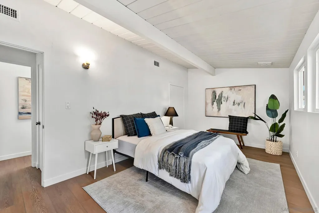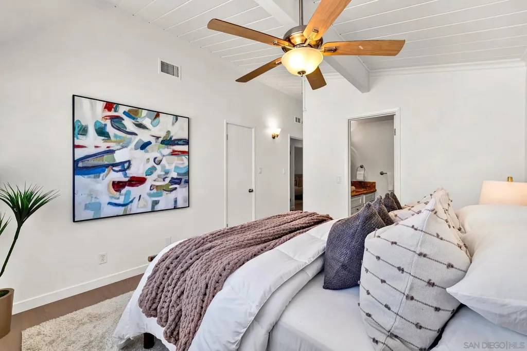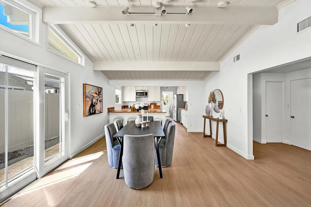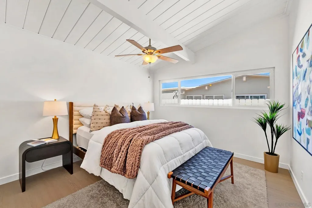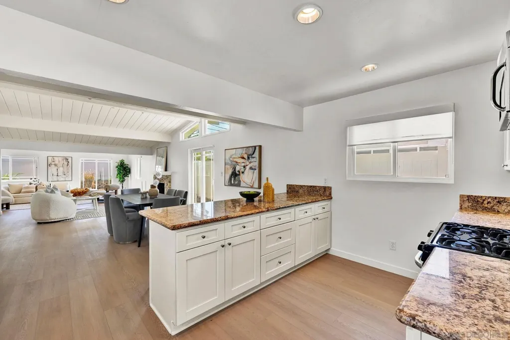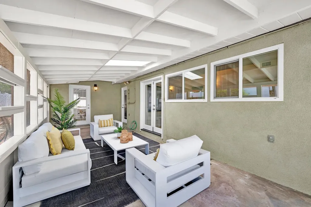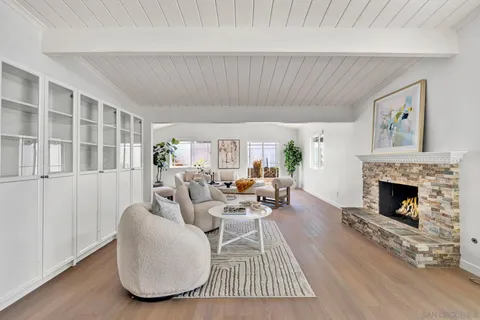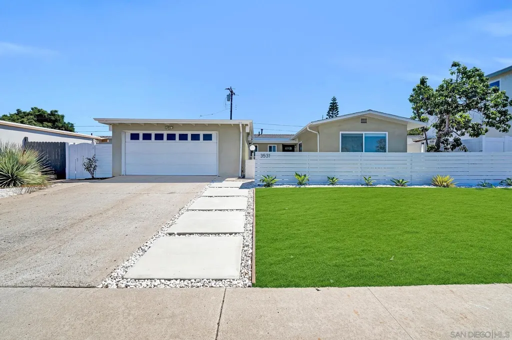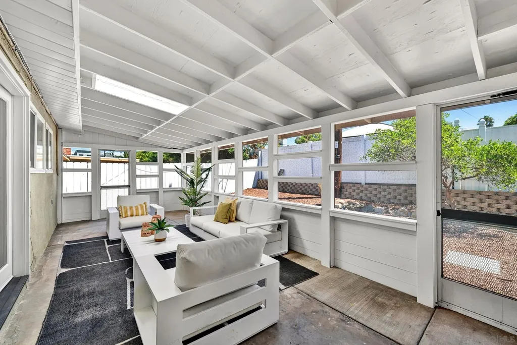 With its mid-century lines, vaulted ceilings, and natural light, 3531 Milagros Street captures the timeless character and contemporary comfort of Southern California living. Tucked within a serene residential enclave of Serra Mesa, this single-level residence offers an easygoing flow and a layout designed for everyday functionality. The living room is anchored by a stone fireplace, opening into a dining area that connects naturally to the kitchen. Granite countertops, shaker cabinetry, and stainless appliances complete a space that balances utility and simplicity. 3 bedrooms and 2.5 baths provide comfort and versatility, with a primary suite offering a dual-sink vanity and stand-up shower. A spacious sunroom, connected to one of the secondary bedrooms, extends the home's living footprint and can serve as an ideal setting for a home office, fitness area, or relaxation zone. One of the property's most unique features is the basement, a rare find in Serra Mesa, offering substantial extra storage beyond the home's listed square footage. The front yard is low-maintenance and neatly landscaped, while the fully enclosed backyard offers additional space for outdoor living, play, or pets. Situated within the highly regarded San Diego Unified School District, and just blocks from shopping and dining, this is a home that balances simplicity, substance, and everyday convenience.