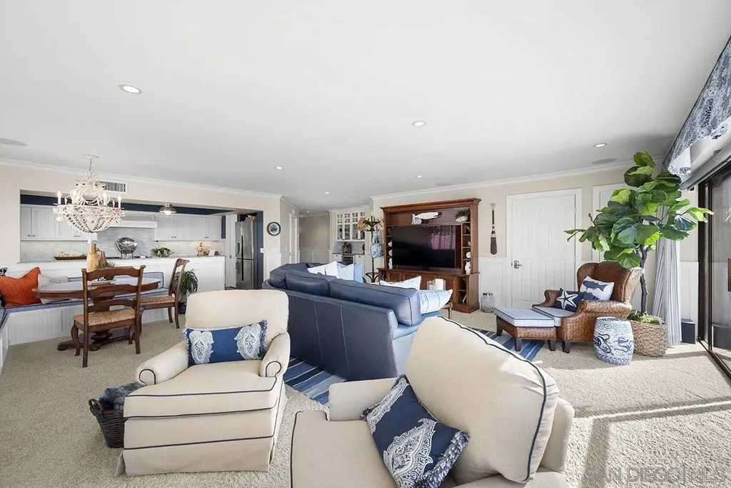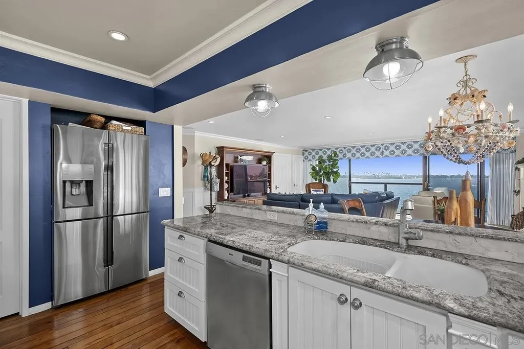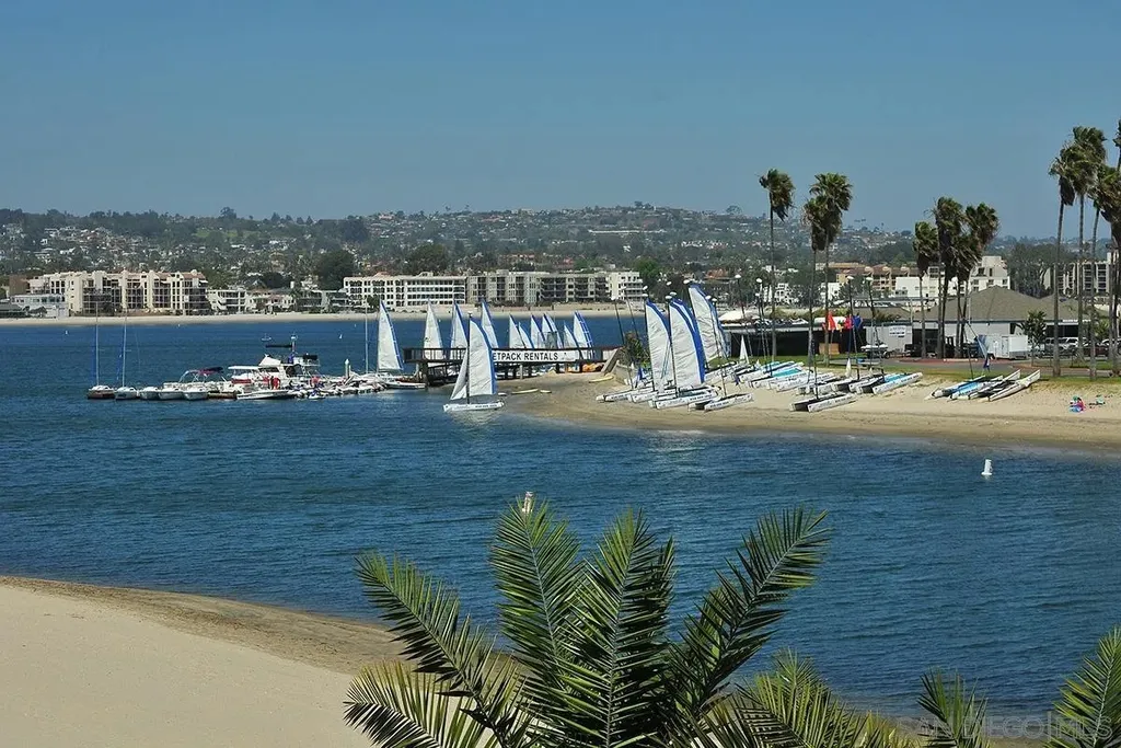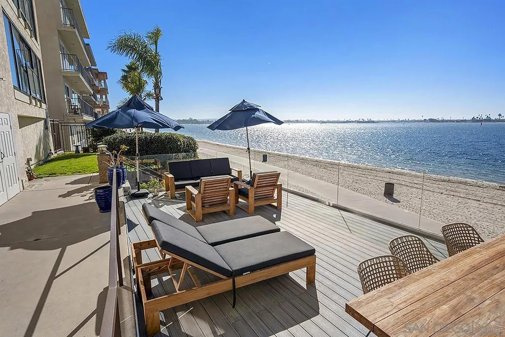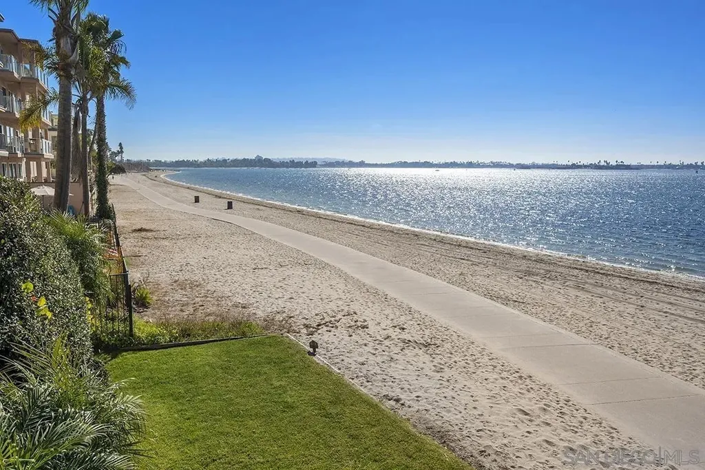 Breathtaking Mission Bay Retreat. This stunning 2-bedroom, 2-bathroom home offers unparalleled luxury with unobstructed, expansive views of Mission Bay! Thoughtfully upgraded throughout, this residence combines modern elegance with a serene beachside ambiance. Step into the heart of the home - a spacious, beautifully designed kitchen outfitted with a premium gas Wolf range and high-end appliances, perfect for the culinary enthusiast. The inviting living room boasts crown molding and a custom bar with a mini-fridge, creating the perfect space for gatherings or simply unwinding while enjoying the sweeping bay views. Open the impressive 20-ft of windows to let in the gentle coastal breeze and listen to the soothing sound of waves clapping along the shore - an experience that makes every moment feel like a vacation.Your private retreat awaits in the oversized primary suite, complete with a walk-in closet and a luxurious en suite bathroom featuring a separate soaking tub, walk-in shower, and dual vanities. A second generously sized bedroom and an additional upgraded bathroom offer comfort and versatility for guests or family. Situated in a prime location, this home provides not just a residence but a lifestyle, with Mission Bay's beauty as your backdrop.