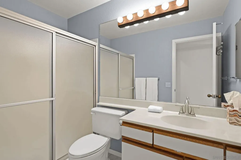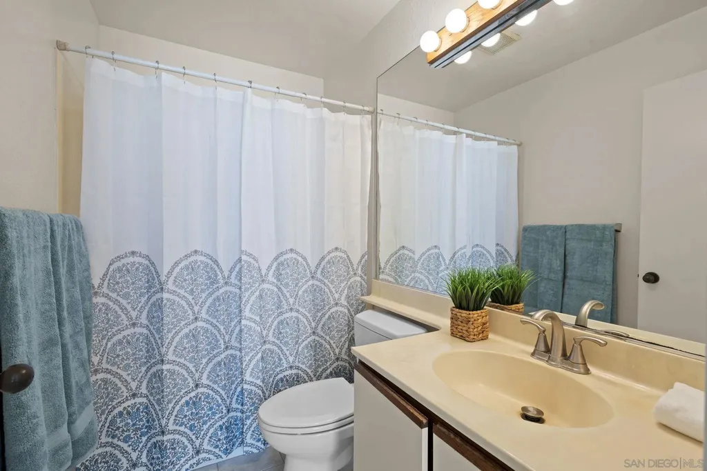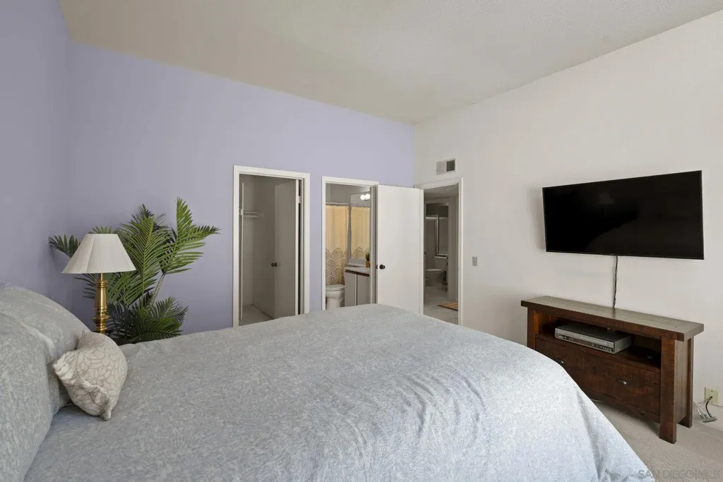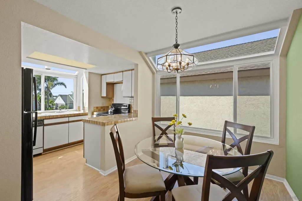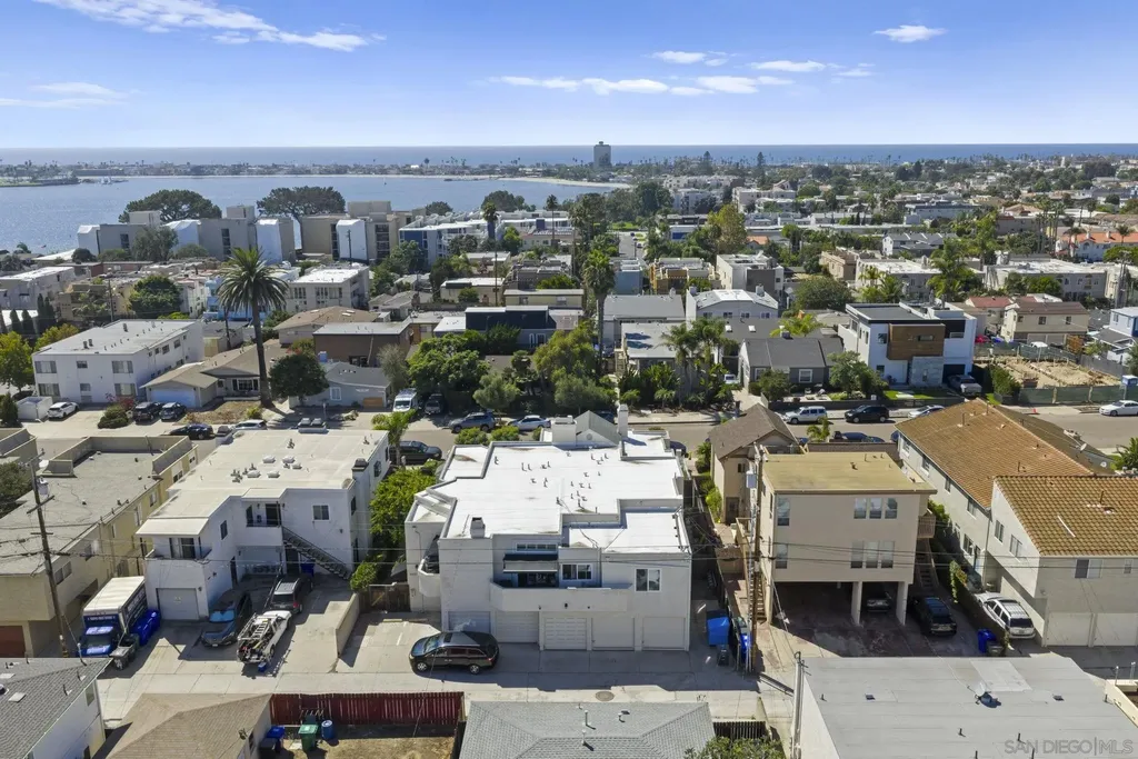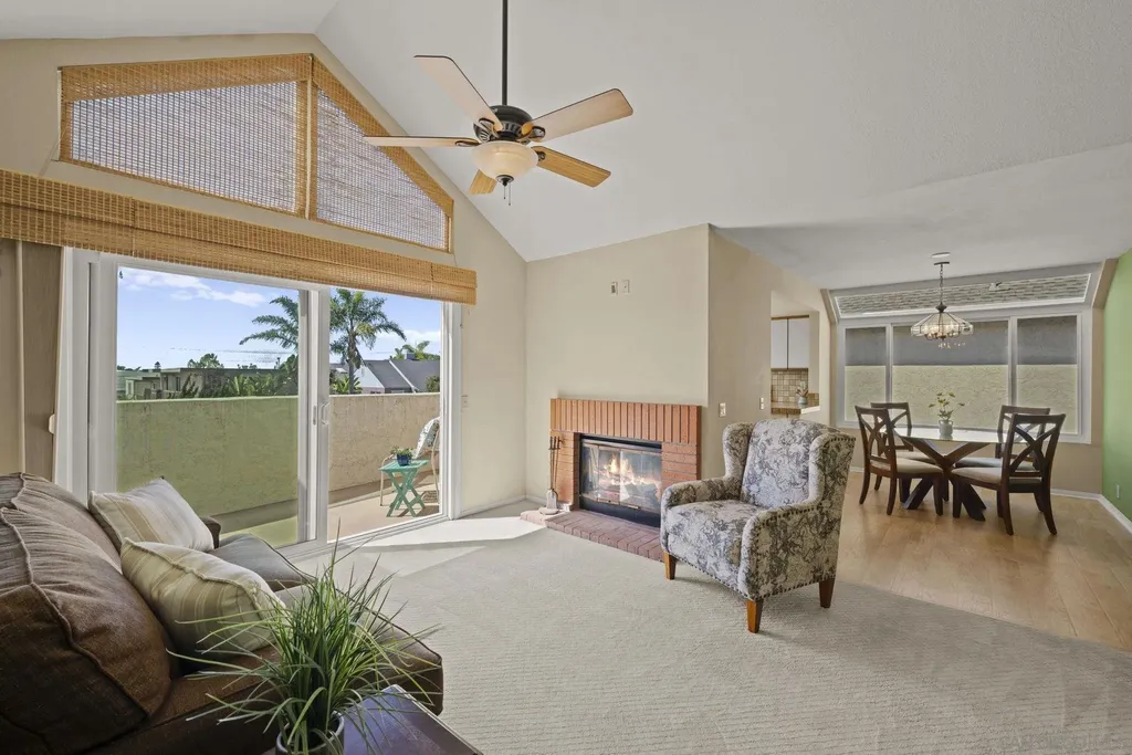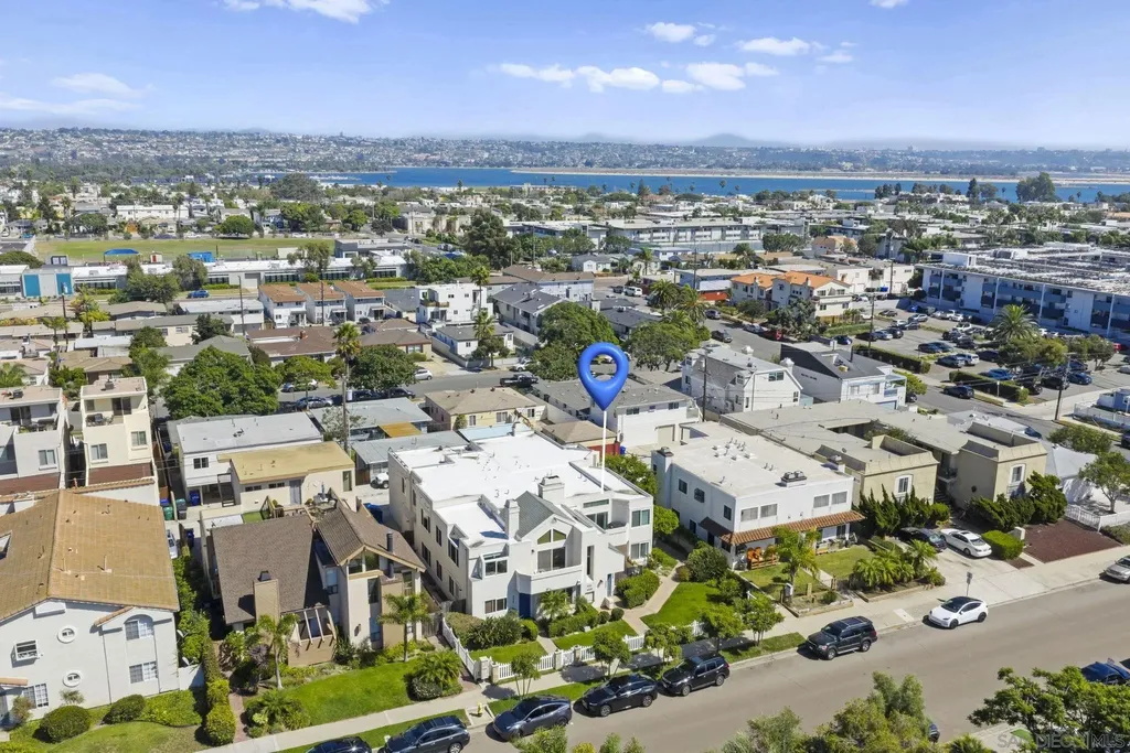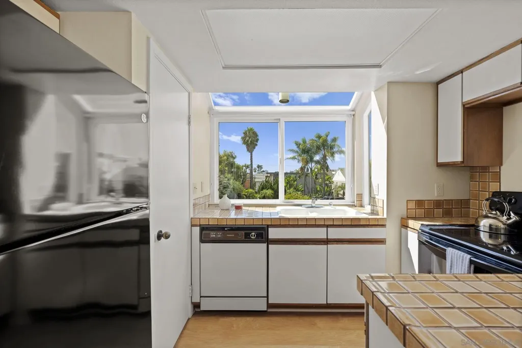 Nestled on a serene street just a stone's throw from Sail Bay, this sun-drenched 2-bedroom, 2-bathroom beach home offers the ease of single-story living. Vaulted ceilings and large windows create a light and bright ambiance throughout the open floor plan. Unwind on your private, west-facing balcony and enjoy a "peek-a-boo" view of Mission Bay. The private primary suite is a true retreat, featuring a full walk-in closet and ensuite bathroom. A walk-in pantry in the kitchen and built-in garage storage provide abundant space for your belongings. A full washer and dryer are conveniently located in the attached tandem two car garage.