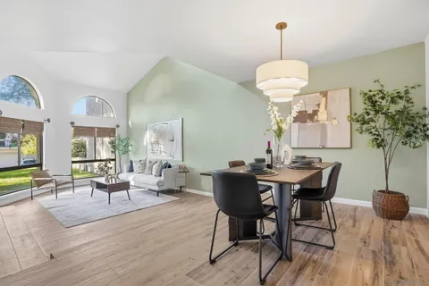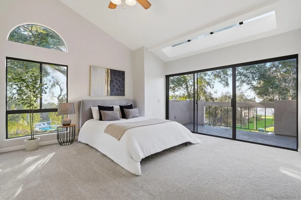 Discover modern elegance in this beautifully updated 1,913 sq. ft. residence located in the desirable Villa Dominique View Homes of Tierrasanta. Featuring 2 bedrooms, plus loft, and 2.5 bathrooms, this home has been mindfully maintained with a newer roof, fresh paint, and a gourmet kitchen remodel completed in 2020 featuring granite counters, new cabinetry, and stainless steel appliances. The interior makes a striking impression with 20ft high ceilings and an open-flow design highlighted by a stacked stone fireplace and wood-look porcelain tile flooring. A versatile primary suite includes an additional vaulted ceiling and a dedicated loft/office space, a wet bar, and a private balcony, while the main level opens to a patio off the family room for seamless indoor-outdoor living and a striking Westerly view. High-end details abound, including brand-new carpet, elegant chandeliers, and a reverse osmosis water filtration system. This FHA and VA-approved property offers the security of a 2-car attached garage with direct entry and access to a community pool and spa. Situated in a quiet building of only four units, this turnkey home perfectly balances architectural character with contemporary luxury in a prime San Diego location with access to 8000 acres of Mission Trails Region Park just steps from the front door.