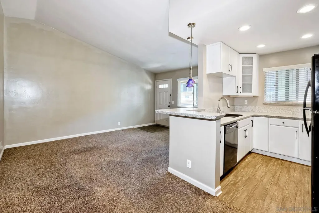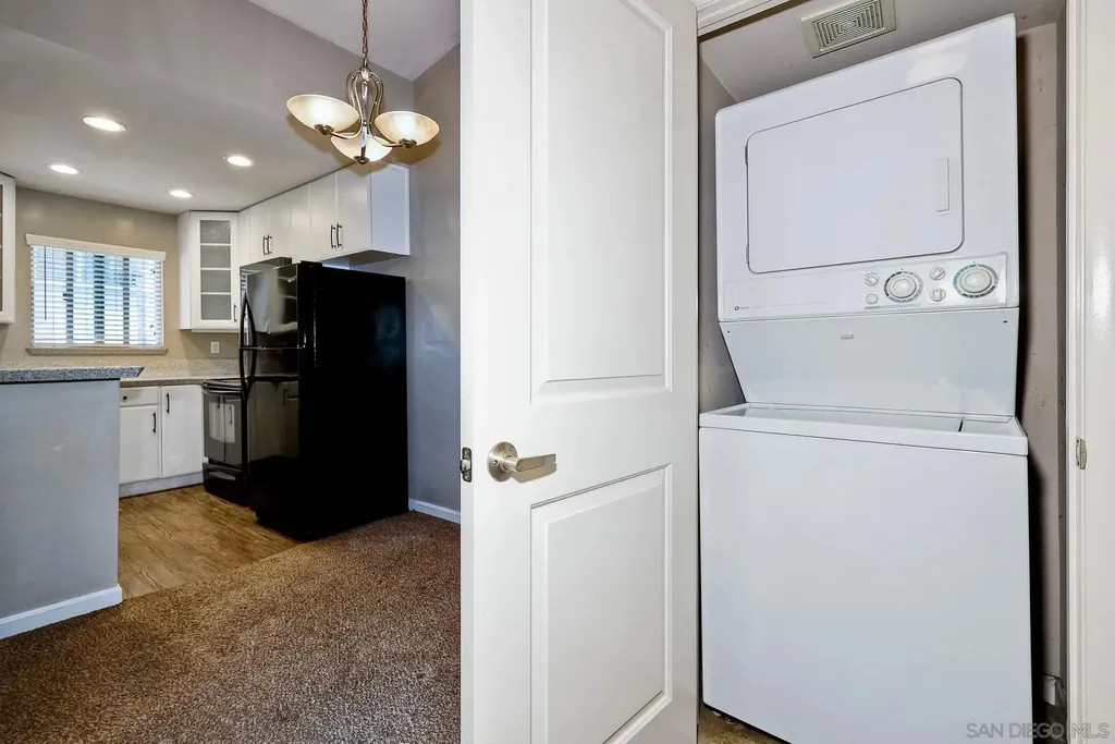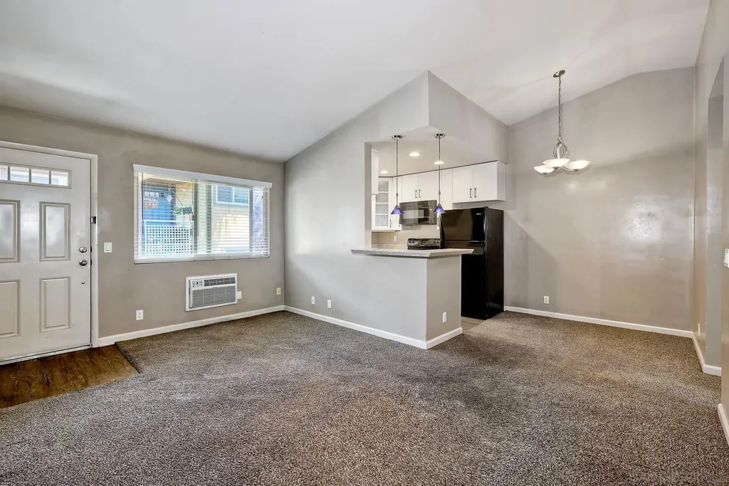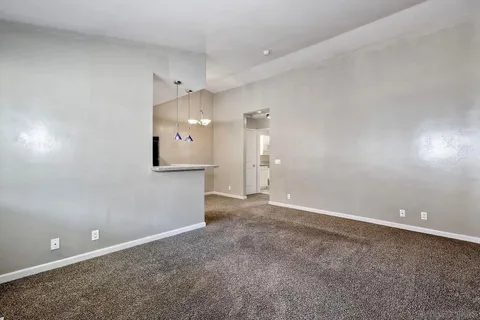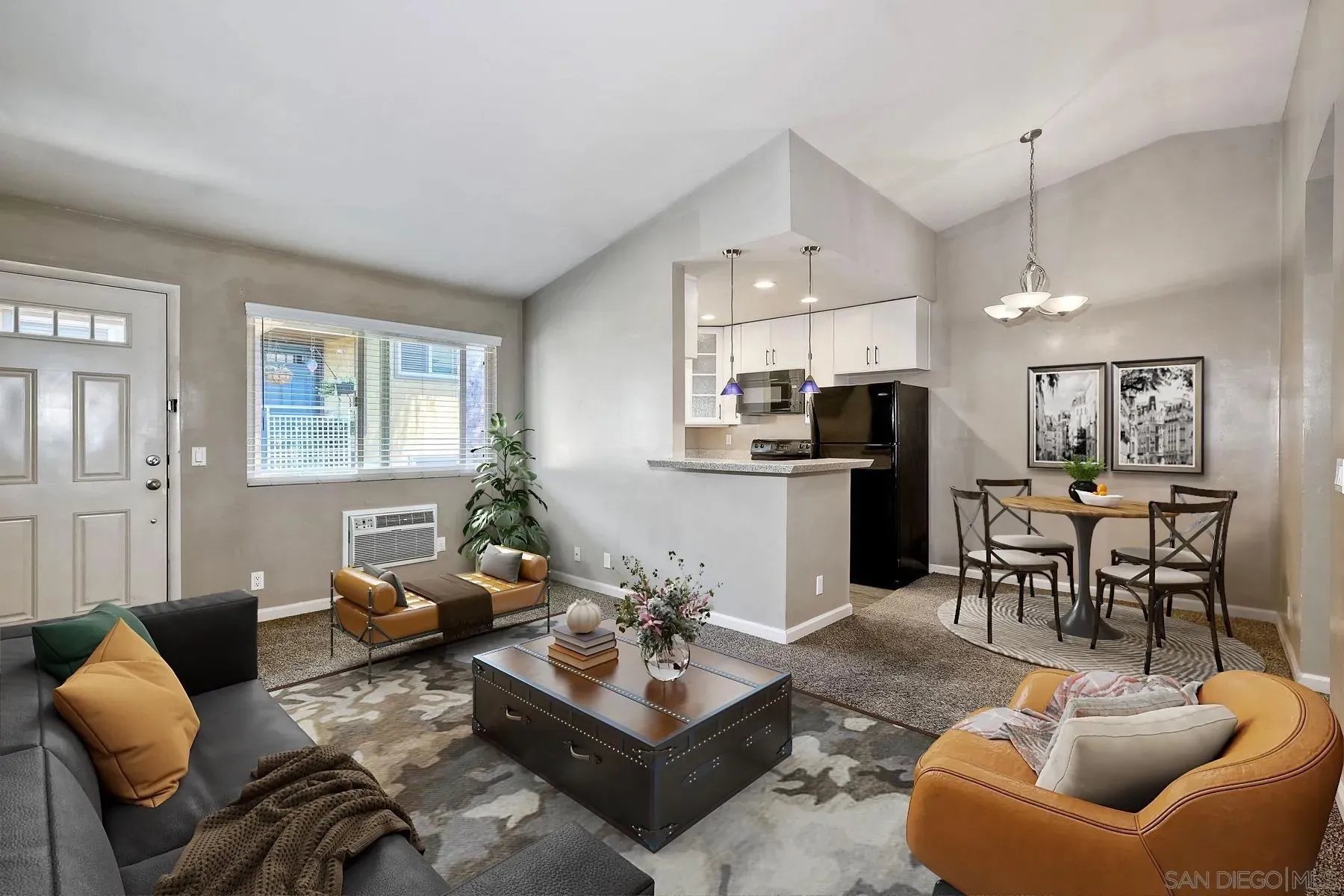 This charming upstairs unit boasts a spacious 1-bedroom, 1-bath open concept layout. Enjoy the airy feel of vaulted ceilings and the convenience of indoor laundry with a full-size washer and dryer included. The unit features air conditioning and a one-car garage. The gated complex is in close proximity to San Diego State, shopping, and dining.