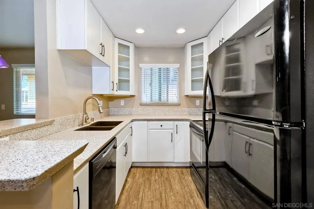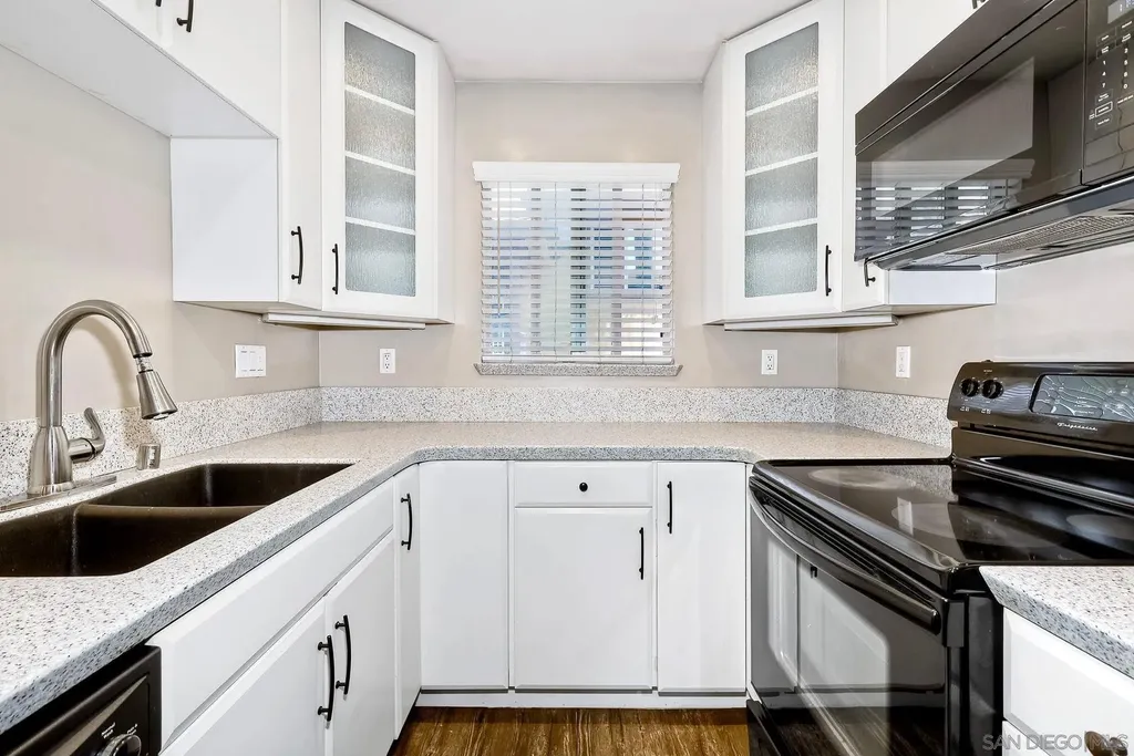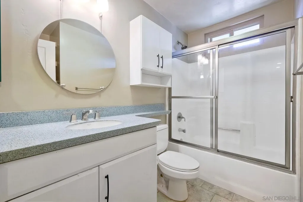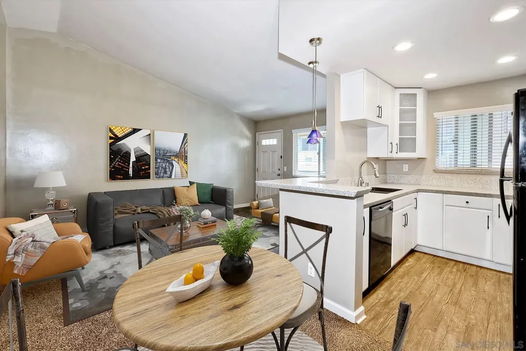 This charming upstairs unit boasts a spacious 1-bedroom, 1-bath open concept layout. Enjoy the airy feel of vaulted ceilings and the convenience of indoor laundry with a full-size washer and dryer included. The unit features air conditioning and a one-car garage. The gated complex is in close proximity to San Diego State, shopping, and dining.