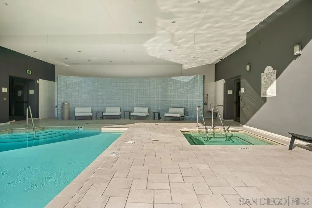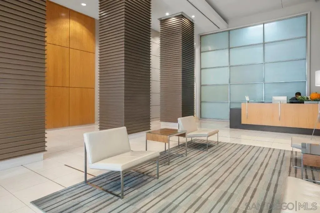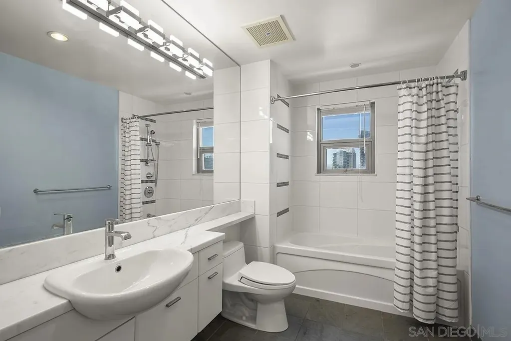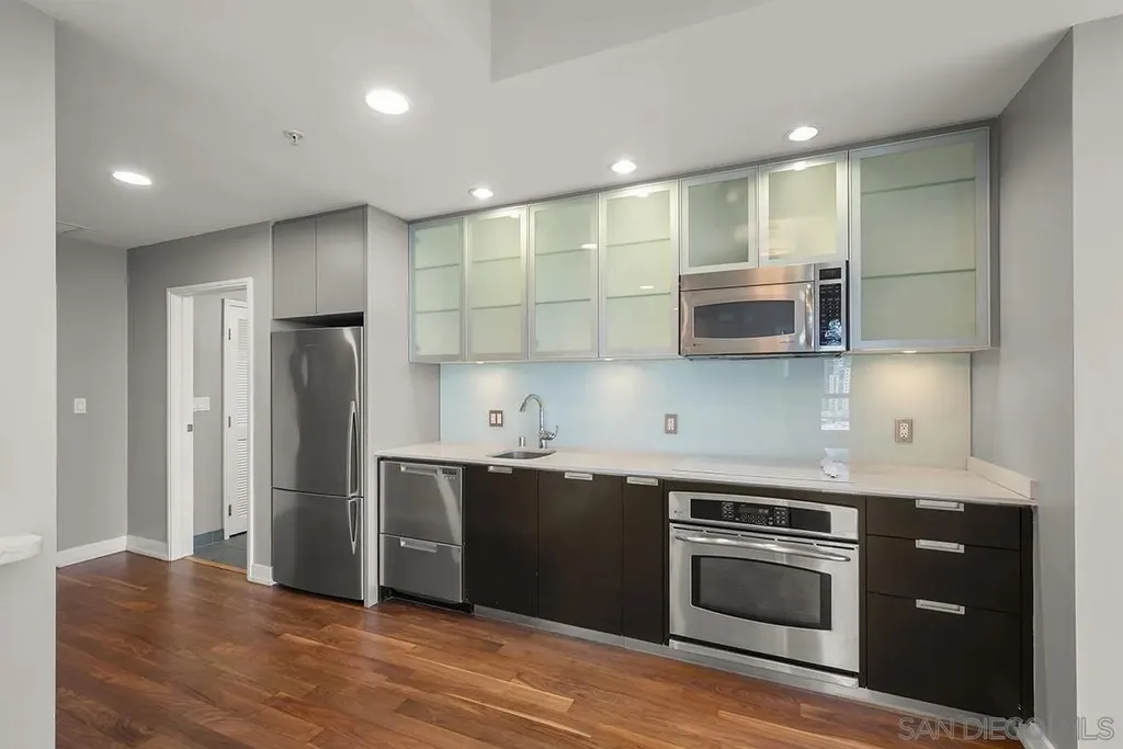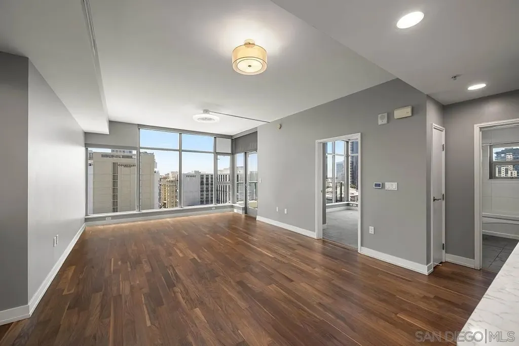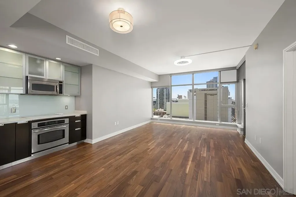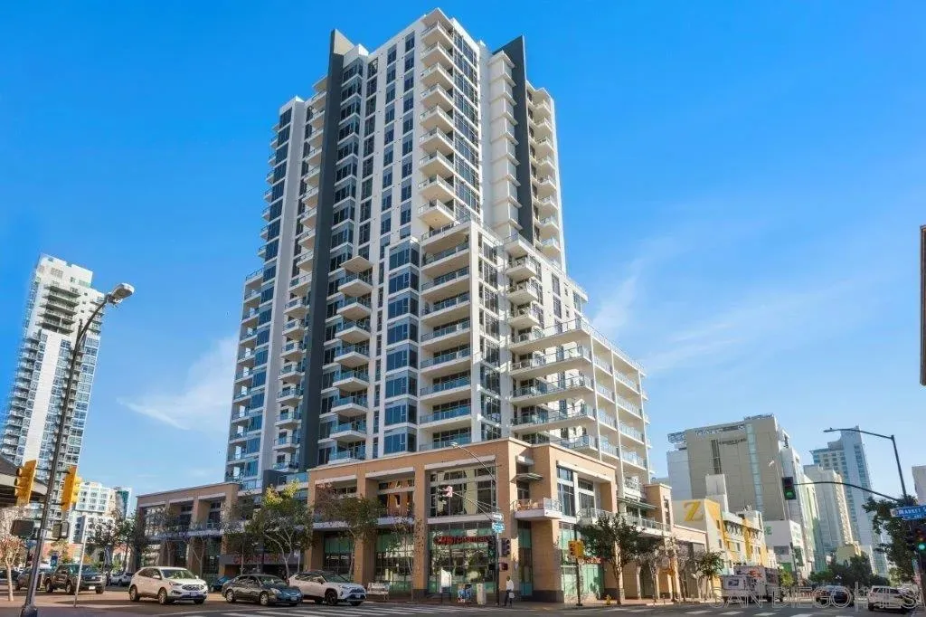 Welcome to your perfect perch in the sky! This highly sought-after southwest corner residence at Alta delivers awesome panoramic views of the San Diego Bay, Point Loma, and the glittering Downtown skyline. With freshly refinished wood floors, the open floor plan is framed by expansive windows offering natural light, a sleek kitchen with stainless appliances, modern cabinetry with frosted glass accents plus a one-of-a kind custom built-in buffet featuring cabinets, drawers; all with quartz counters. Both bedrooms include beautiful views, ceiling fans, and organized closets with frosted glass doors. The bathrooms feature marble countertops and slate tile flooring for a clean, modern finish. Additional features include an in-unit washer/dryer, powder room, storage cage, and a secured parking space, everything you need for effortless urban living. Alta is a building as unique as you are with distinctive architecture by Perkins and Company. Perfect for the active Downtown dweller, residents can take advantage of a 50' indoor/outdoor pool, spa, large fitness center, and a luxe communal club room with home theater and pool table. Additionally, Alta prides itself on featuring energy efficient appliances and mechanical systems for lower utility costs. Top-notch amenities, fabulous design, and professional, on-site community management combine for one of the best HOA values in all of Downtown San Diego! Situated in East Village on the edge of the city's historic Gaslamp Quarter, enjoy a premium location only steps away from Petco Park and convenient access to endless shopping, dining options, and night life.