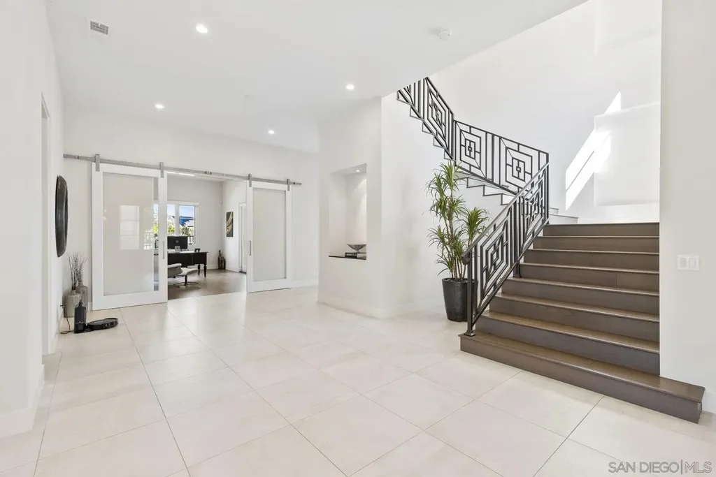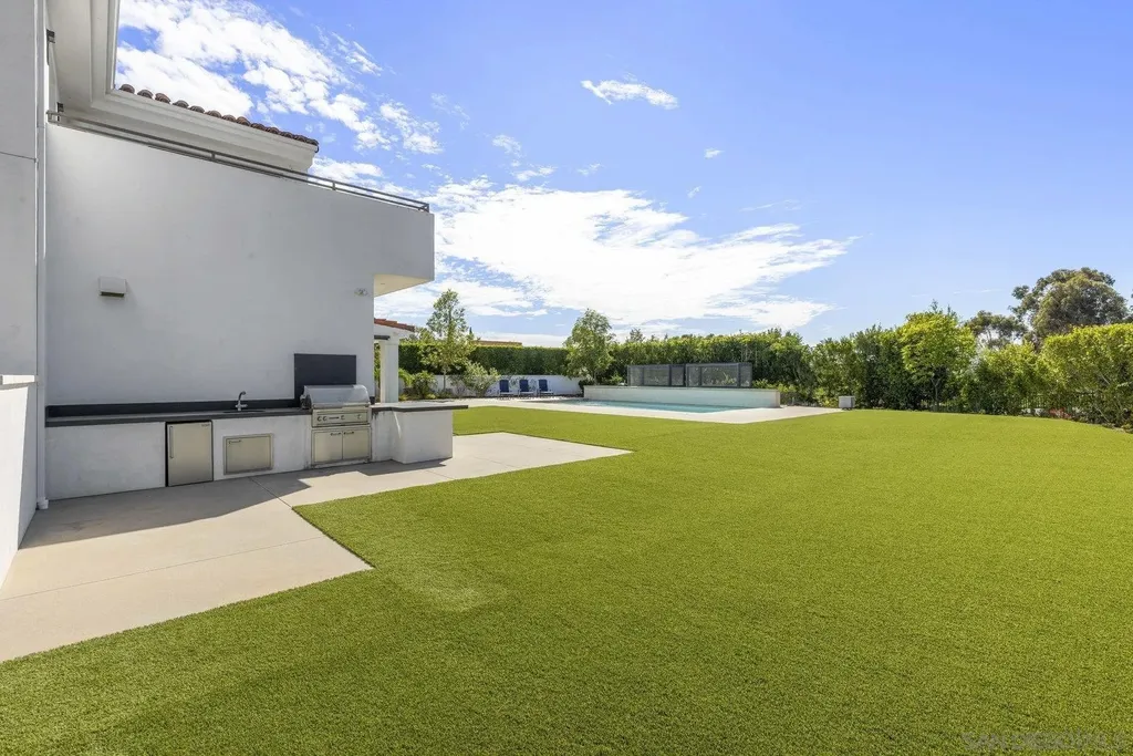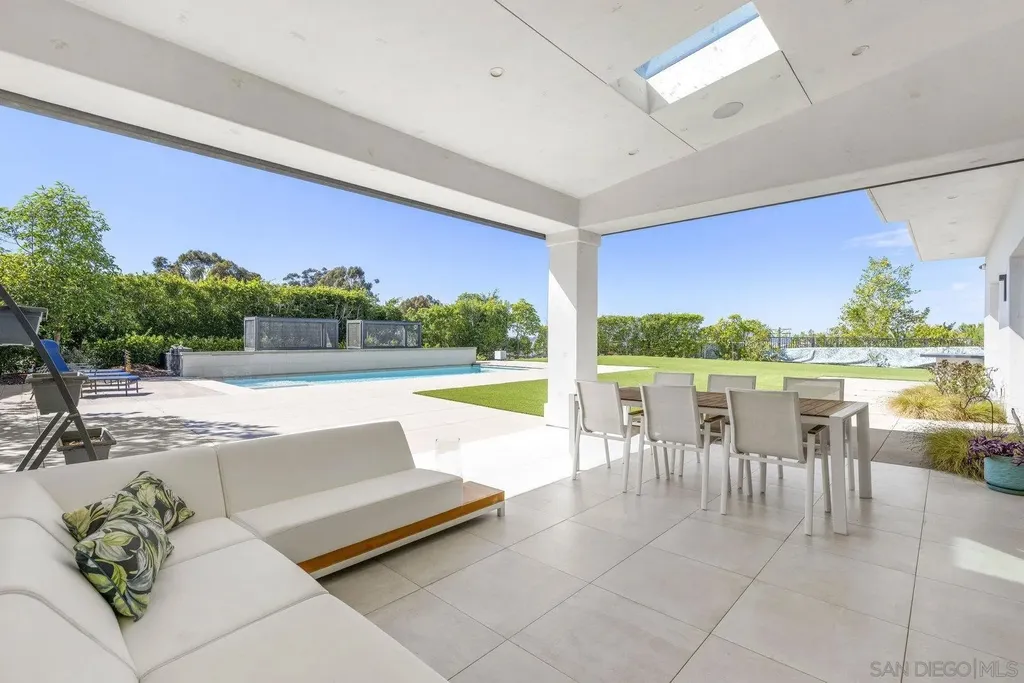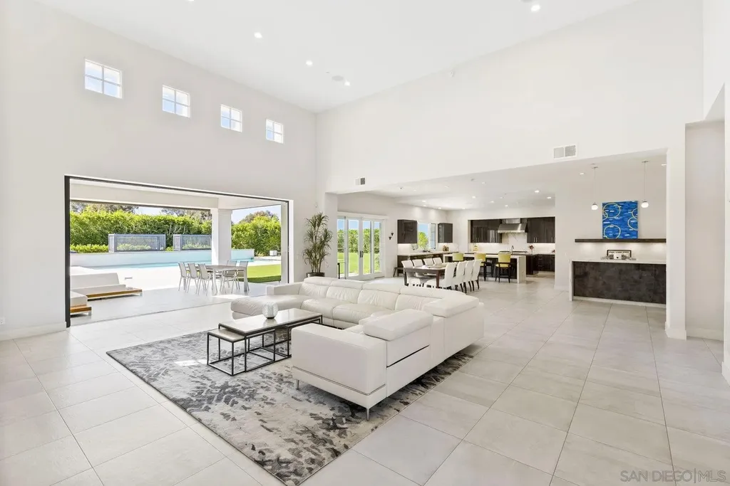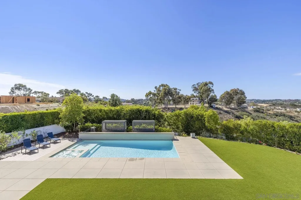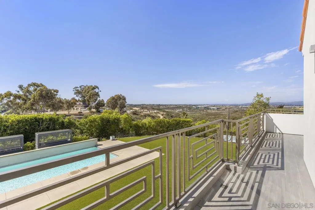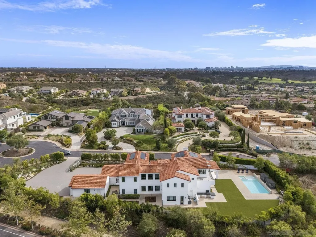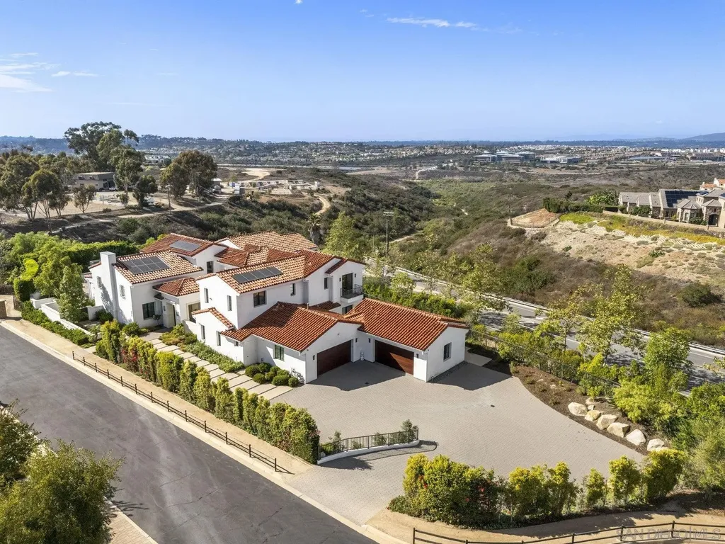 This spectacular Spanish Contemporary estate offers 7,016 SF of modern luxury on nearly an acre in the gated enclave of The Ridge Estates in Del Mar Mesa. Thoughtfully designed with extraordinary attention to detail, the home features 5 spacious ensuite bedrooms plus an office with full bath (optional 6th bedroom). A seamless blend of modern design and eco-conscious materials creates a sophisticated yet comfortable retreat. Floor-to-ceiling cantina doors open to true indoor-outdoor living: a covered loggia, sparkling pool, expansive turf play area, outdoor kitchen, and privacy hedges. The chef's kitchen boasts Thermador appliances, dual islands, and a walk-in pantry. The primary suite offers a spa-inspired bathroom, elegant custom closet system, sleek fireplace, and private deck with 180 panoramic northern and westerly views. Additional highlights include rooftop solar, a 4-car garage with epoxy floors and abundant storage, soaring ceilings, oversized hallways, and designer finishes throughout. Nestled among Del Mar Mesa's rolling landscapes yet just minutes from shopping, dining, and freeway access, this rare estate combines elegance, privacy, and breathtaking views - defining luxury living in North County San Diego.
