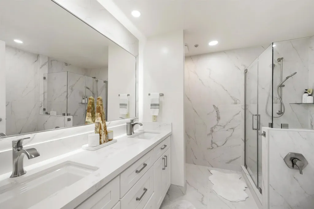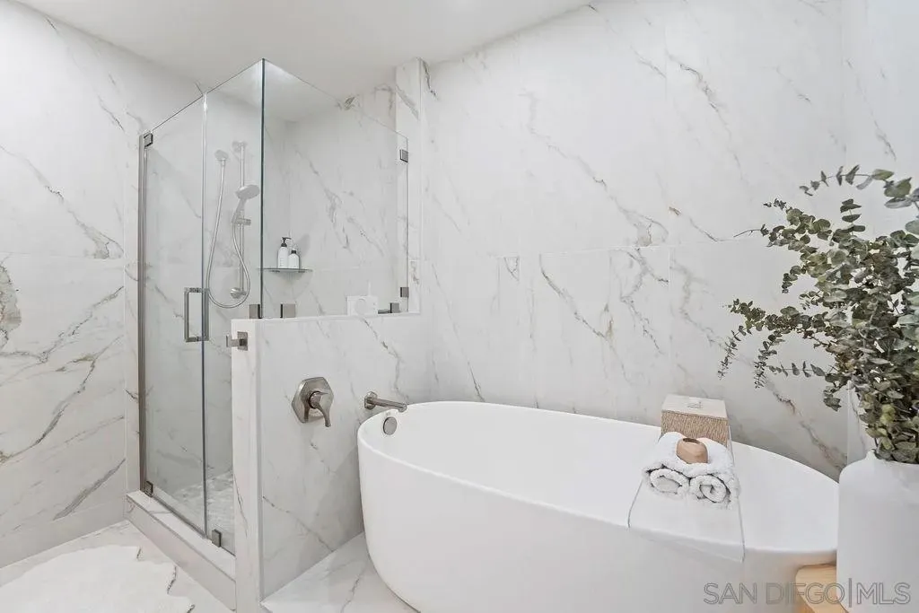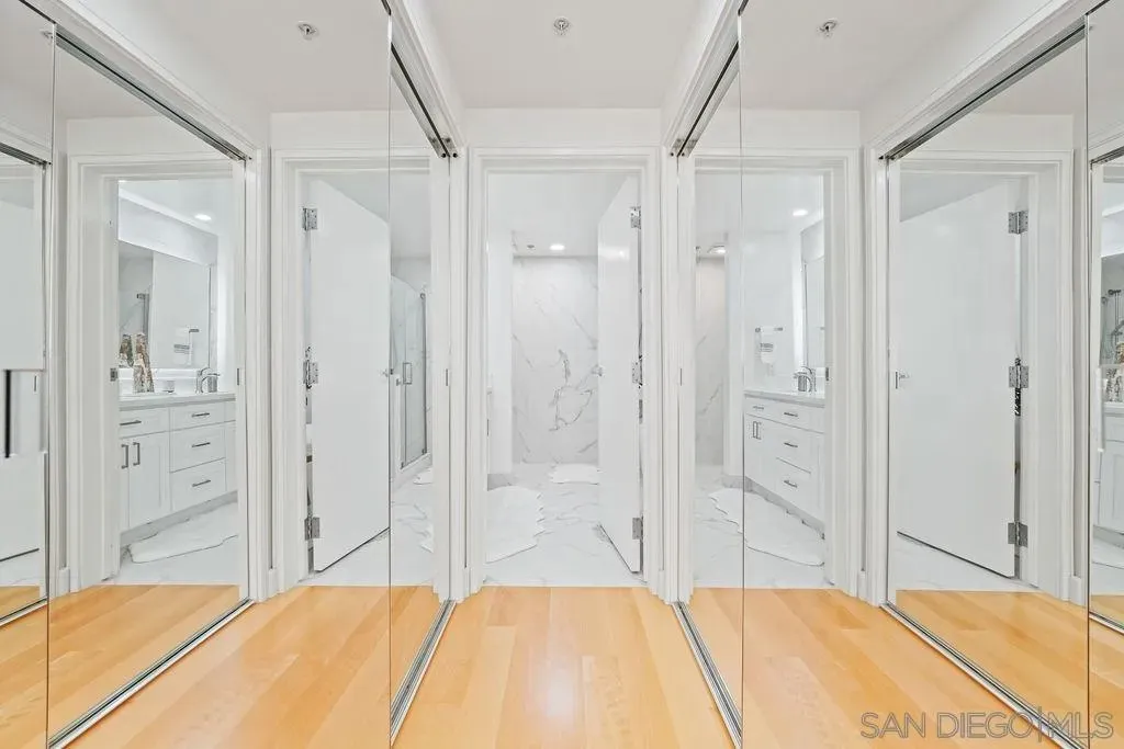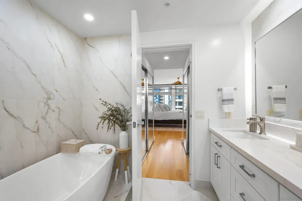 Experience elevated urban luxury in the heart of Downtown San Diego's prestigious Marina District. This impeccably remodeled 3-bedroom, 3-bath residence is a rare find in the South Tower of Renaissance. Perched on the 12th floor, the home offers water views and abundant natural light through floor-to-ceiling windows, creating a seamless connection between vibrant city living and refined comfort. Completely reimagined kitchen, with rare natural granite, a Bosch paneled dishwasher, Sub-Zero paneled refrigerator, Hestan professional power range, and a custom bar area with Perlick double-drawer fridge and wine fridge. Additional highlights include maple hardwood floors throughout, a Samsung Frame TV with surround sound, and maple LVP flooring on the exterior deck. The Primary Suite impresses with a fully renovated spa-inspired bath featuring a freestanding tub, expanded walk-in shower, new cabinetry, and designer fixtures. The Junior Suite and third bath have also been transformed with custom showers in place of tubs, stylish new vanities, premium fixtures, and striking 24x48 porcelain slab tile. Practical luxury completes the home with two prime parking spaces (one extra-wide, one wide both with easy access) and a large storage locker with bonus storage, possibly the largest in the building. A Statement of Luxury in the Marina District. Perched high on the 12th floor of Renaissance's coveted South Tower, this rare 3-bedroom, 3-bath masterpiece sets a new standard for downtown living. Walls of glass frame sweeping water views, flooding the home with natural light and blurring the line between cosmopolitan energy and private retreat. Completely reimagined kitchen with expanded counters draped in rare natural granite, a Bosch paneled dishwasher, Sub-Zero paneled refrigerator, and a Hestan professional power range. A custom bar with Perlick double-drawer fridge and wine fridge elevates every gathering. Maple hardwood floors lead you through spacious living areas designed for both entertaining and everyday elegance, enhanced by a Samsung Frame TV with surround sound and an exterior deck finished in maple LVP flooring. The Primary Suite is a spa-like sanctuary, boasting a freestanding soaking tub, expanded shower, custom cabinetry, and designer fixtures. The Junior Suite and third bath echo the same level of sophistication with sleek custom showers, new vanities, premium fixtures, and dramatic 24x48 porcelain slab tile. Every detail speaks of convenience and exclusivity: two prime parking spaces (one extra-wide, one wide - both with easy access) and a massive storage locker with bonus space, unmatched in the building. This is more than a home, it's a statement!
