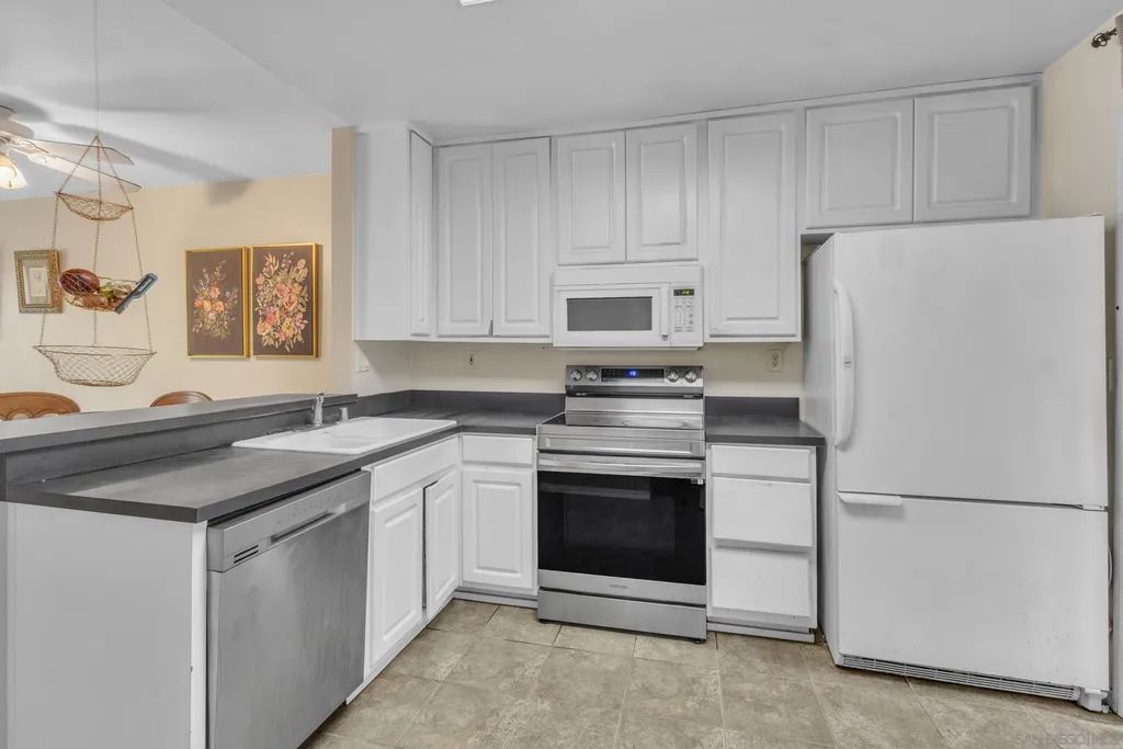 Discover this beautifully designed 2-bedroom, 1-bathroom condominium in the highly sought-after Carefree community of San Carlos. This residence features an inviting open-concept layout that seamlessly integrates the kitchen, living room, and dining area, perfect for modern living and entertaining. Key Features: - Contemporary Kitchen: With original cabinetry and a breakfast bar that seats two, this kitchen balances style and functionality for casual meals. - Prime Location: Situated near Cowles Mountain and Mission Trails, this home offers excellent access to outdoor activities for nature enthusiasts. - End Unit Privacy: Enjoy the benefits of an end unit that provides enhanced privacy along with a spacious private patio, ideal for relaxation and gatherings. - Convenient Parking: The property includes a one-car attached garage and an assigned parking space for added convenience. - Resort-Style Amenities: Residents can take advantage of a gated swimming pool, recreational areas, playgrounds, sports courts, and BBQ facilities. This exceptional condominium offers a unique chance to embrace a vibrant lifestyle in a welcoming community. Don't miss your opportunity to make this property your new home!