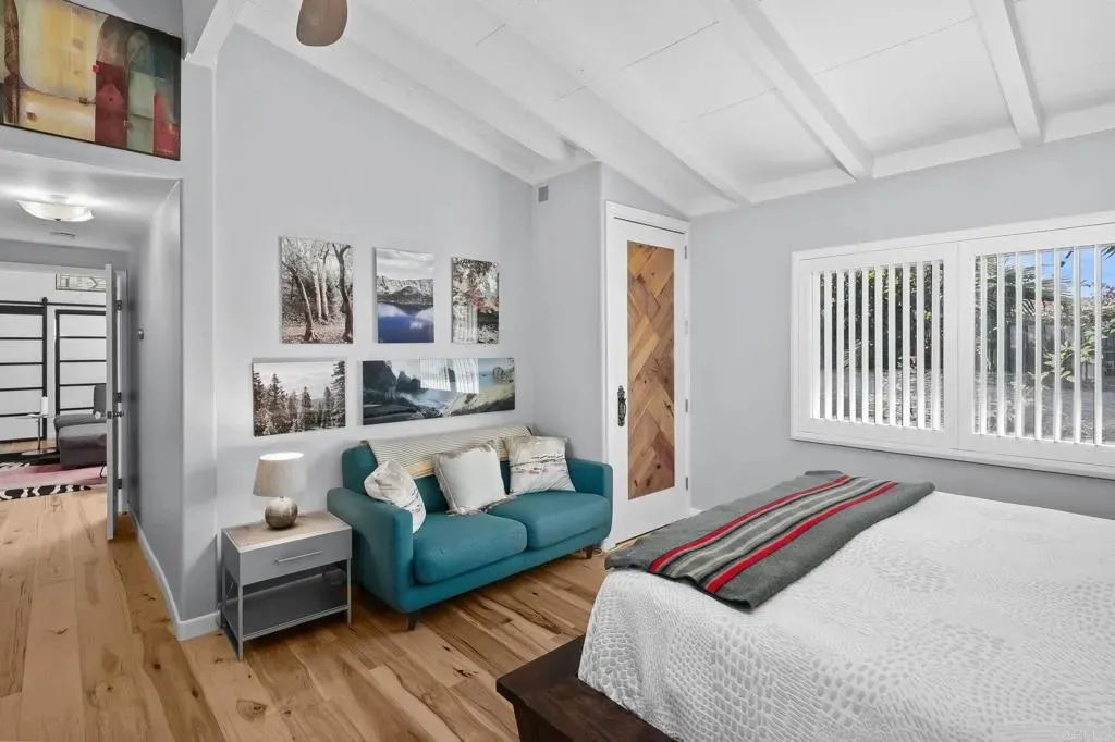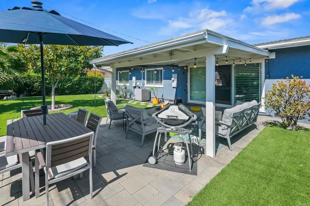 Beautifully updated light-filled home with vaulted ceilings - near schools, a shopping center, a community park/rec center and Mission Trails hiking area, with easy I-8 access. Recent enhancements include a new roof, outside house paint, epoxy garage floor and freshly painted garage walls. Newer gorgeous hickory hardwood floors throughout, with tile flooring in the 2 full bathrooms. Other features include plantation shutters, dual paned windows, fully owned solar (15 panels), indoor laundry space and newer furnace, A/C, water heater, plumbing, appliances and inside paint. Breaker box and most of electrical is less than 10 years old. The 3rd bedroom has been opened up, creating a spacious primary bedroom retreat. The wall could be reestablished for a 3rd bedroom if desired. The 2nd bedroom and bath are on the opposite side of the home from the primary suite, creating an ideal flow to the layout. The backyard is fenced and private, with low maintenance drip irrigation Xeriscape landscaping, newer blended turf (4 shades), and a covered patio with pavers. AT&T fiber internet already wired to the home. Come see this gem before it sells!