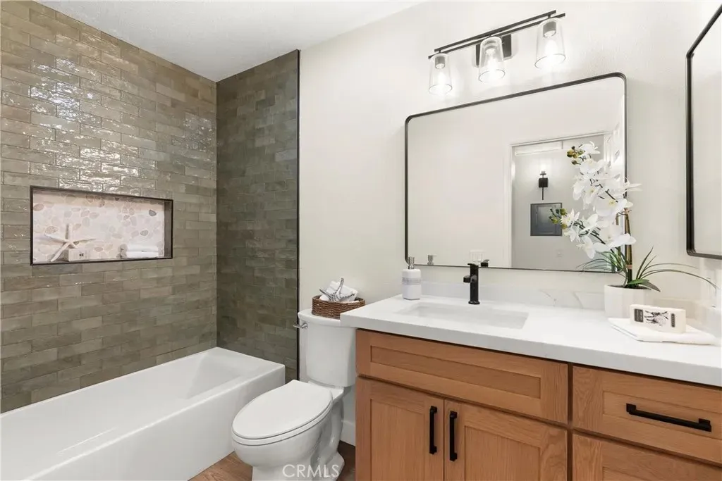 Welcome home to this stunningly reimagined 2-bedroom, 1.75-bath townhome in the highly sought-after Laurelwood Complex of Anaheim Hills. Perched as a desirable upper-level unit, this residence truly feels brand new, blending modern elegance with everyday comfort in a way thats both welcoming and refined. From the moment you step inside, youll notice the seamless luxury vinyl flooring, crisp new baseboards, and beautifully updated lighting throughout, creating a bright and cohesive space. The living area invites you to relax and unwind, centered around a custom tile gas fireplace that adds warmth, character, and a touch of sophistication. The fully remodeled kitchen and bathrooms are showstoppers, featuring custom natural oak cabinetry, gleaming quartz countertops, all-new stainless steel appliances, and designer tile workperfect for both daily living and entertaining. Thoughtfully designed for convenience, the home includes indoor laundry with both gas and electric dryer hookups, all-new blinds, and a private balconyan ideal spot to enjoy your morning coffee or evening breeze. Comfort is assured year-round with a newer HVAC system and newer water heater, offering peace of mind for years to come. The detached 2-car garage, located directly across the walkway from the stairs to the unit, provides ample storage, upgraded lighting, and a brand-new garage door with opener and keypada rare and valuable feature. Just steps from the community pool, this home delivers a resort-like feel in a quiet, beautifully maintained setting. Perfectly situated in one of Anaheim Hills most desirable communities, this turnkey townhome offers the ideal blend of style, comfort, and location. A rare opportunity to own a completely remodeled, move-in-ready home that truly has it all.