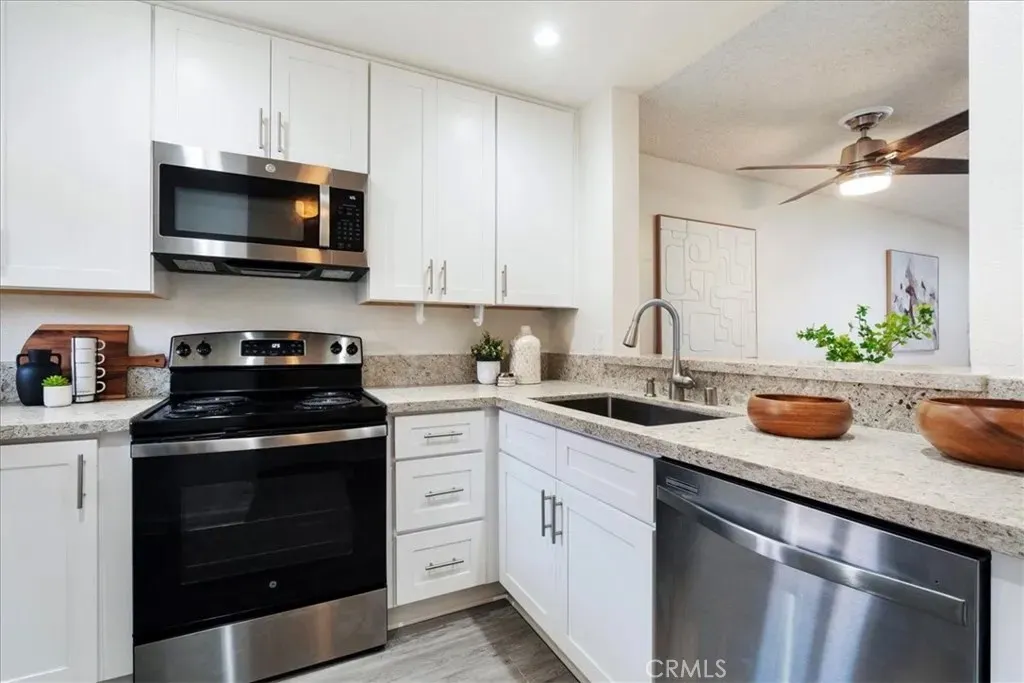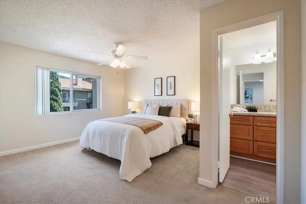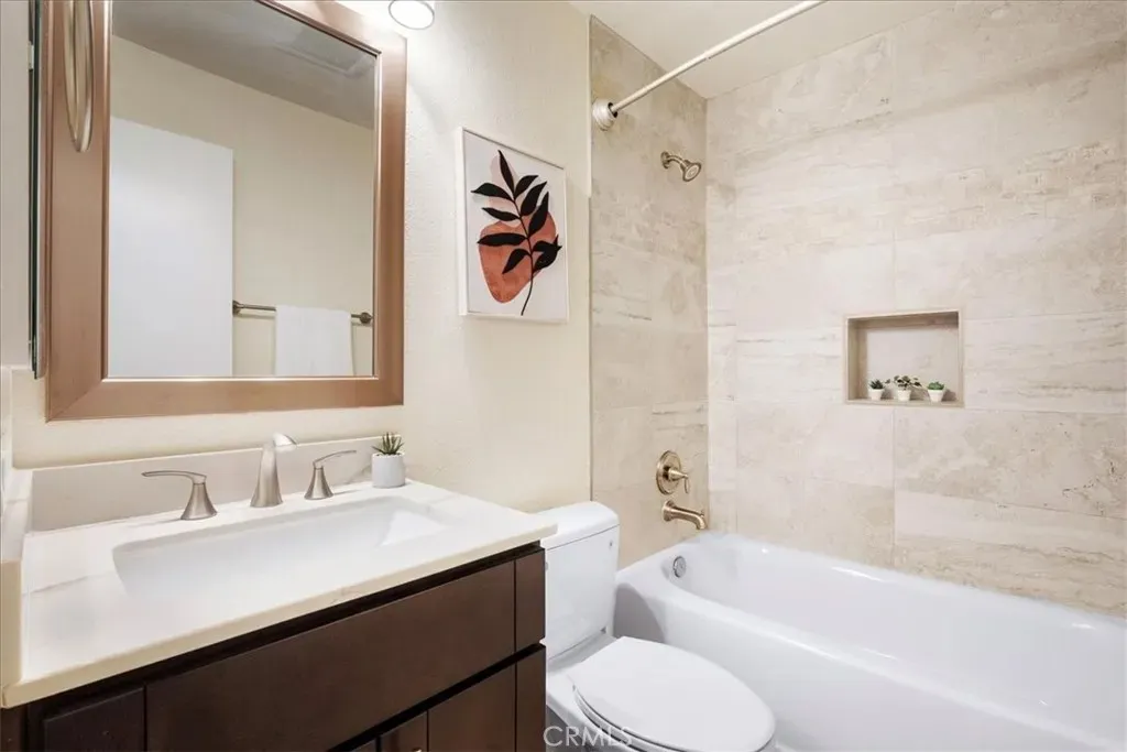 Move-in ready! 2-BR/2BA condo in the desirable Verano at La Jolla! Incredible location in the La Jolla Colony community featuring lush landscaping, friendly dog park, walking trails, and enjoy summer concerts. This immaculately upgraded Upper level unit features a Beautifully renovated kitchen with Quartz countertops, White shaker cabinets, and Stainless steel appliances including refrigerator with icemaker. The living space is spacious, light, bright and open with elegant Luxury Vinyl Plank Floors, recessed lighting, ceiling fan, and sliding glass door leading to nice size balcony with storage closet, perfect area to sit and relax. The primary bedroom includes a lighted walk-in closet and an en-suite remodeled bathroom with soaking tub & Porcelain wall tile. Recently remodeled second bathroom with Stunning Porcelain tile and soak bathtub. Additional highlights include dual pane windows, ceiling fans in both bedrooms, full size washer and dryer and 2 assigned underground gated parking spaces side by side. The Verano offers exceptional amenities, including two swimming pools and spas, sauna, fitness center, a cyber cafe, and BBQ areas. Easy access to UCSD, the UTC Mall, Restaurants and Shops, Trolley, I-5, and the world-famous La Jolla beaches. Don't miss this opportunity to make this delightful home yours!