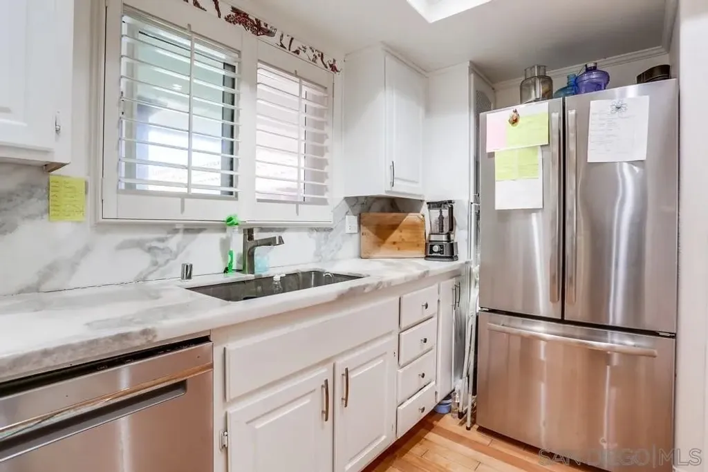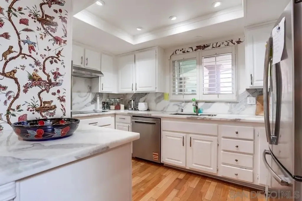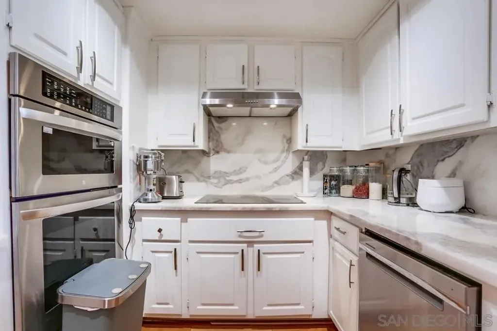 Contemporary 3BR/2BA condo in the heart of La Jolla Village offering hardwood floors, a quartz-finished chef's kitchen with stainless steel appliances, custom cabinetry, and recessed lighting. Bathrooms feature updated tile finishes, and the living room is anchored by a charming stone fireplace. Additional highlights include dual-pane windows, in-unit laundry, and two secured, side- by-side underground parking spaces with a lockable entry. This well-kept building offers a small gym, elevator access, and a dedicated storage room for each unit. HOA covers common area maintenance. Located just minutes to the beach, world-class dining, shops, CVS, and Pavilions. The La Jolla Library sits directly behind the property, with the La Jolla Recreation and Tennis Center nearby. A rare opportunity to enjoy prime Village living with modern upgrades, secure parking, and unmatched walkability.