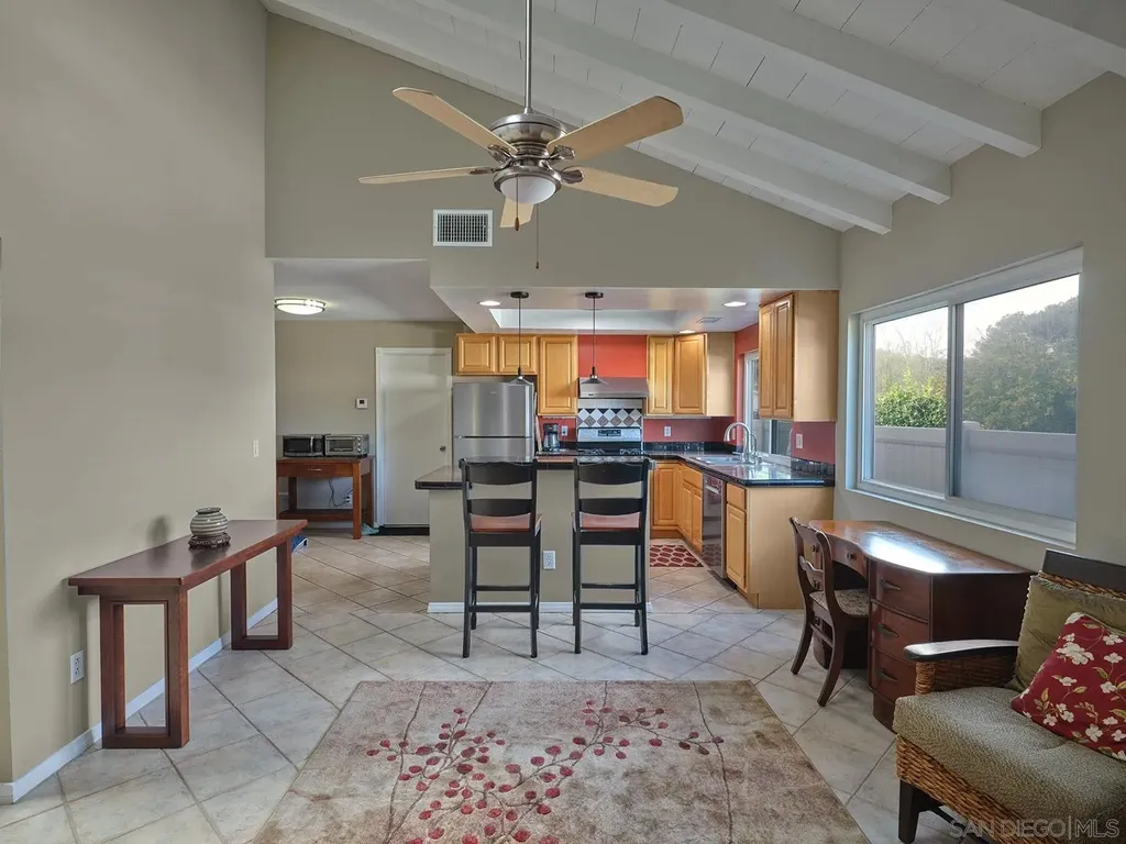 This well-maintained, move in ready home is located on a quiet street in the desirable San Carlos neighborhood. Walk to Mission Trails Park. Single Story with vaulted ceilings, open Kitchen with granite tile breakfast bar, pendant lighting, stainless Steel appliances. Large Family Room w/fireplace and French doors to the Patio and lush backyard. Beautiful Landscaping. Mountain views from kitchen and living room, Backyard is perfect for entertaining. Private yard no neighbors behind, open space. Large patio, terraced bank with fruit trees. Synthetic Turf. Newer HVAC, some newer appliances. Whole House Fan too. City of San Diego but bordered by Nature. Mission Trails Park offers hiking, mountain biking, Visitor Center. Close to Lake Murray, Cowles Mountain. All this outdoor beauty yet minutes to downtown, Mission Bay, Beaches and more.