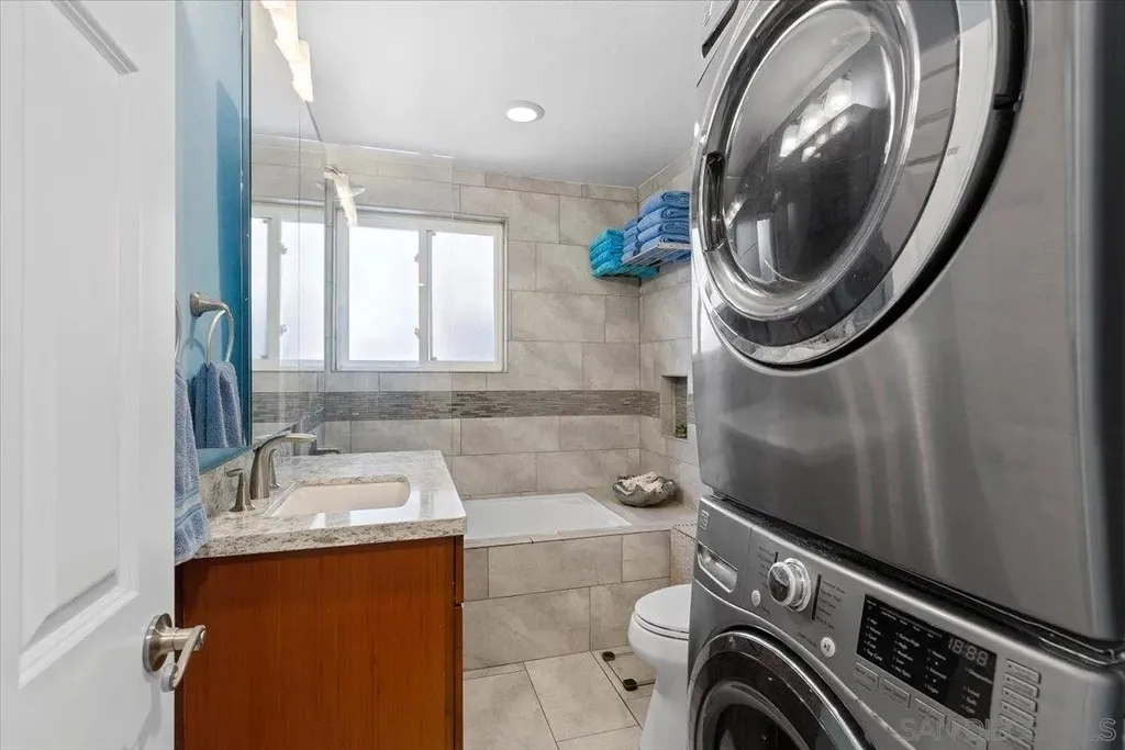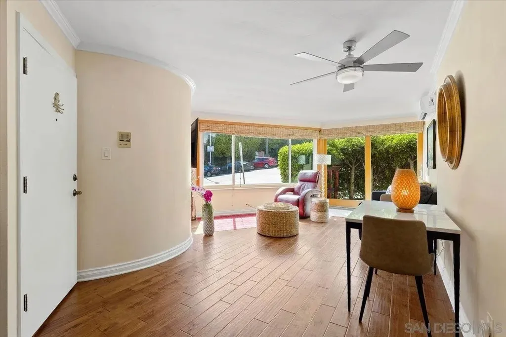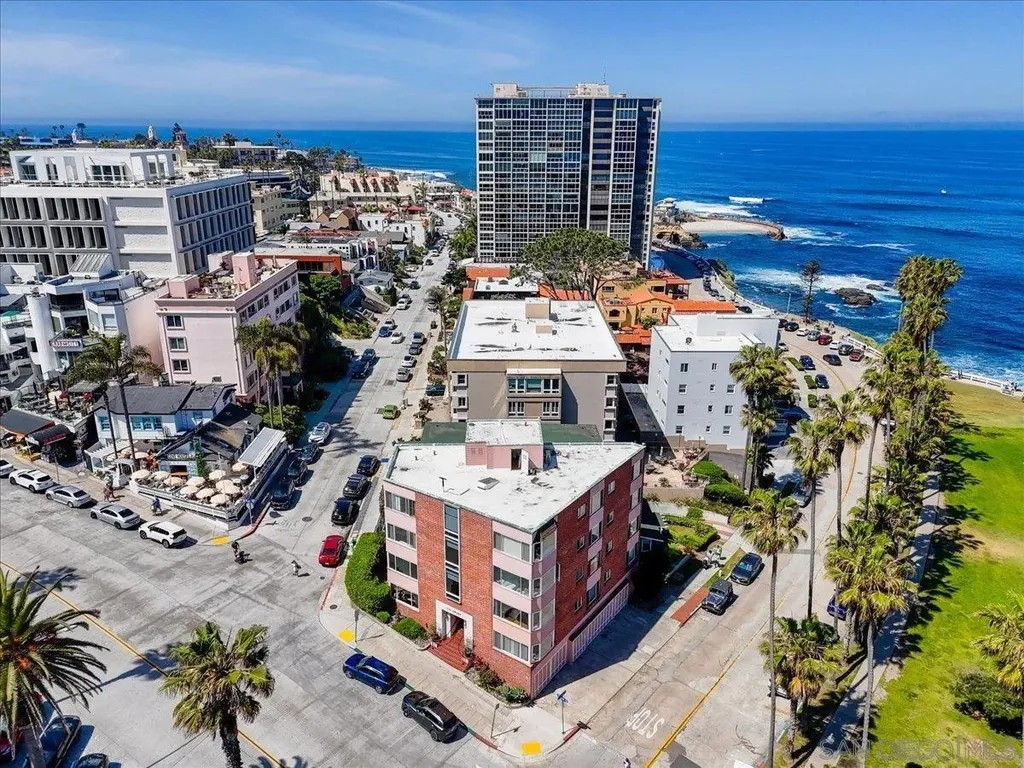 Spectacular location, in the heart of La Jolla Village, this perfectly situated, first floor condominium is just steps from renowned restaurants, boutique shops, world class art galleries and a multitude of coastal attractions. Stepping inside the architecturally unique, curvilinear entry way you are immediately greeted by the open concept living, dining, kitchen, great room with sliding doors that lead you to the common patio/garden space, surrounded by tall ficus trees for privacy. Living space features wall-to-wall picture window to enjoy your quintessential La Jolla coastal views, including the iconic La Valencia Hotel, and the classic palm tree lined Coast Walk that graces Ellen Browning Scripps Park, all of this plus views of the blue Pacific Ocean all the way up the coast past the bluffs of Blacks Beach. Large windows in each room let in the natural sunlight. Hardwood flooring in the main areas and carpet in the bedrooms. Kitchen features stainless appliances, dual corner sinks, electric stove, and spacious pantry. Stacked washer and dryer in unit. 2 mini-split systems for immediate cooling and heating, and an additional 3 ceiling fans. Don't pass up this opportunity to be on a vacation 24/7, 365 days a year!