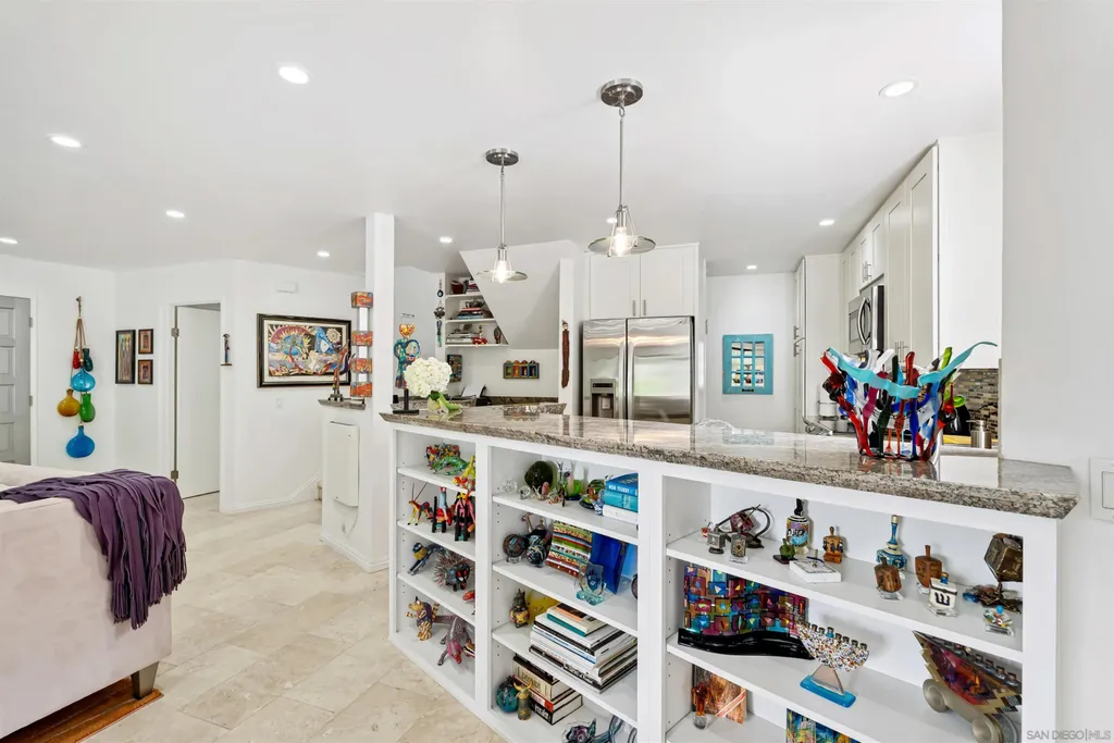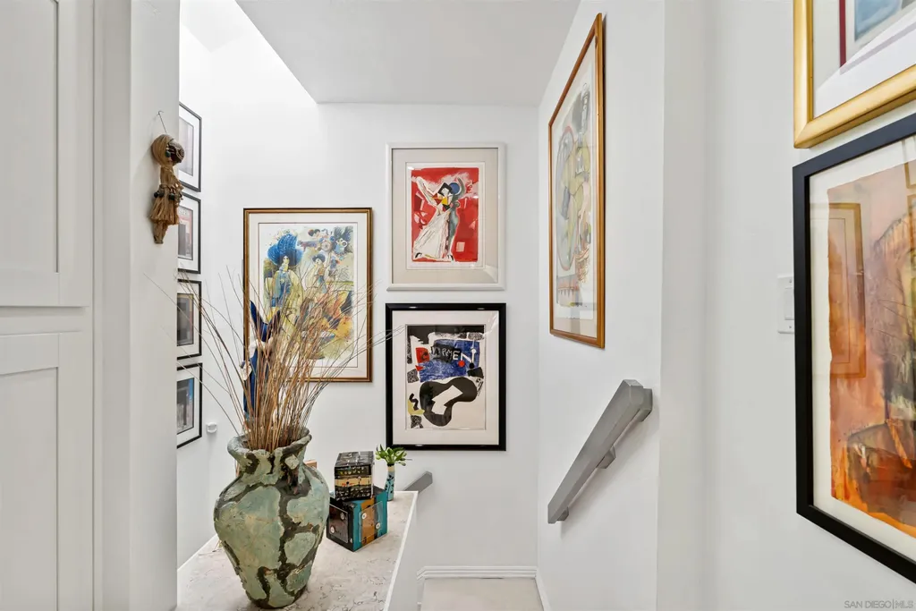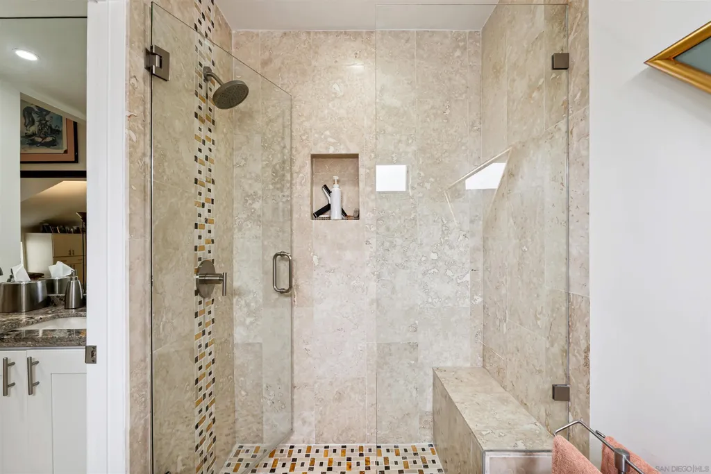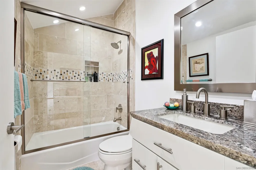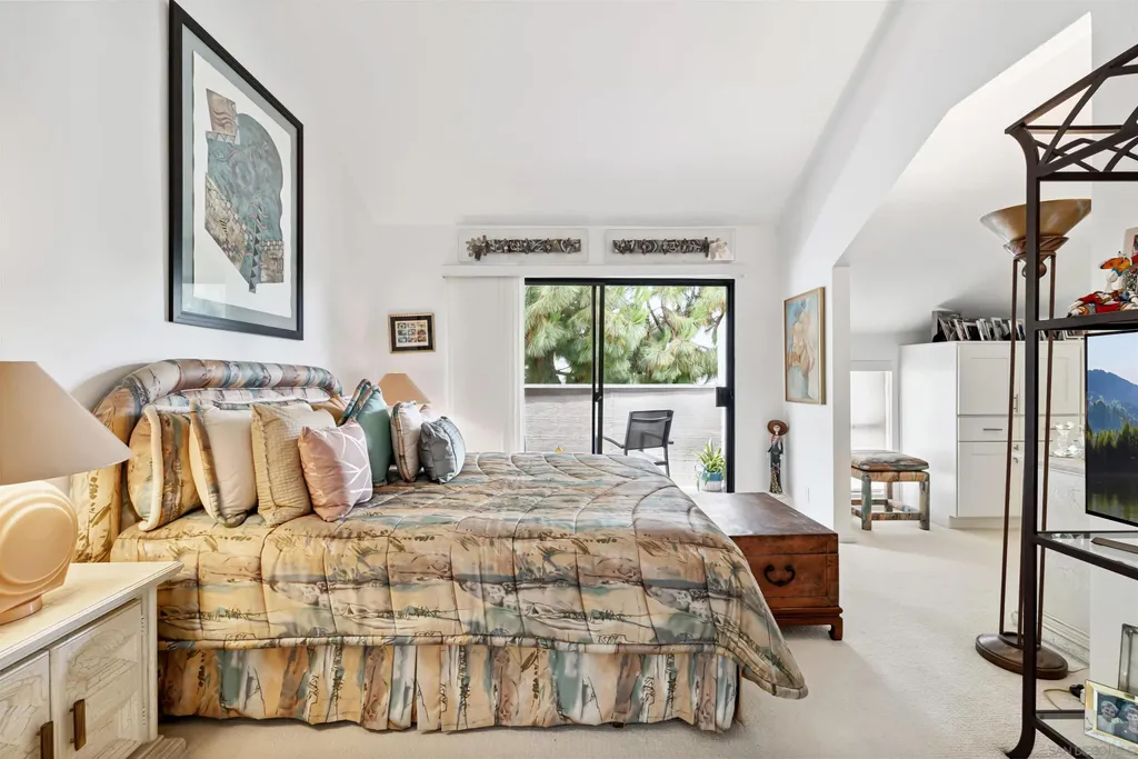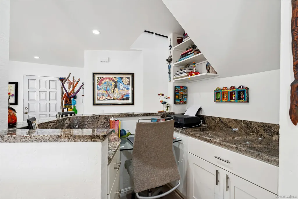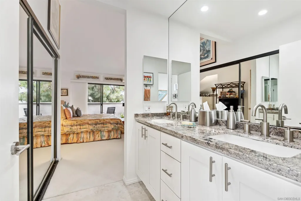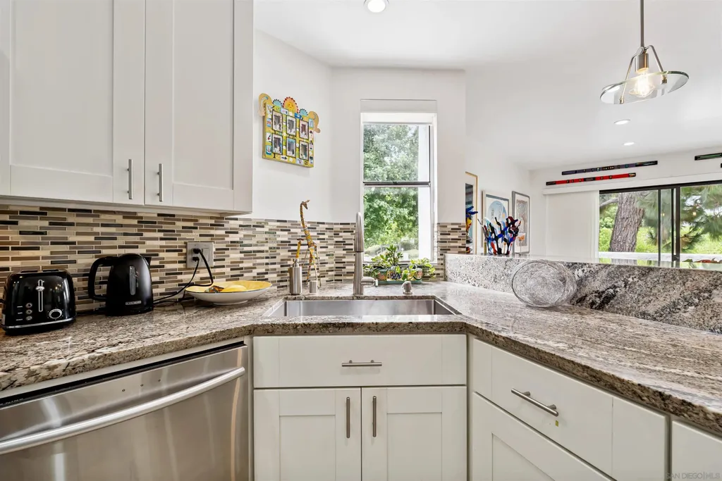 Welcome to this completely remodeled Plan 5 townhome in La Jolla's sought-after Woodlands West II. Nestled in a peaceful, park-like setting, this light-filled end unit exudes contemporary comfort with white shaker cabinetry, travertine flooring, recessed lighting, efficient electric convection wall heaters, and Hunter Douglas window treatments. A convenient built-in desk area is tucked beside the chef's kitchen, featuring granite countertops and stainless-steel appliances. Vaulted ceilings grace the spacious primary bedroom, which also includes an enclosed loft - adding approx. 30 sq. ft. for use as a dressing area, office, or nursery - complete with a custom cabinet. The en suite bath offers a dual sink vanity. Thoughtful storage includes mirrored closet doors in both bedrooms, a hallway linen closet, and generous cabinetry in the oversized 2.5-car attached garage, which also includes a washer/dryer. Two decks - one off the living and dining areas, and another off the primary suite - provide ideal spots to relax or entertain. Whether hosting or unwinding, take advantage of the tranquil outdoor spaces for dining, relaxing, or soaking in the coastal air. Community amenities include a pool, spa, tennis courts, BBQ area, and gazebo. With easy access to freeways, UCSD, UTC, local beaches, and top dining spots - not to mention ample guest parking - this home offers the perfect blend of livability and location.