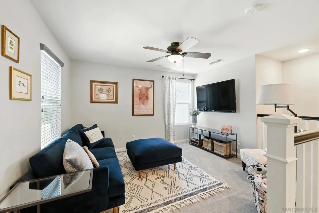 Welcome to this beautiful, spacious home on the West side of Santee! Offering 2100 sq. ft. of thoughtfully designed living space, this 3-bedroom, 2.5 bathroom residence blends comfort and modern convenience. Downstairs features an open concept layout with modern flooring throughout creating a seamless flow between the living, dining, and kitchen areas; perfect for both everyday living and entertaining. Upstairs, you'll find a generous primary suite featuring two closets, along with a versatile loft, and a spacious laundry room for added ease. The home is equipped with a gas range, modern appliances, a tankless water heater, 2 zoned ac system, and paid solar panels to keep energy costs in check. The epoxy-coated garage floor adds a sleek, durable finish, while the backyard is set up perfectly for entertaining with low-maintenance turf. Nestled in a quiet, well-kept neighborhood, this home offers both functionality and style - ideal for relaxed living and hosting family and friends.