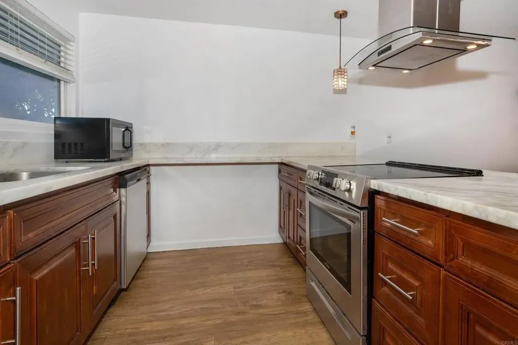 This stylishly updated condo offers modern living in the heart of San Carlos. The kitchen features walnut cabinets, marble countertops, stainless steel appliances, and a sleek range hood. Laminate flooring runs throughout the home, with durable vinyl floors in the bathroom. Both bedrooms have ceiling fans for year-round comfort. The living room boasts recessed can lighting on dimmers, perfect for creating the right ambiance. The Jack-and-Jill bathroom offers a bathtub with tile, vanity, and mirrors. The primary suite features a dual-sink vanity with mirrors and space for a small washer and dryer. Newer windows and a sliding glass door make this home light and bright. Neighborhood Highlights: Located just minutes from Lake Murray Reservoir, Mission Trails Regional Park, and Cowles Mountain, youll enjoy easy access to walking and biking trails, fishing, boating, and breathtaking views. Nearby Lake Murray Community Park and San Carlos Recreation Center offer playgrounds, sports courts, and picnic areas. Shopping and dining are conveniently close, with grocery stores, cafes, and restaurants just a short drive away. The neighborhood is known for its quiet, suburban feel while still being only about 15 minutes from Downtown San Diego.