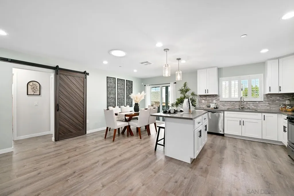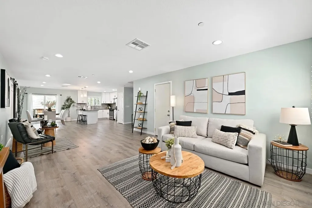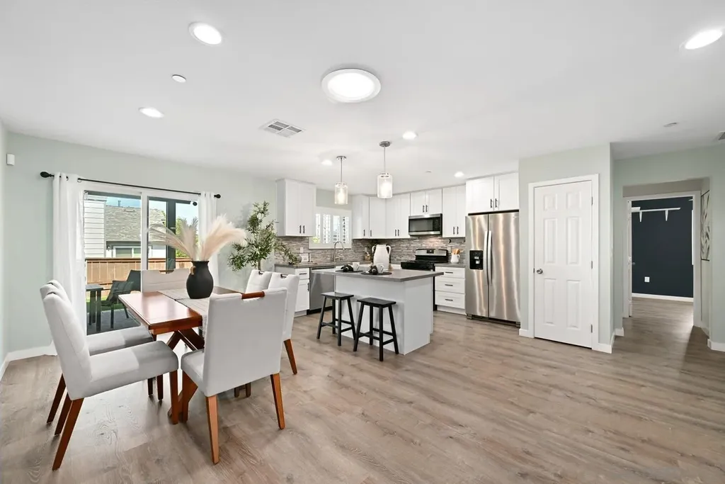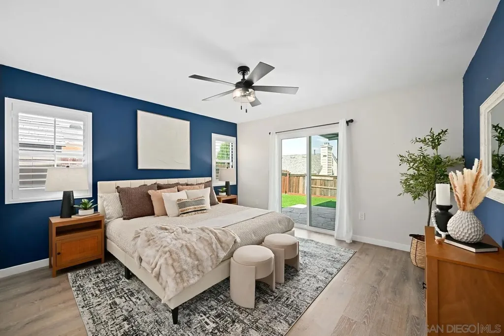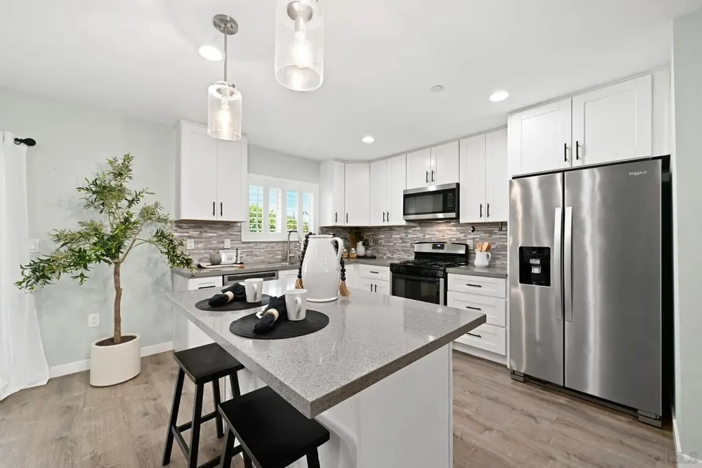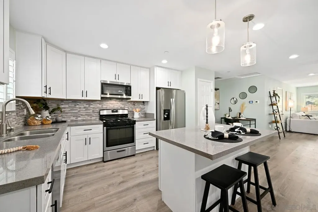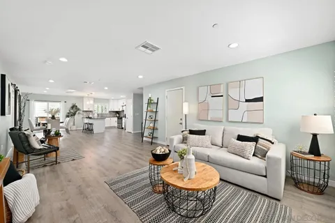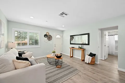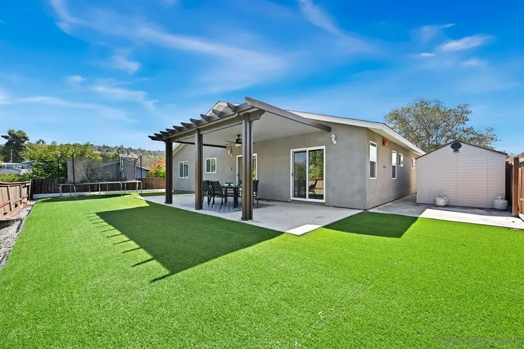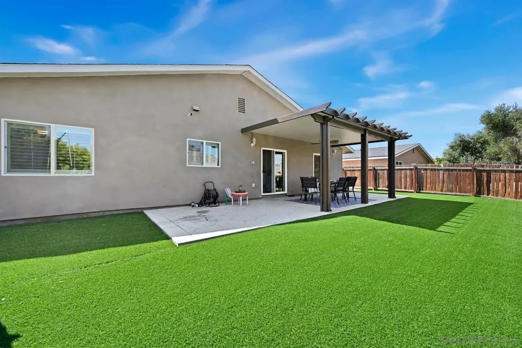 Beautiful newer construction, built in 2021, this home boasts a spacious open floor plan with wood laminate flooring throughout and elegant plantation shutters. Each bedroom is thoughtfully located in its own corner of the home, ensuring maximum privacy. Modern comforts include central heating and A/C, plus an attached 2-car garage with storage cabinets, a ceiling shelf, and electric car charging capabilities. The beautifully appointed kitchen showcases crisp white shaker-style cabinetry, a custom tile backsplash, quartz countertops, stainless steel appliances, and an island with breakfast counter seating. The spacious primary suite offers exterior patio access, ample closet space, and a private en-suite bathroom. The low-maintenance backyard features turf, stamped concrete, and a covered patio - perfect for outdoor entertaining - along with a storage shed for extra convenience. Additional highlights include RV parking and easy-care landscaping, combining functionality with style.