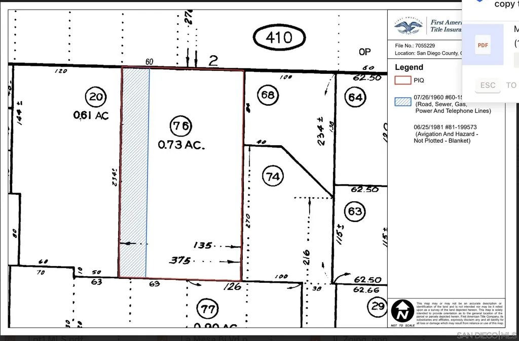 **Prime Commercial Land Opportunity in San Diego County** Discover a rare investment opportunity in San Diego County! We present two commercial parcels, each with a potential high cap rate for land development. The FAA has a preliminary approval approved for storage/equipment parking use on these vacant lots, totaling 1.34 acres. **Key Features:** - Parcel 1 (APN 384-410-76-00): 31,798 sq. ft. - Parcel 2 (APN 3385-410-20-00): 26,571 sq. ft. - FAA Preliminary Approval for Storage Use - Gillespie Field Overlay Zone - Light Industrial Zoning - Triple Net Lease Option: $8,500 for both parcels - Individual Parcel Lease Rates: $3,719 (Parcel 1) and $4,451 (Parcel 2) - Convenient Ingress and Egress on West Side (East May be Availble) **Additional Information:** - The adjacent parcel, grandfathered for two single-family residences, may be available for sale. Call the Agent for details and/or to submit an offer. - Located in the Gillespie Field Compatibility Zone, ensuring strategic development. - Check the Gillespie Community Land Use Plan (Page 32), and Gillespie Field Compatibility Plan (Pages 71-72, 107-112) for detailed zoning insights. **Sales Details:** - Total Sales Price: $1,395,000 - Acreage: 1.34 acres (58,369 sq. ft.) **Important Notes:** - No structures can be built under the Gillespie Community Land Use Plan and avigation easement on this particular property. - Verify all information with the FAA, the County of San Diego, and the city of Santee for approvals.